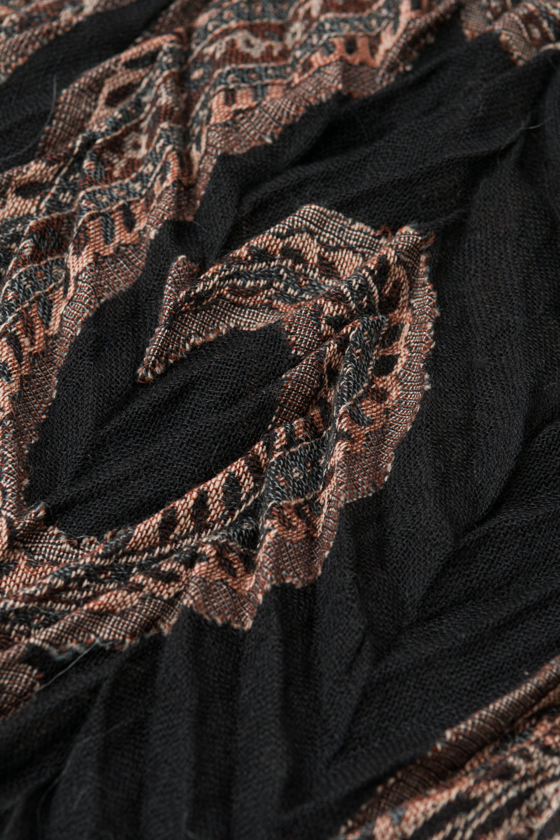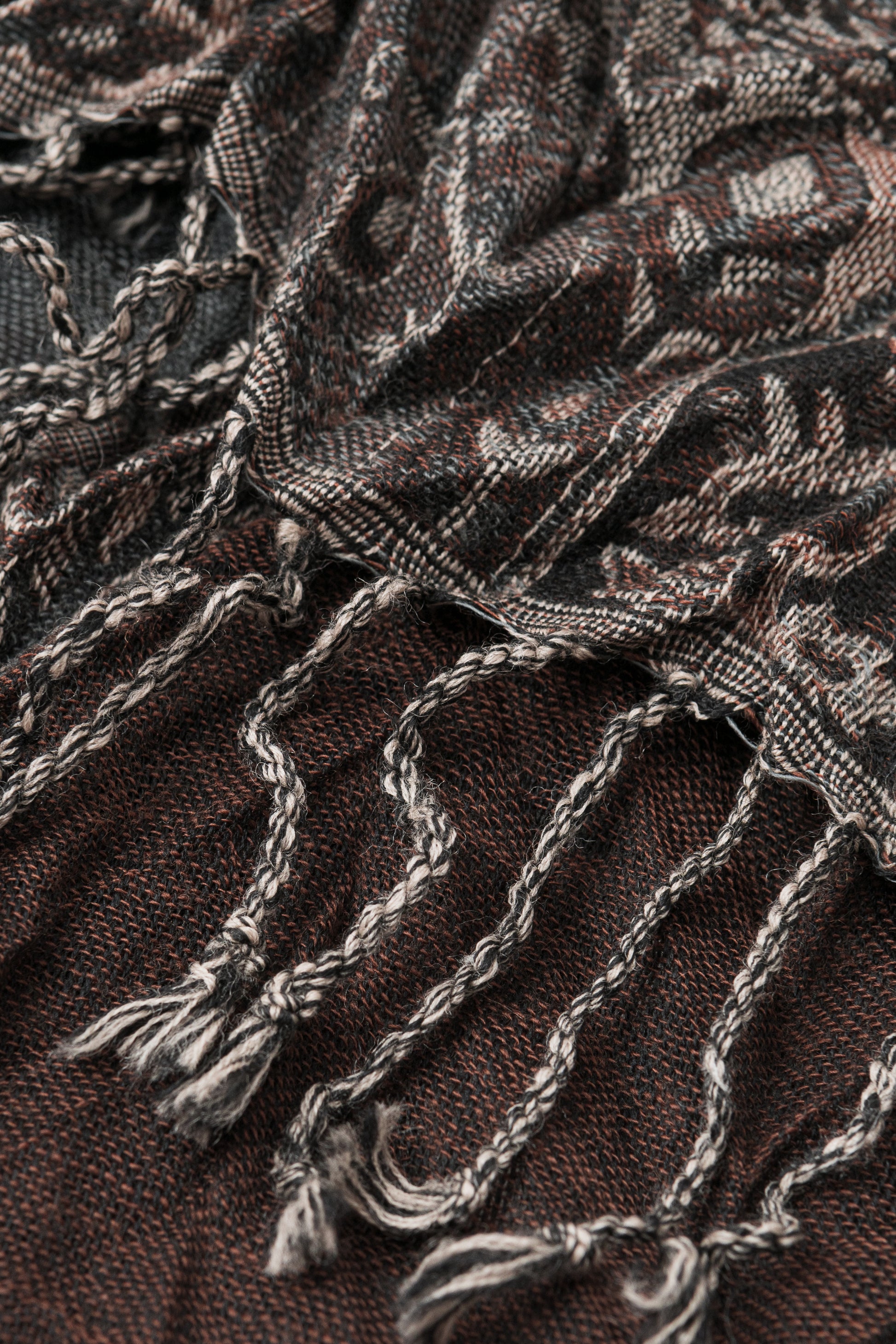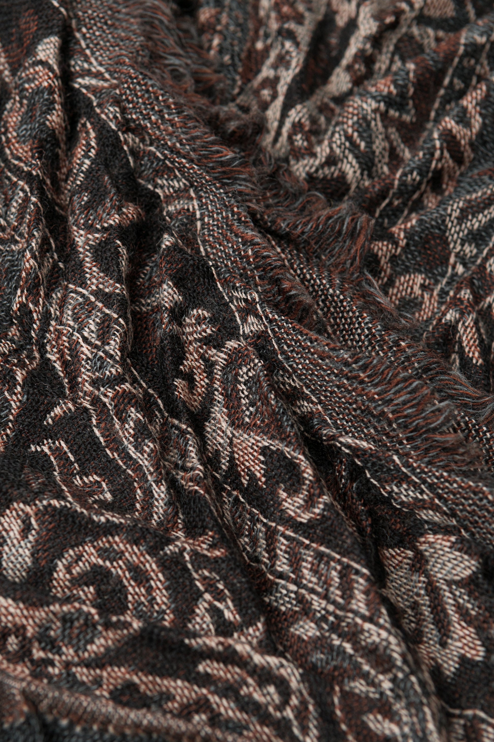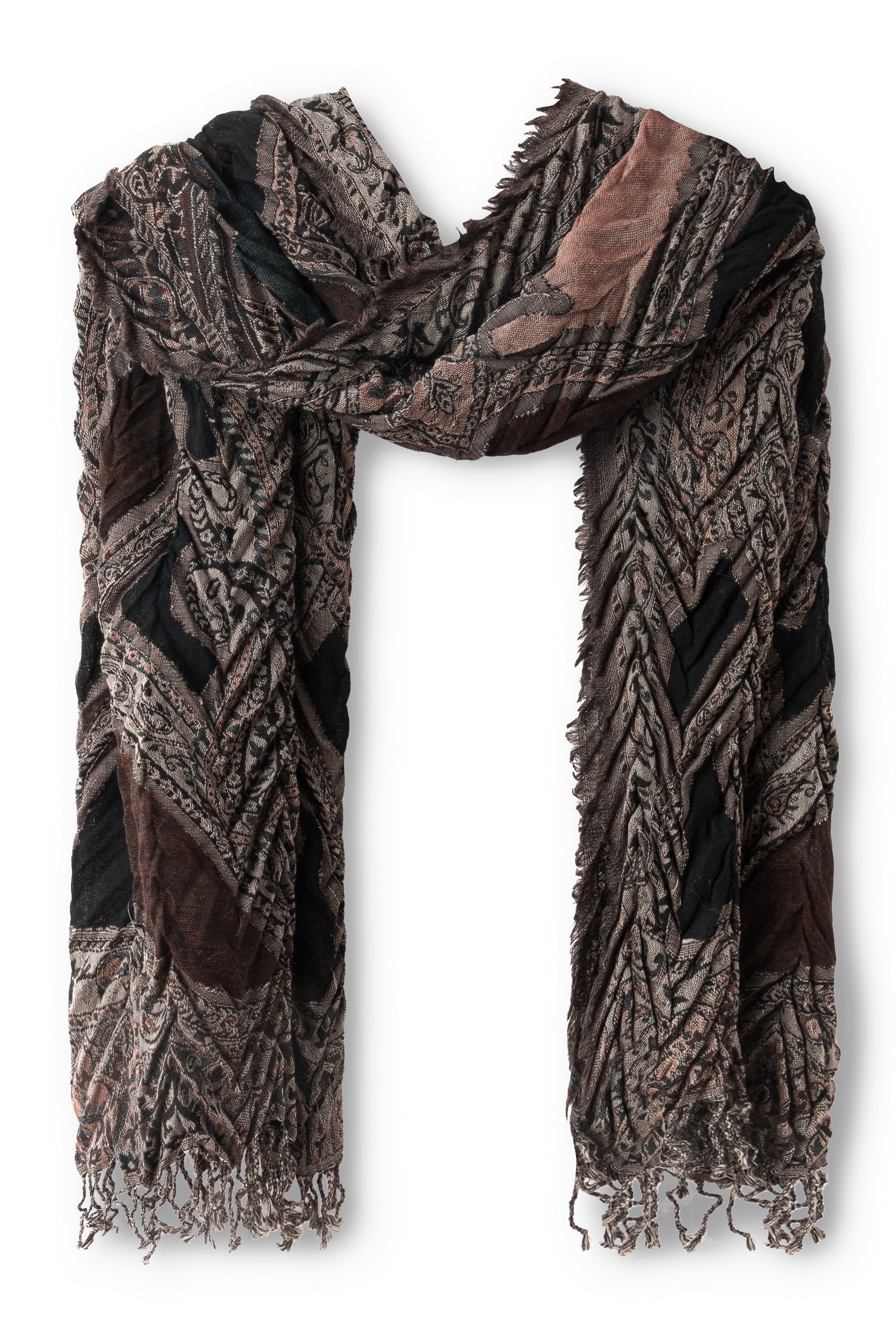 Sign up for our newsletter and get a 10% discount on your purchasesScarf with an extremely fashionable pleating effect, in brown and black colors, woven with traditional Indian motifs, 100% wool