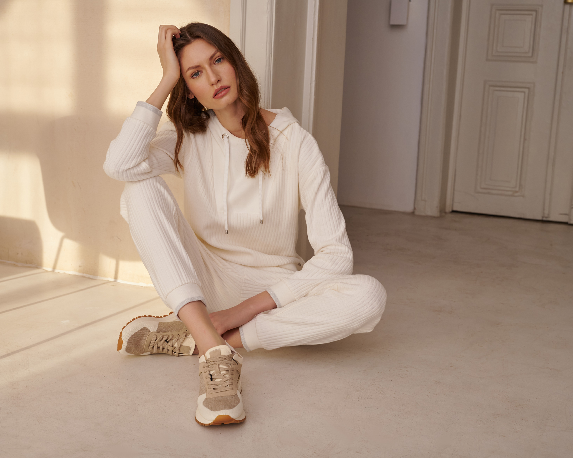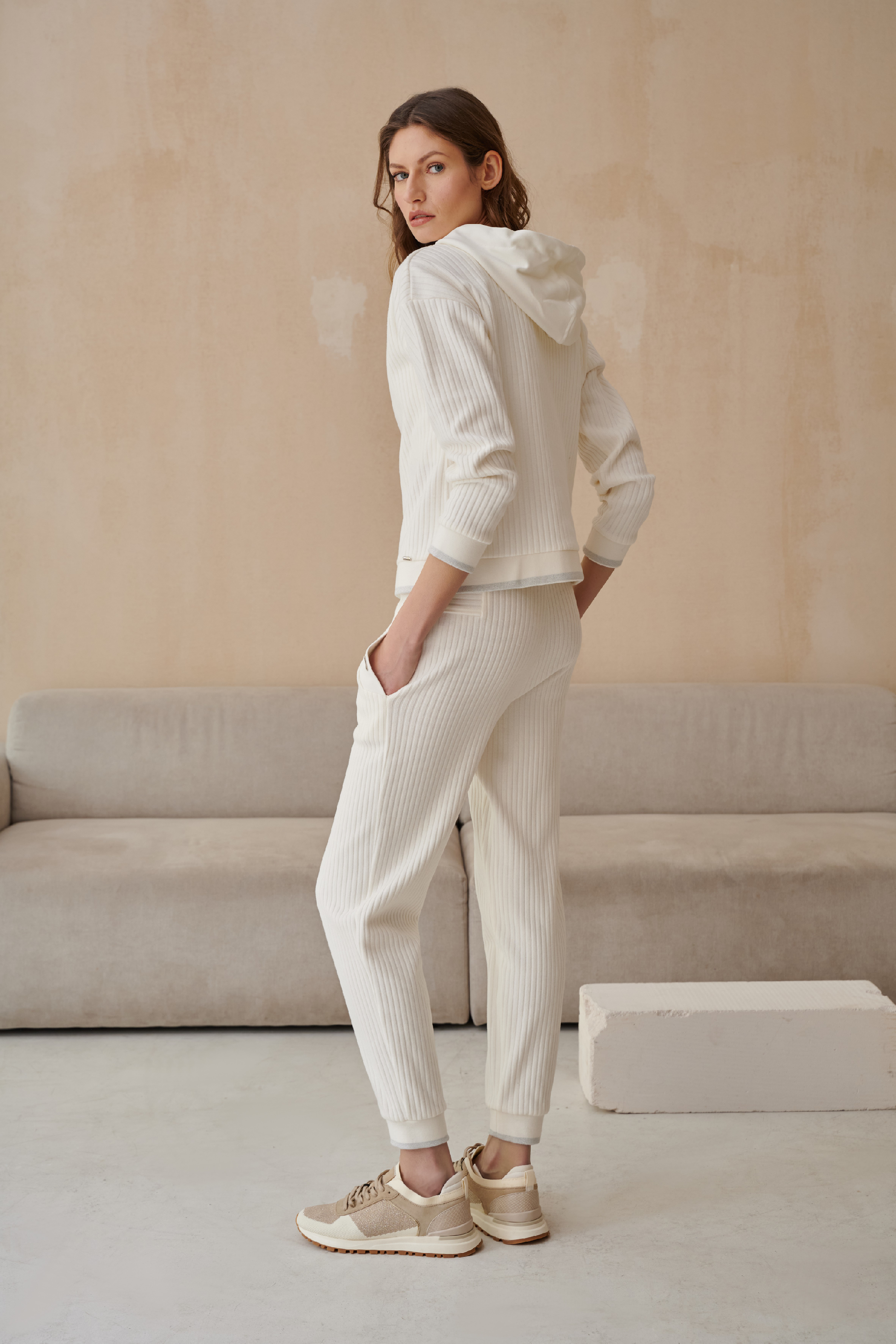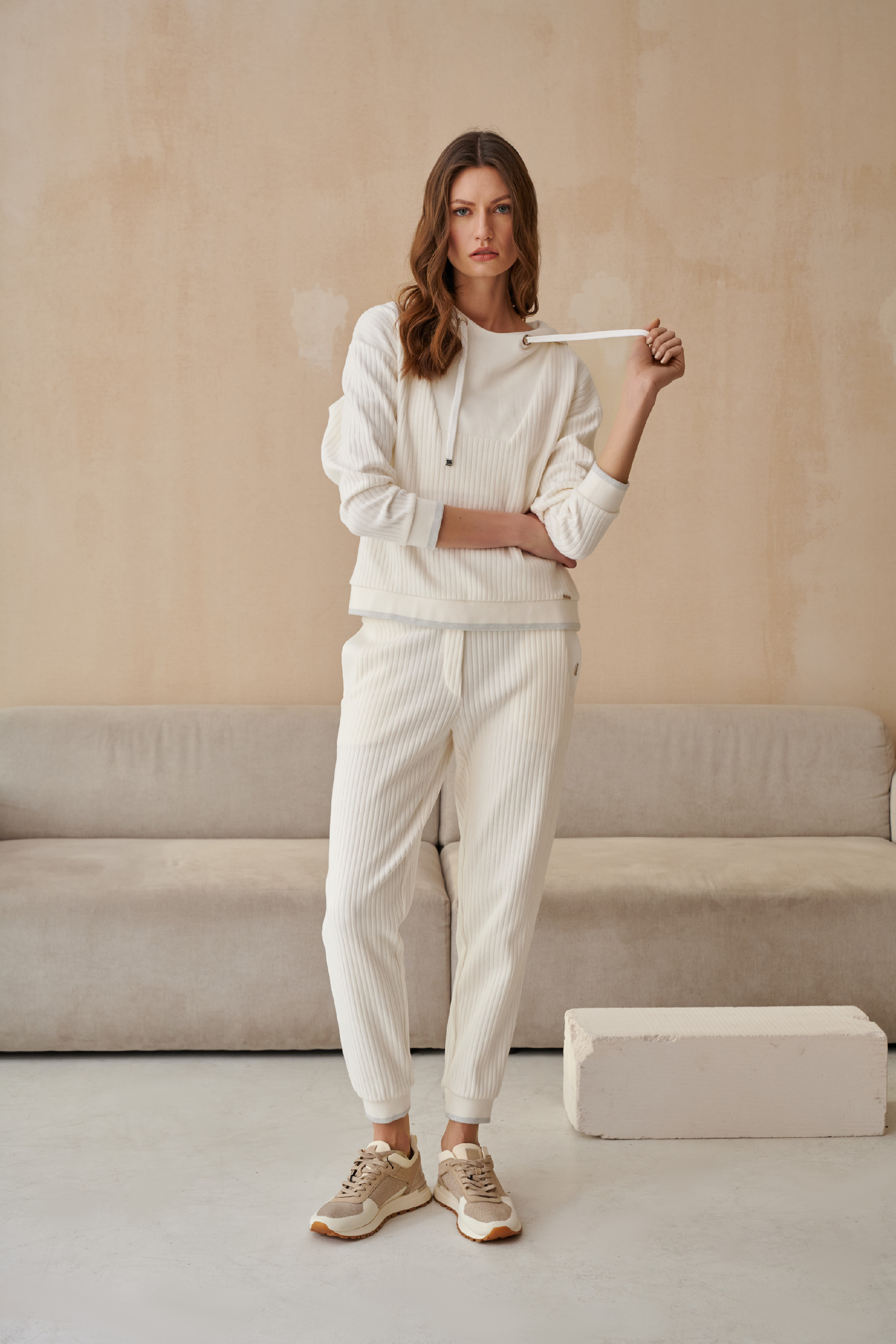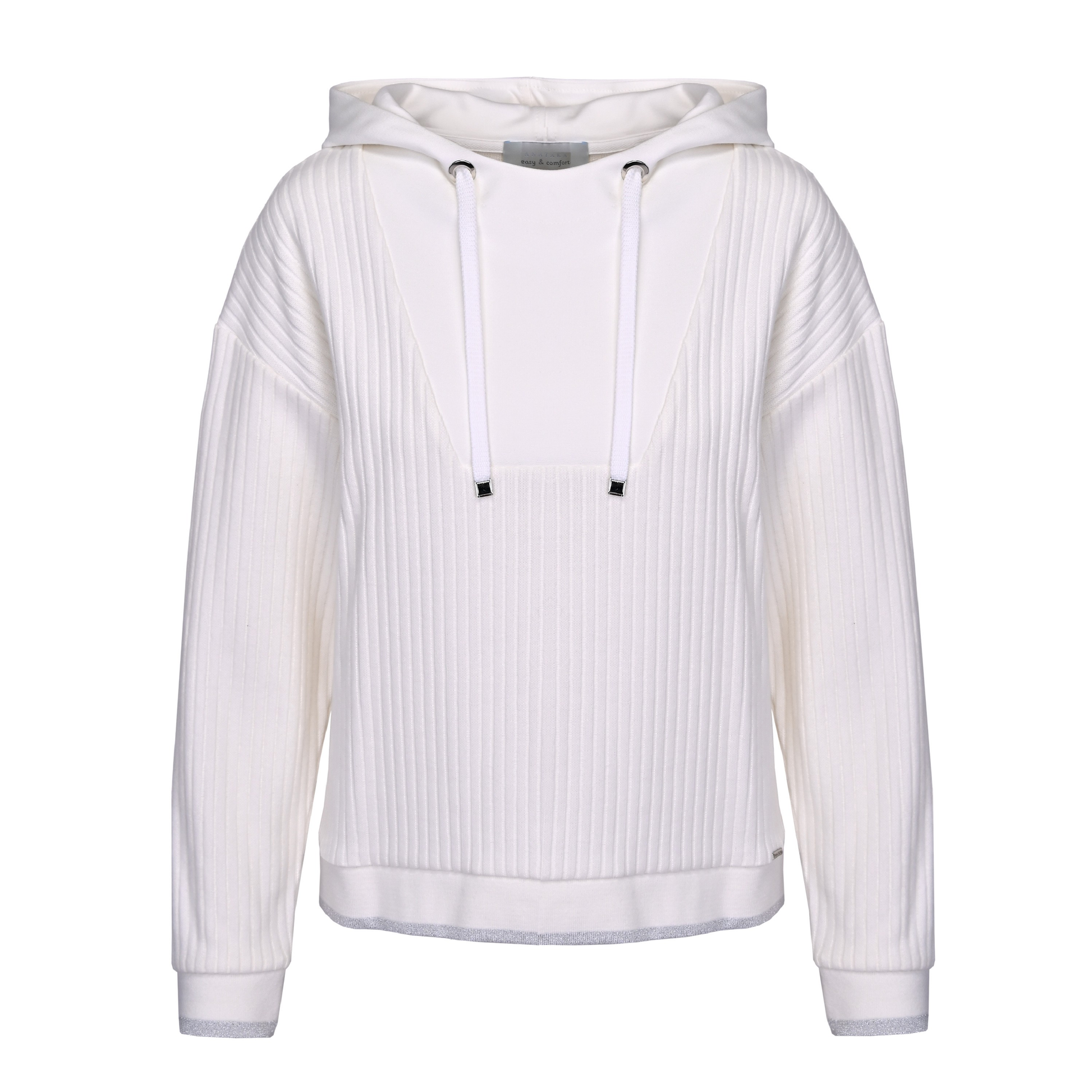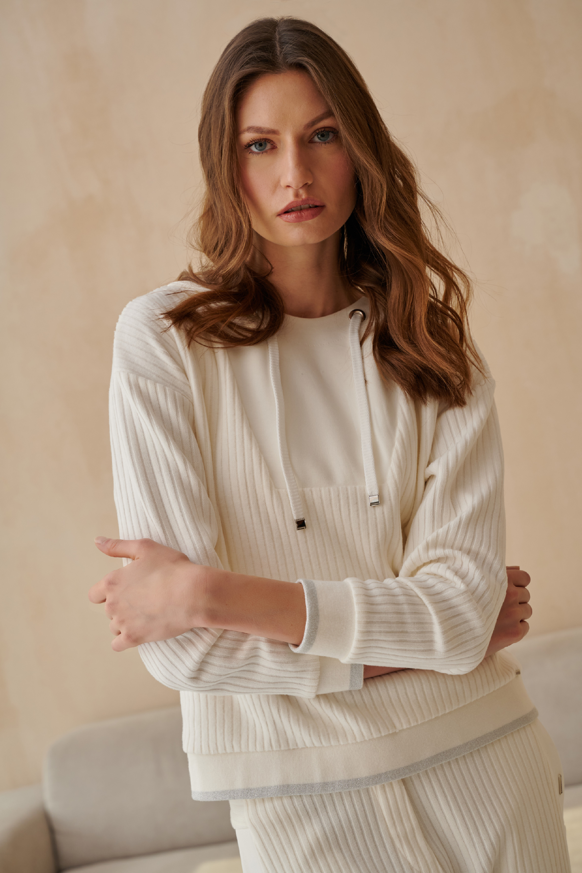 Sign up for our newsletter and get a 10% discount on your purchasesSports sweatshirt made of high-quality cotton knit fabric in creamy white. The simple form is broken by a trapezoidal insert made of a different fabric, which transforms into a hood with a drawstring. The character of the sweatshirt is emphasized by details - silver fittings and cuffs with the addition of subtly shimmering silver.