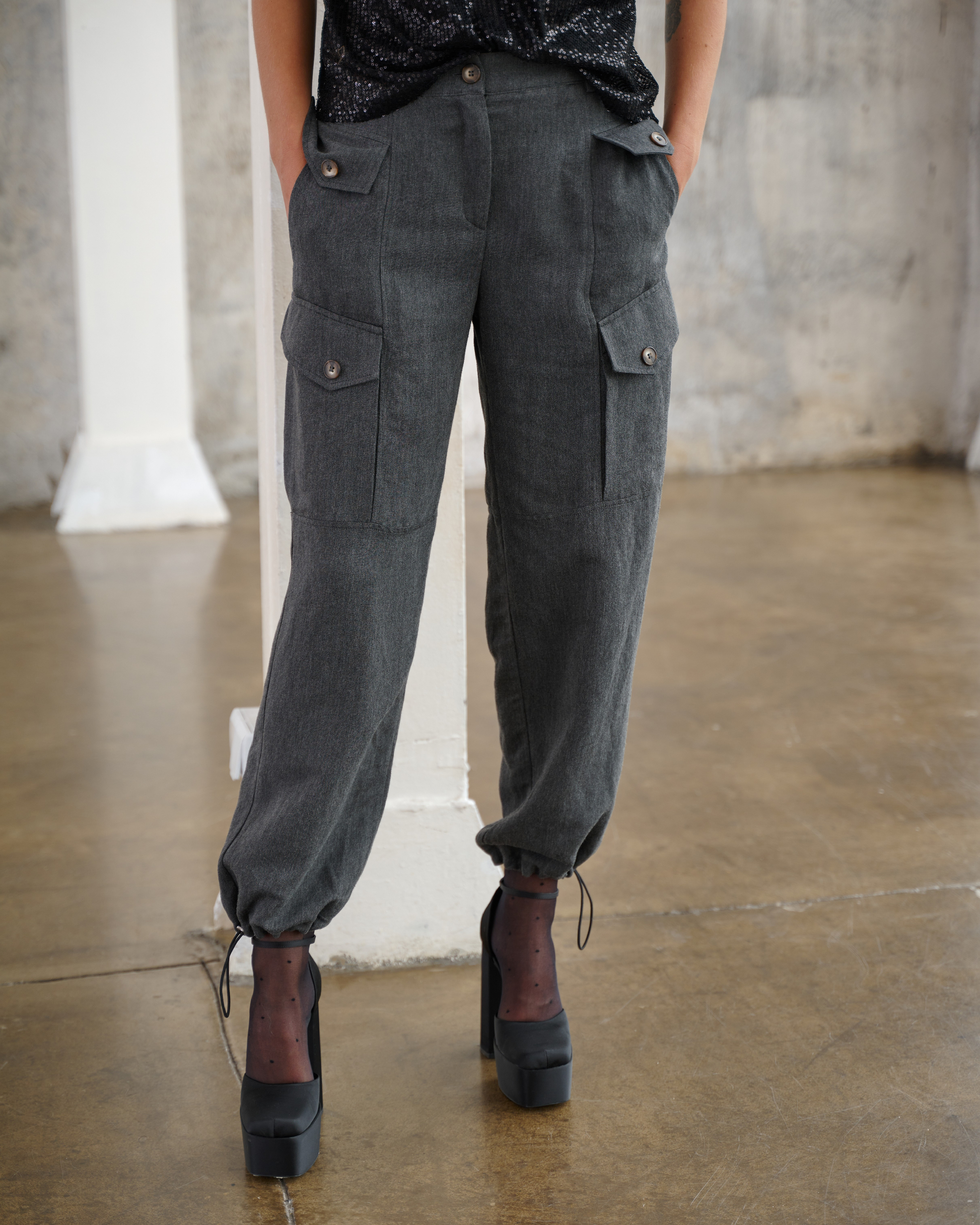 Sign up for our newsletter and get a 10% discount on your purchases Modern cargo pants in graphite marengo. The wide, free legs are equipped with four stylish pockets with asymmetric flaps decorated with buttons. The bottom of the trouser leg is gathered by an elastic band that allows for various forms of wrinkling. The back with a sewn-in yoke makes the pants fit neatly.