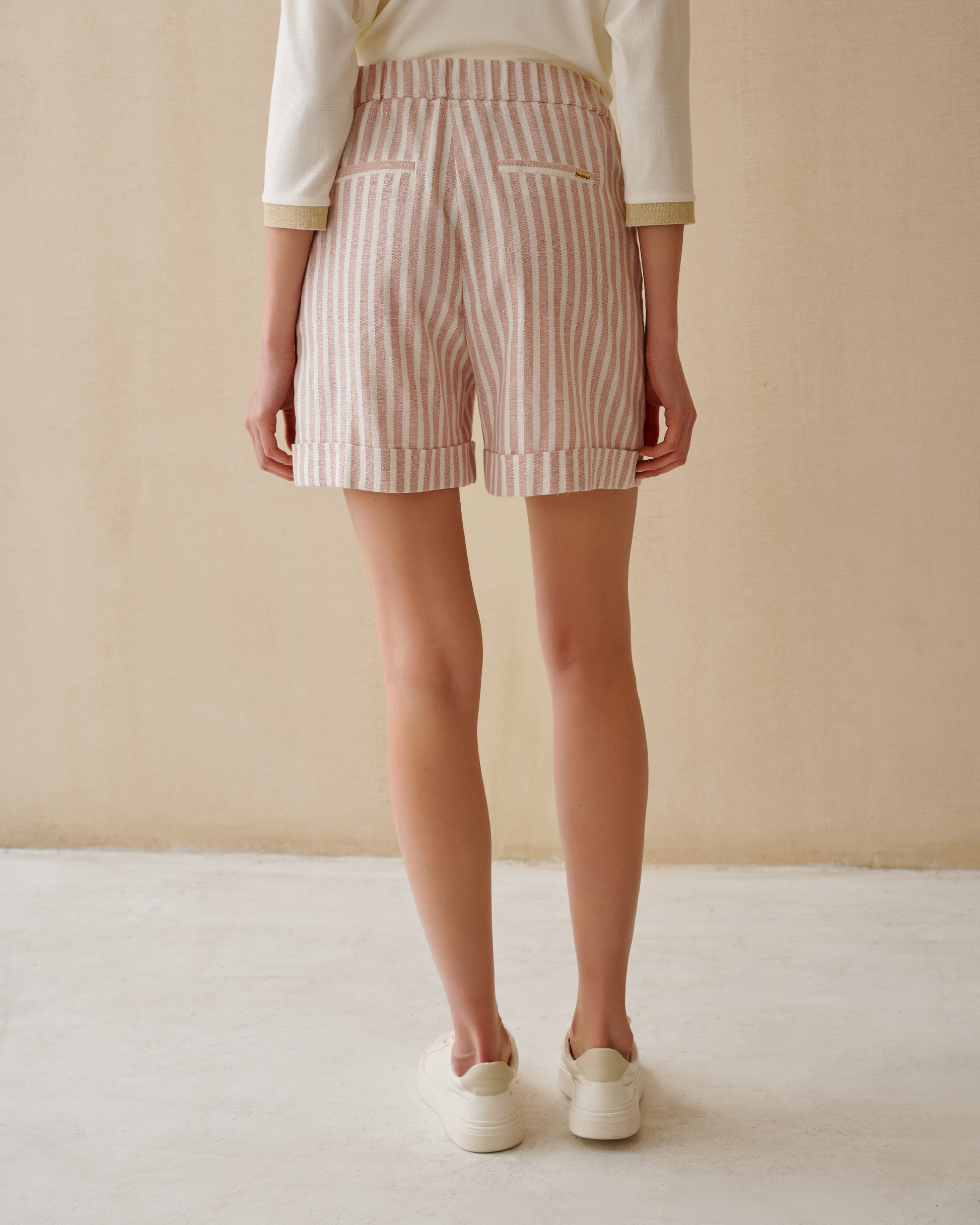 Sign up for our newsletter and get a 10% discount on your purchases SUMMER MUST HAVE - amazing shorts with white and pink stripes with a subtle gold thread. Made of a light and breathable combination of viscose and linen. They are distinguished by interesting details - a wide cuff, a subtle buckle with a closet allowing for adjustment at the waist and comfortable side pockets.