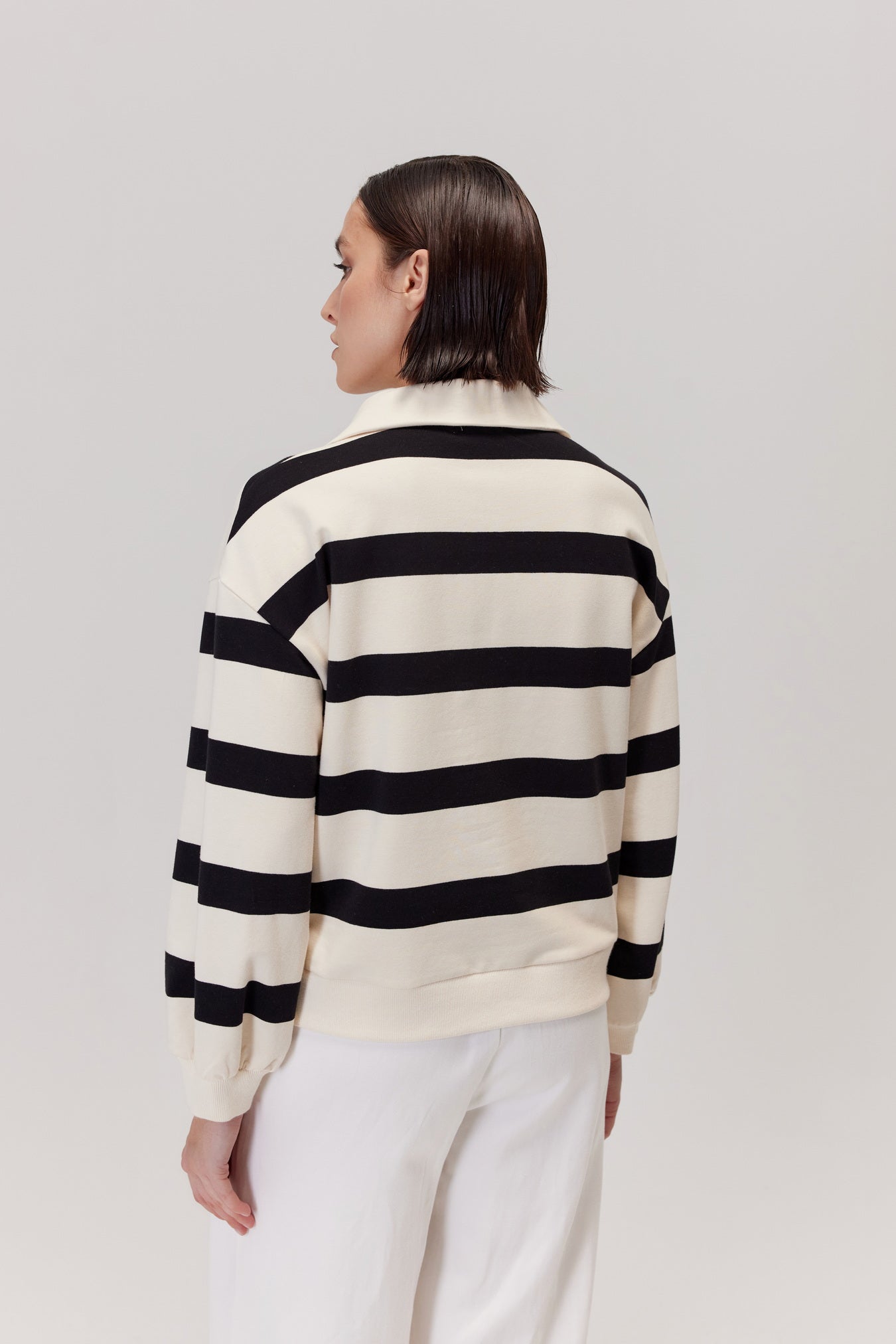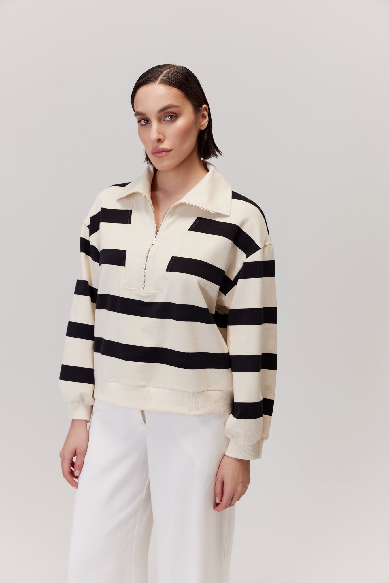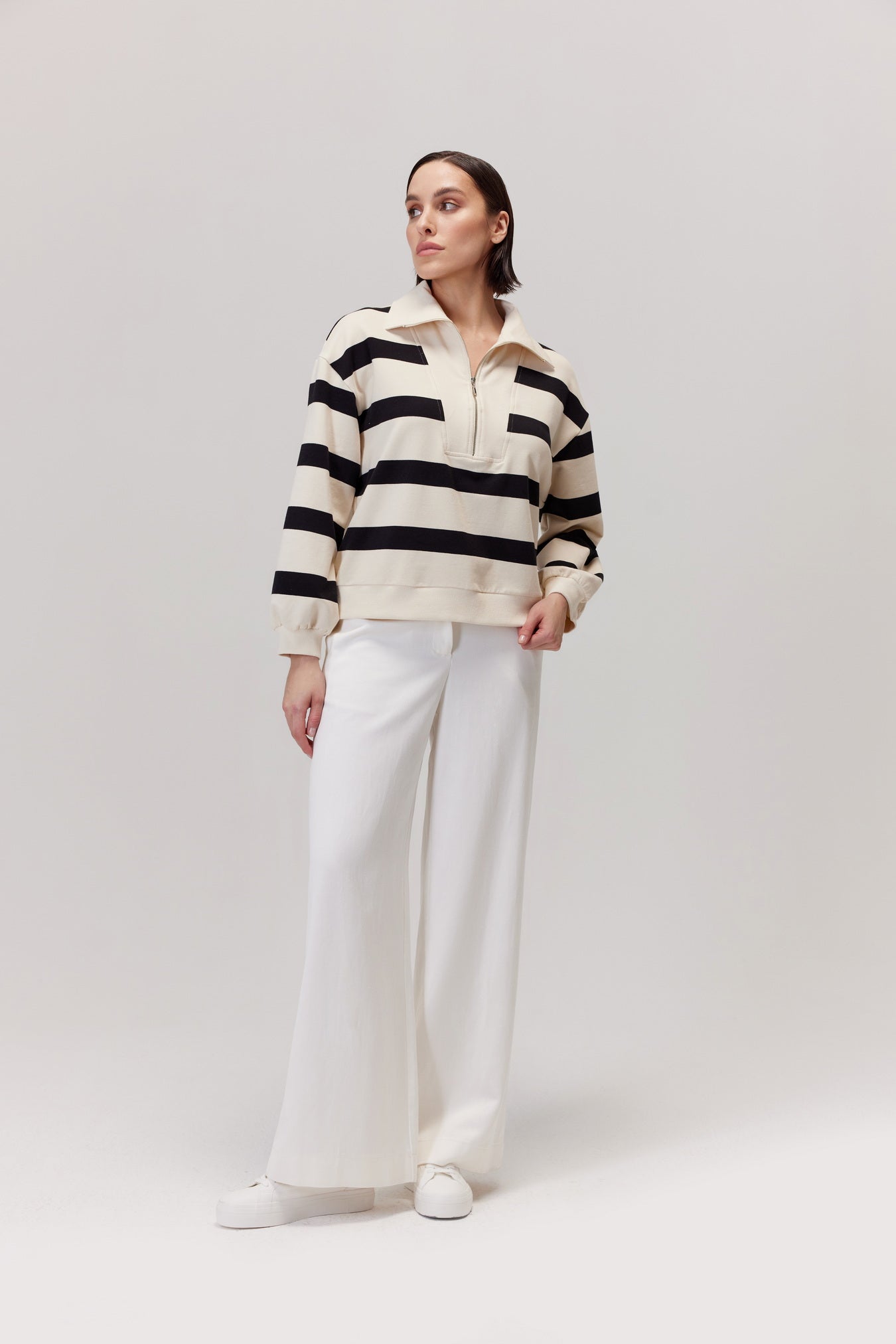 - Wzór: szerokie, poziome pasy w kolorze ecru i głębokiej czerni;
