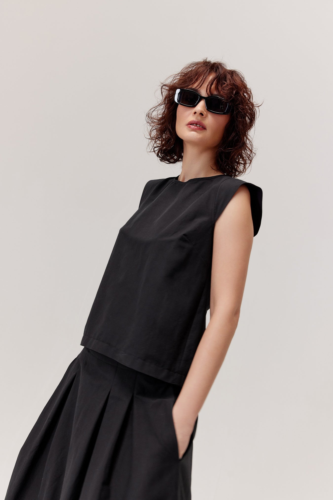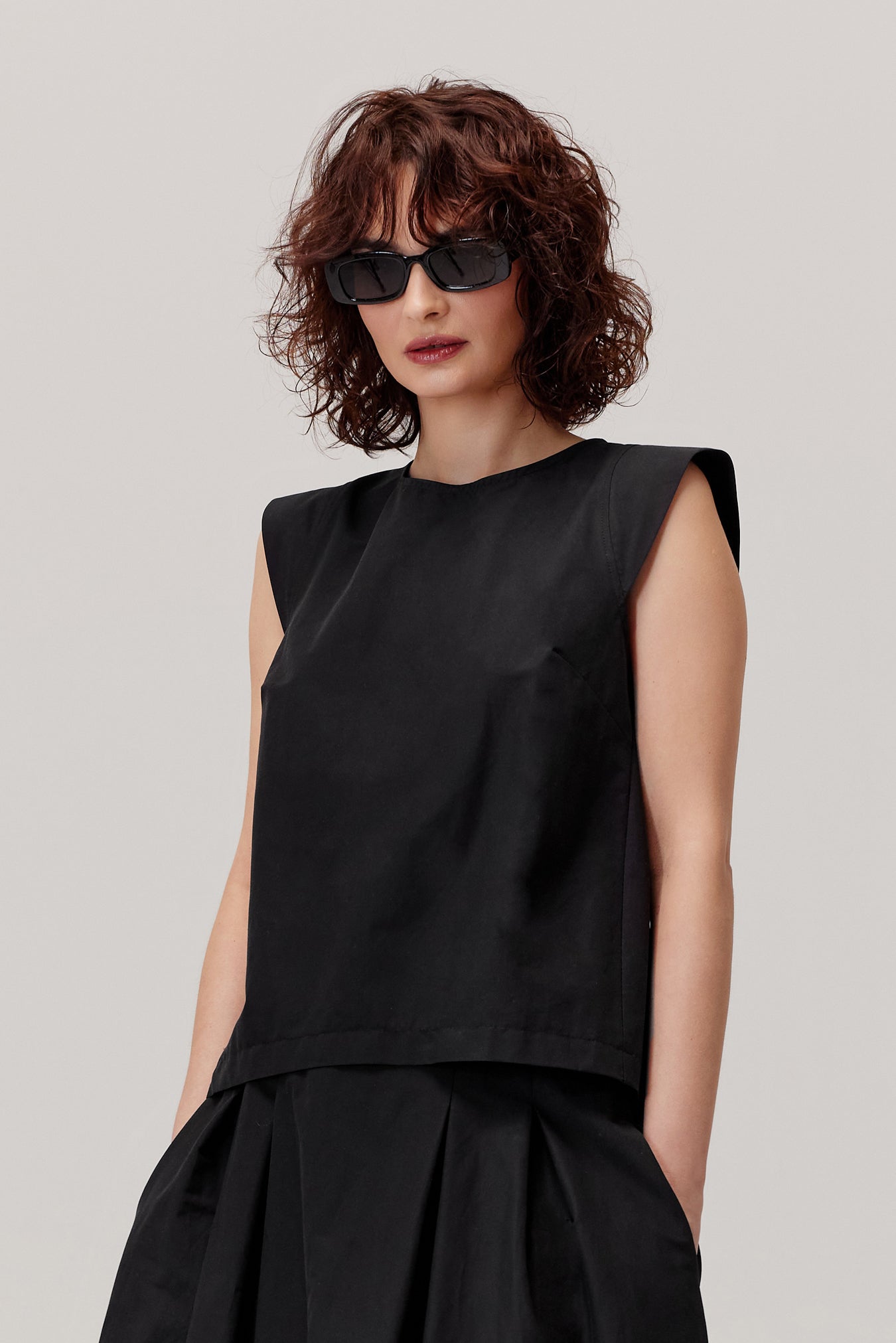 - „Boxy top” – czyli bluzka o krótkim, prostokątnym kroju, luźno opadająca, bez wcięcia w talii;