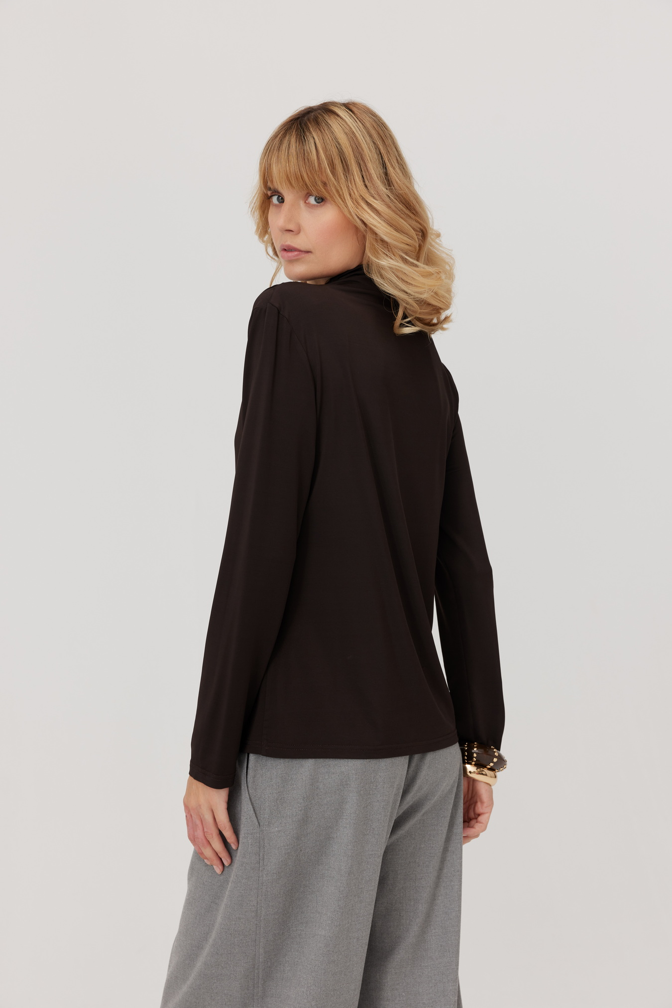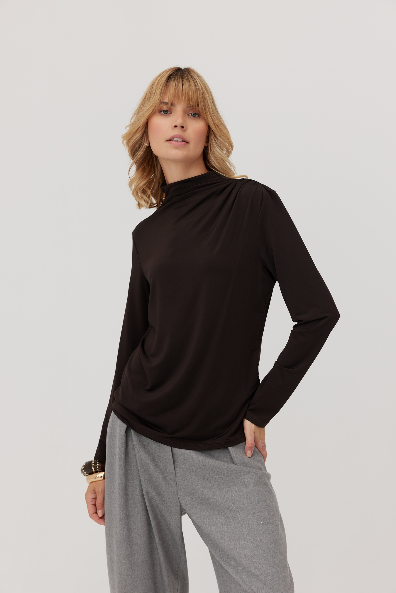 Sign up for our newsletter and get a 10% discount on your purchasesBluzka Jett z półgolfem i marszczeniami to nowoczesna propozycja na sezon jesienny. Minimalistyczny półgolf oraz subtelne marszczenia na ramieniu nadają jej kobiecego looku. Długie dopasowane rękawy zostały zaprojektowane z myślą o komforcie i modnym wyglądzie. Miękka, elastyczna, wiskozowa dzianina subtelnie otula ciało. Bluzkę z łatwością zestawisz ze spodniami lub spódnicą z naszej kolekcji. Doskonały wybór zarówno na co dzień, jak i do biura.