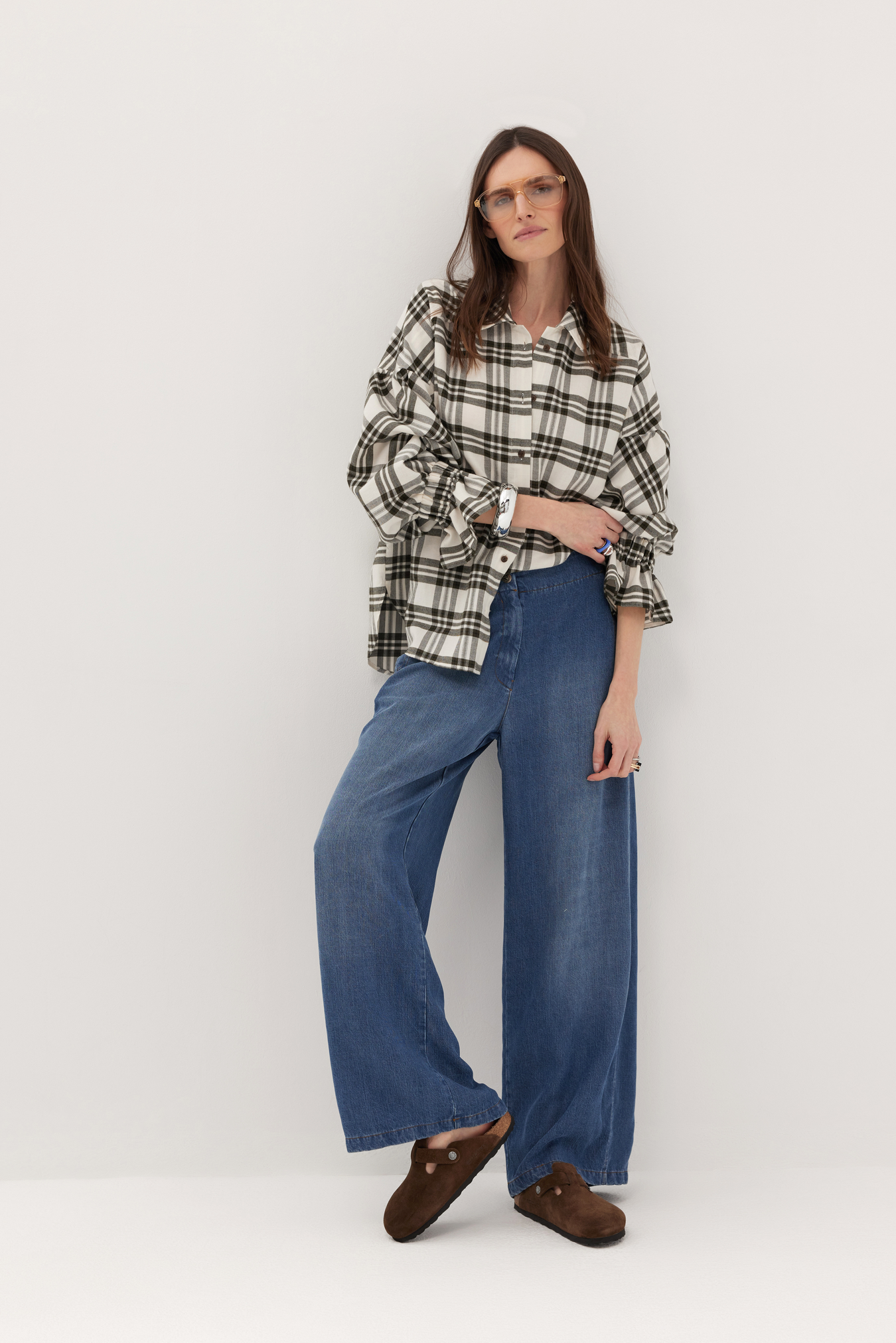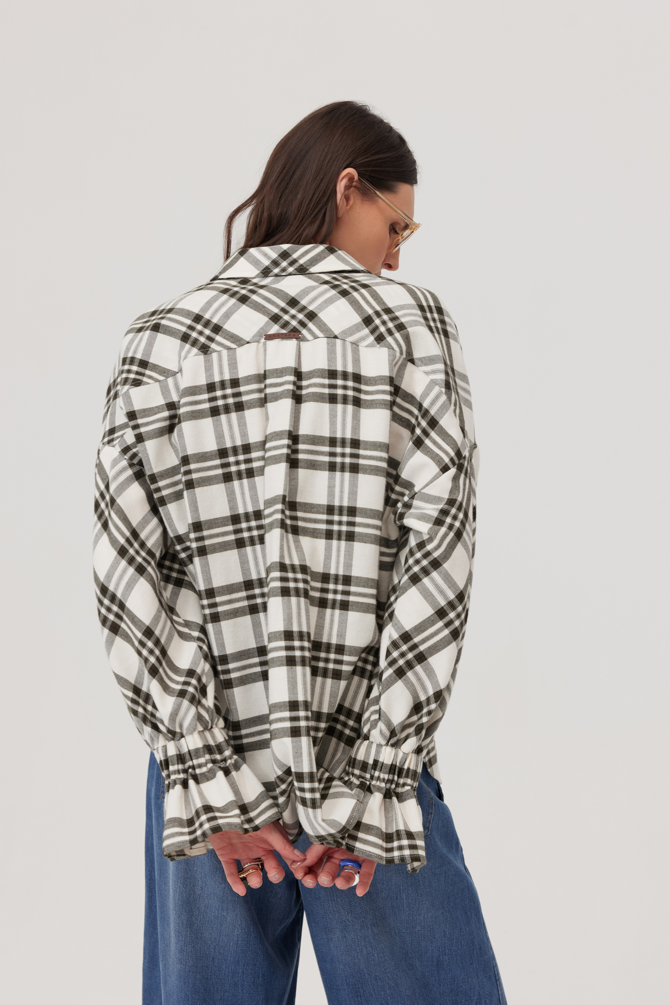 Najmocniejszym elementem są rękawy – długie i obszerne, miękko układające się na ramionach, a przy nadgarstkach zebrane gumą i wykończone falbaną. Dzięki temu koszula zyskuje wyraźny, kobiecy charakter i wyróżnia się na tle klasycznych modeli w kratę.