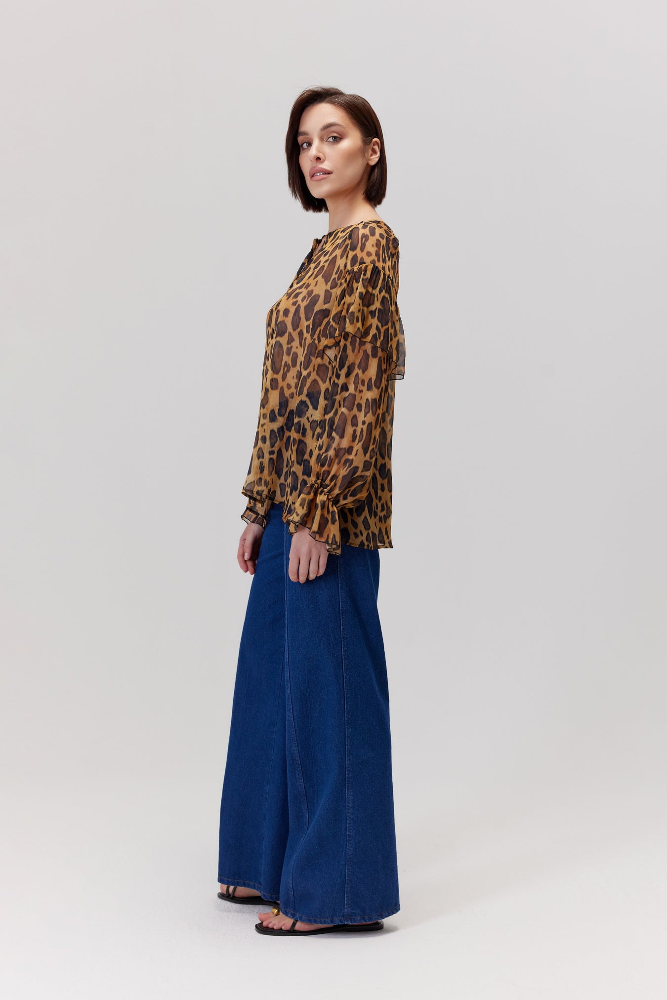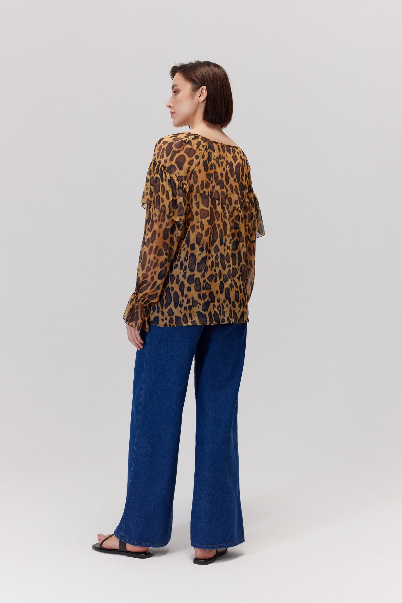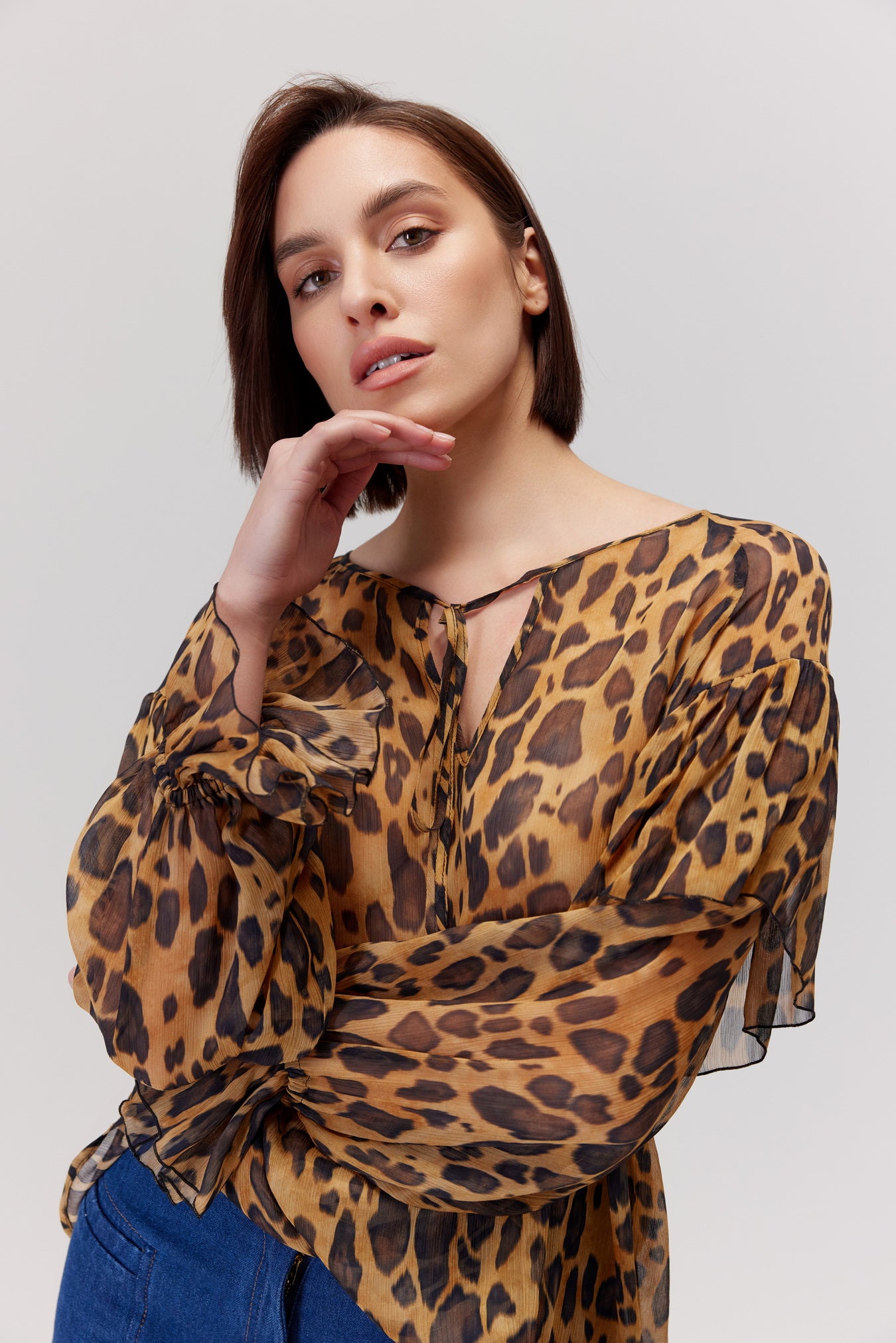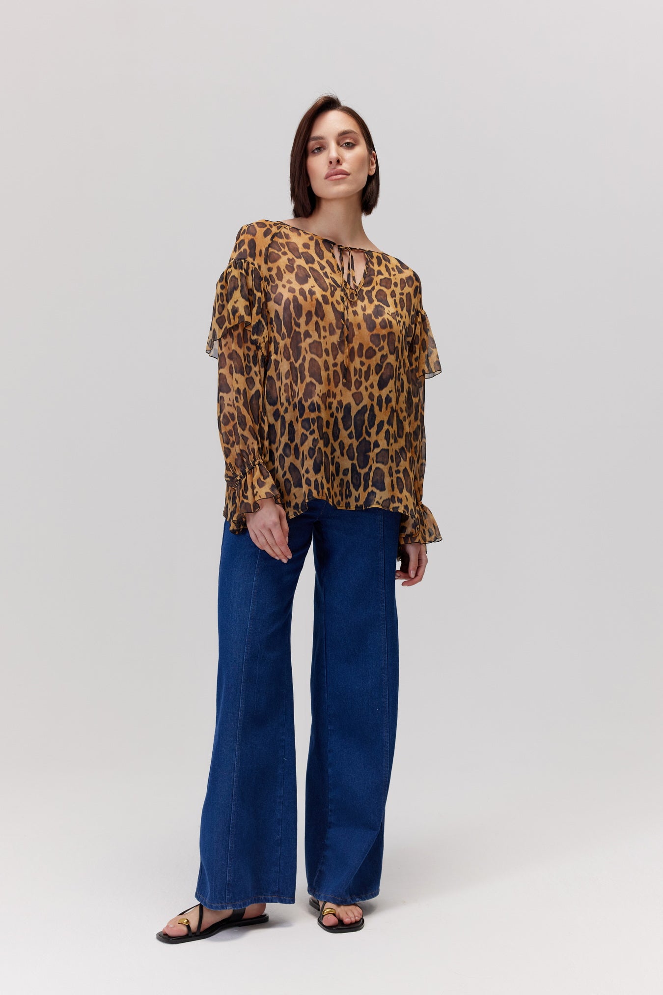 - Bluzka Tavia to połączenie lekkiej, szlachetnej wiskozy z dynamicznym wzorem panterki, idealnie wpisującym się w nowoczesny casual.