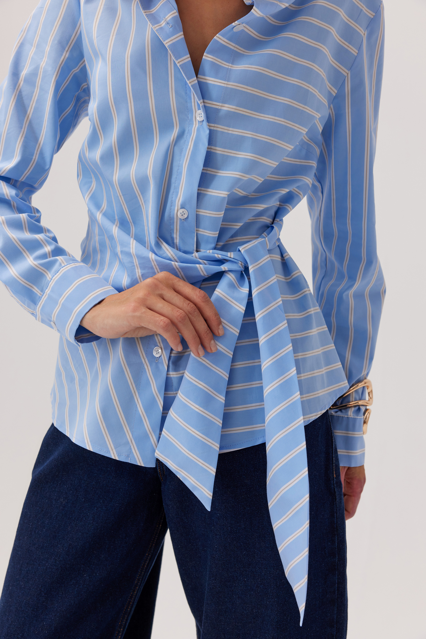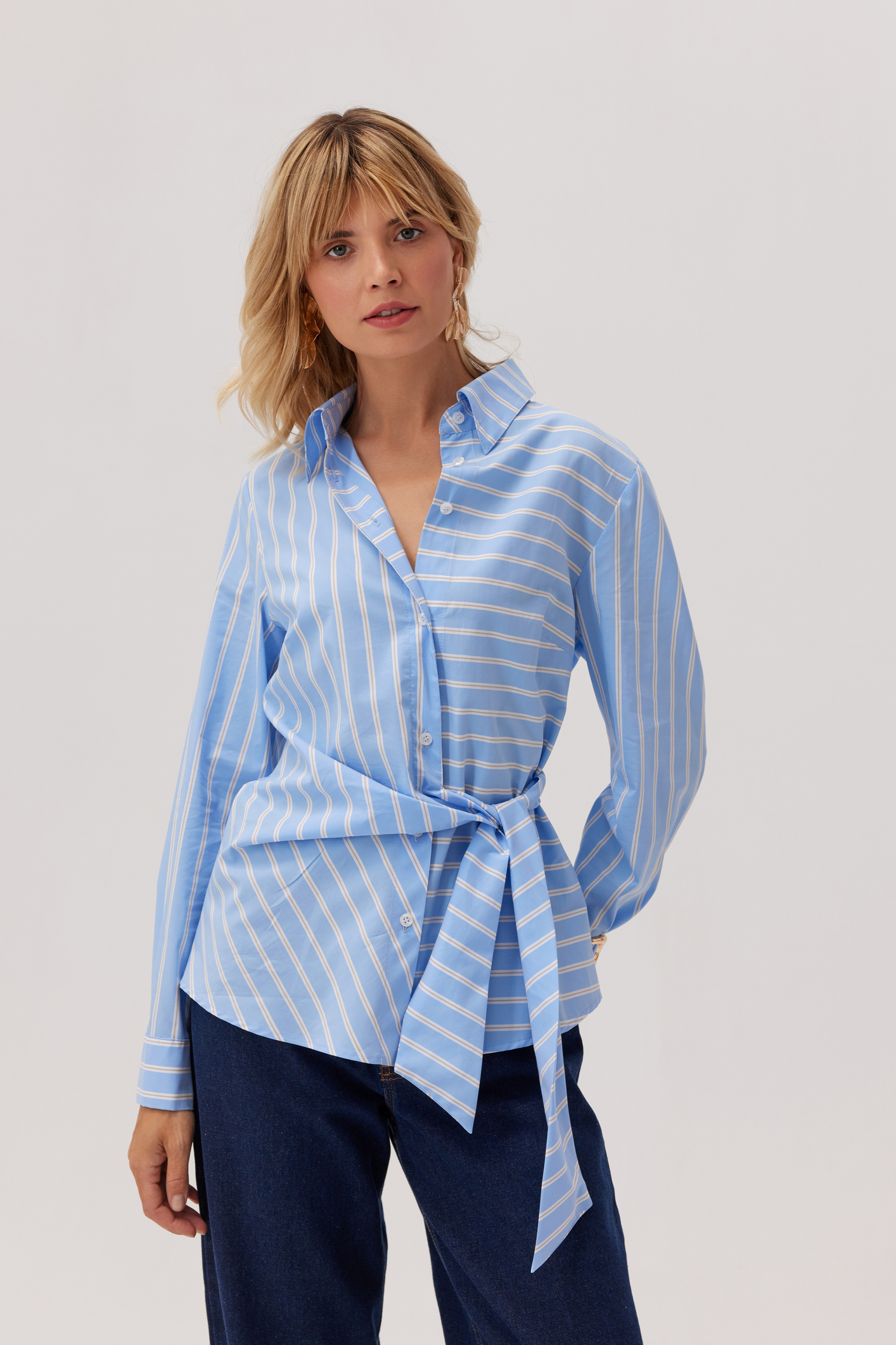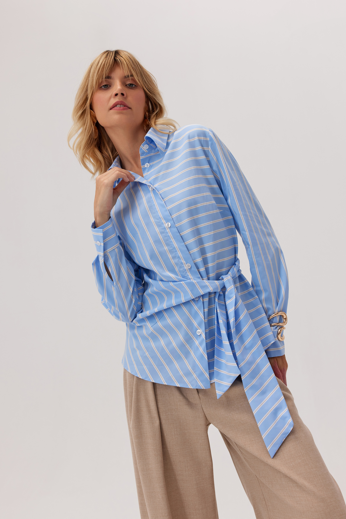 Sign up for our newsletter and get a 10% discount on your purchasesElegancka koszula damska w paski o lekko dopasowanym kroju, uszyta z wysokiej jakości popeliny z dodatkiem elastanu. Materiał ten zapewnia nie tylko elegancki wygląd, ale także wysoki komfort noszenia i swobodę ruchów. Fantazyjne wiązanie z boku w talii podkreśla sylwetkę i tworzy efektowne fałdy z przodu, nadając koszuli unikalny charakter. Idealna zarówno do biura, jak i na mniej formalne okazje.