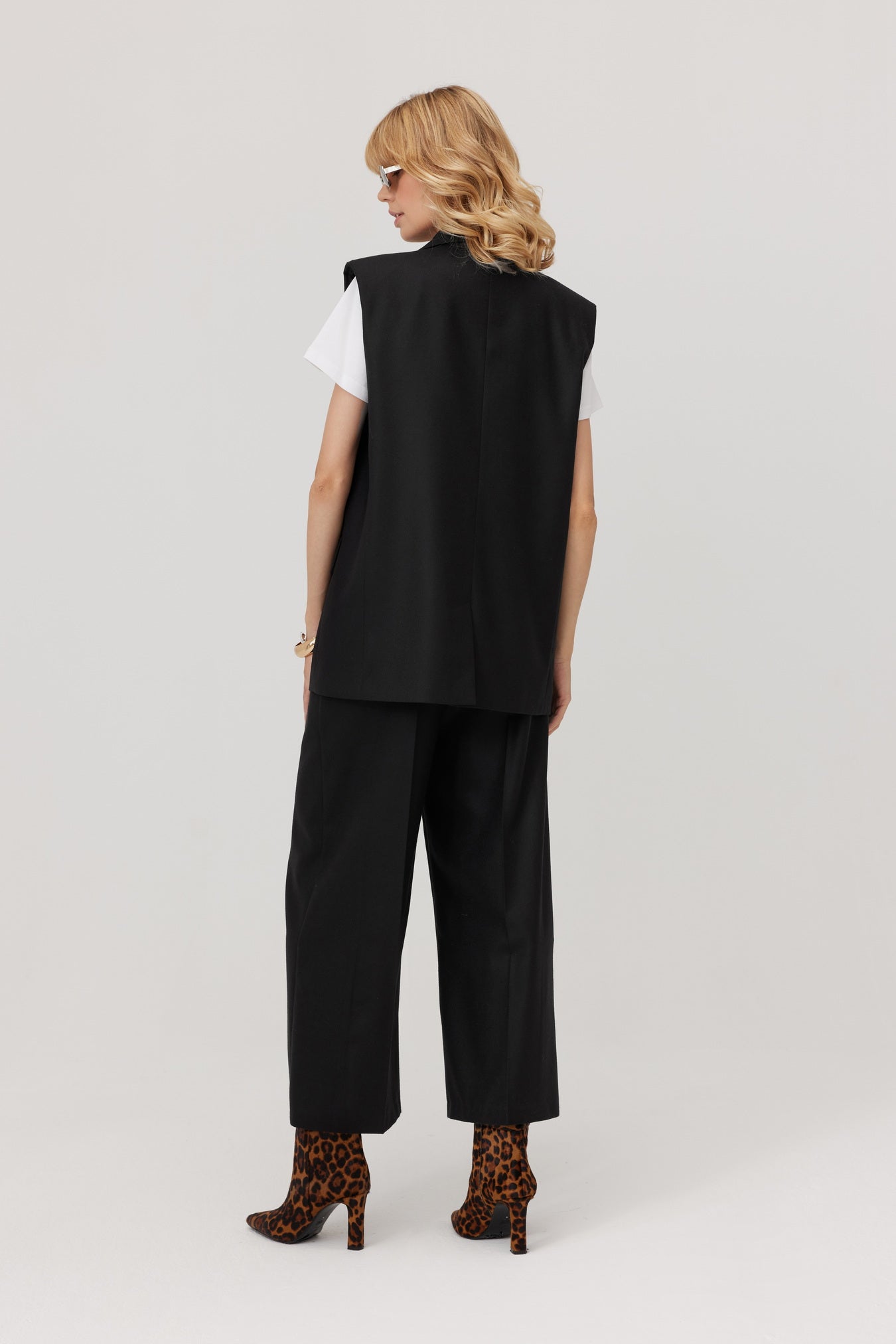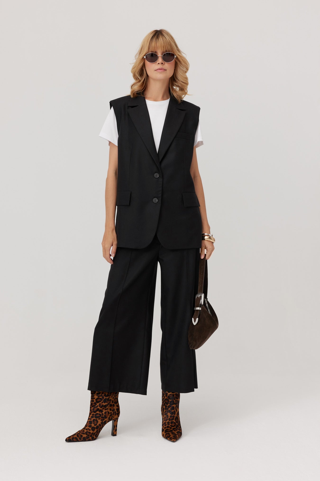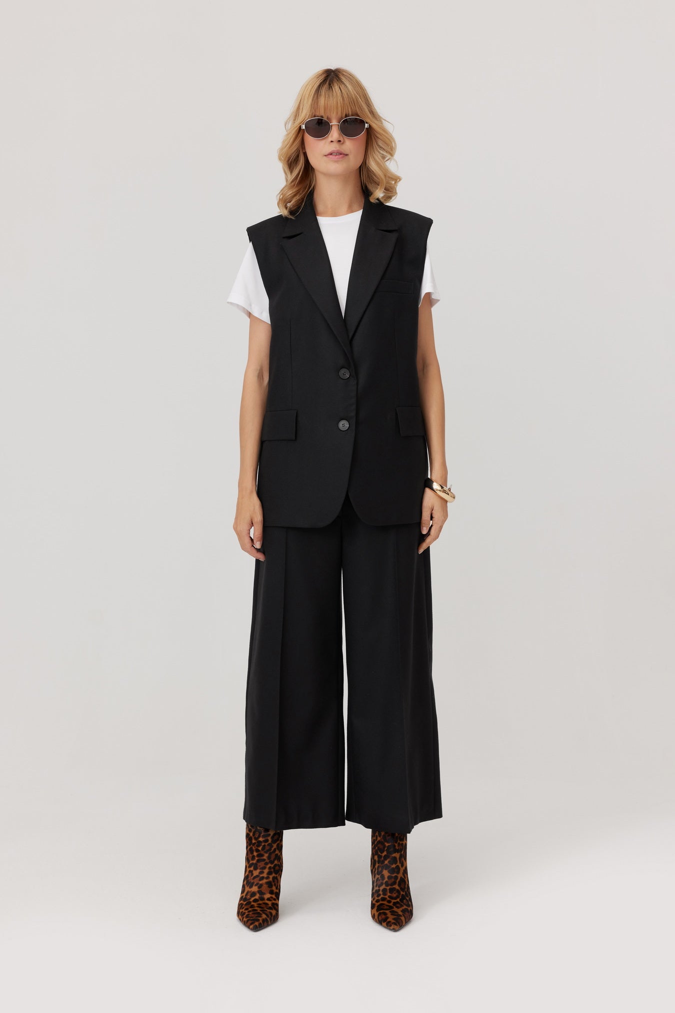 Sign up for our newsletter and get a 10% discount on your purchasesKamizelka żakietowa Lano to nowoczesna interpretacja klasyki. Ponadczasowy fason został uszyty z lekko sztywnej, wełnianej tkaniny, która pięknie układa się na sylwetce. Szerokie klapy i wydłużona, swobodna linia kroju dodają elegancji i lekkości. Zapięcie na dwa guziki akcentuje prostotę formy i miejski szyk. Kamizelkę można nosić zarówno samodzielnie na T-shirt, jak i warstwowo z koszulą czy swetrem.