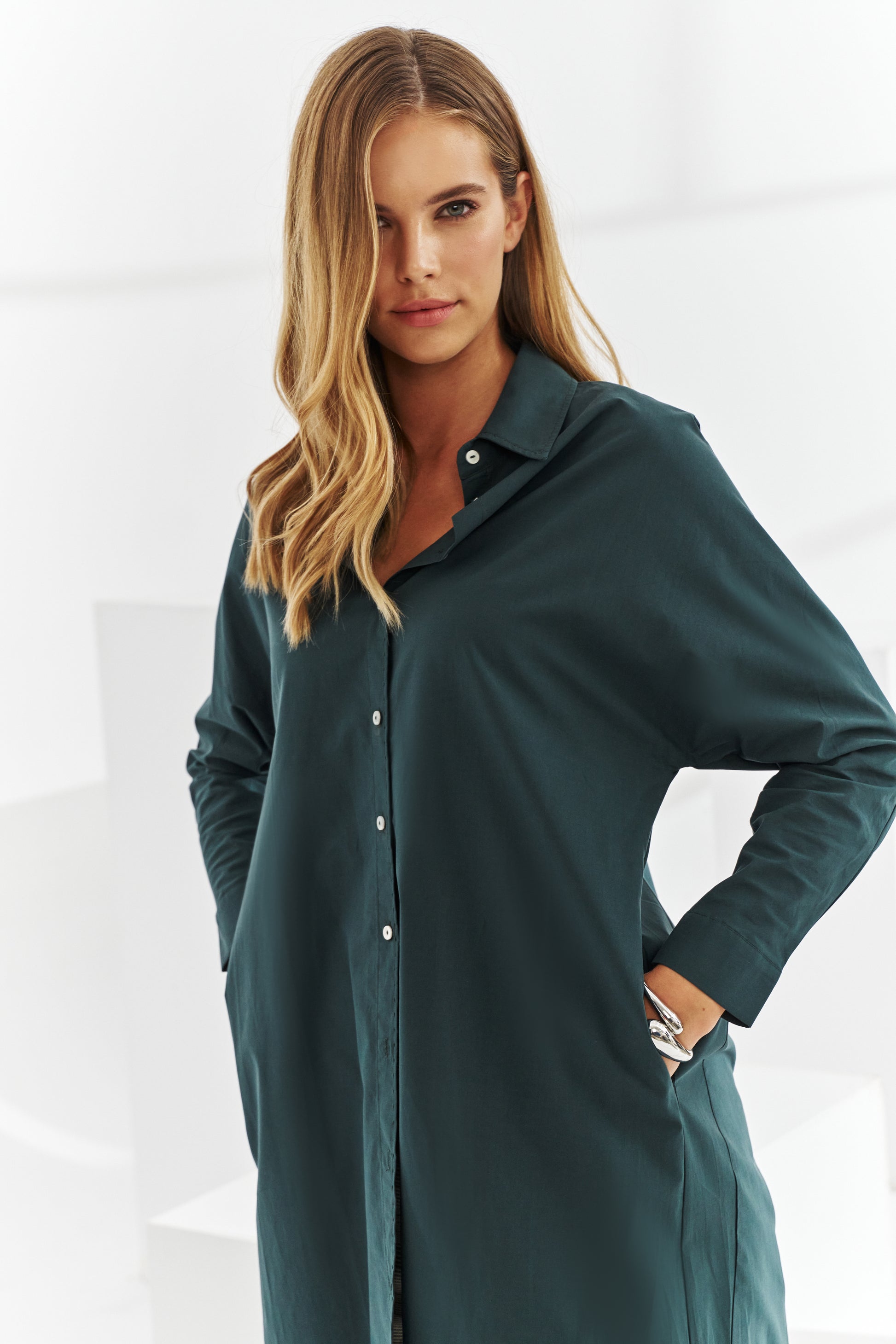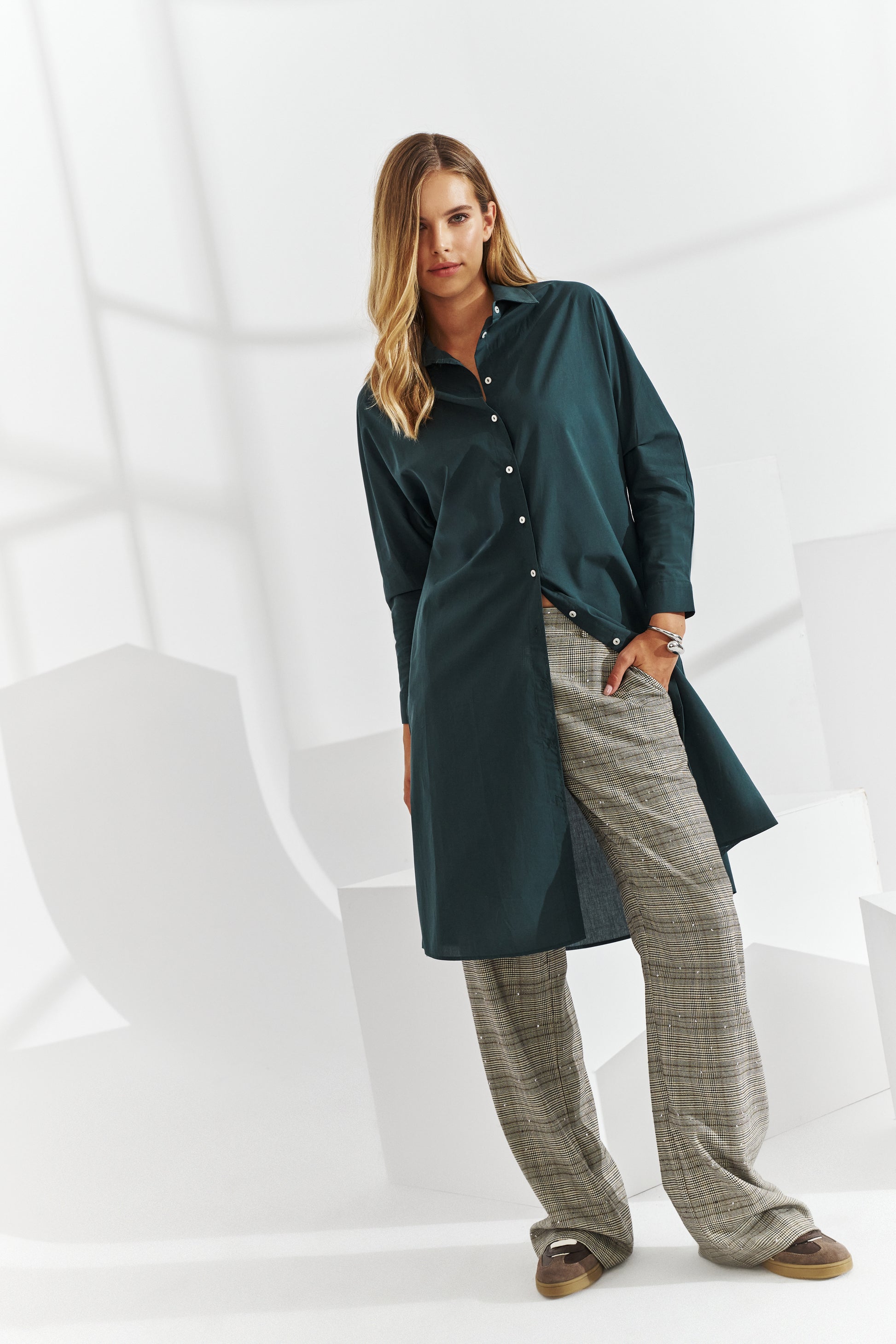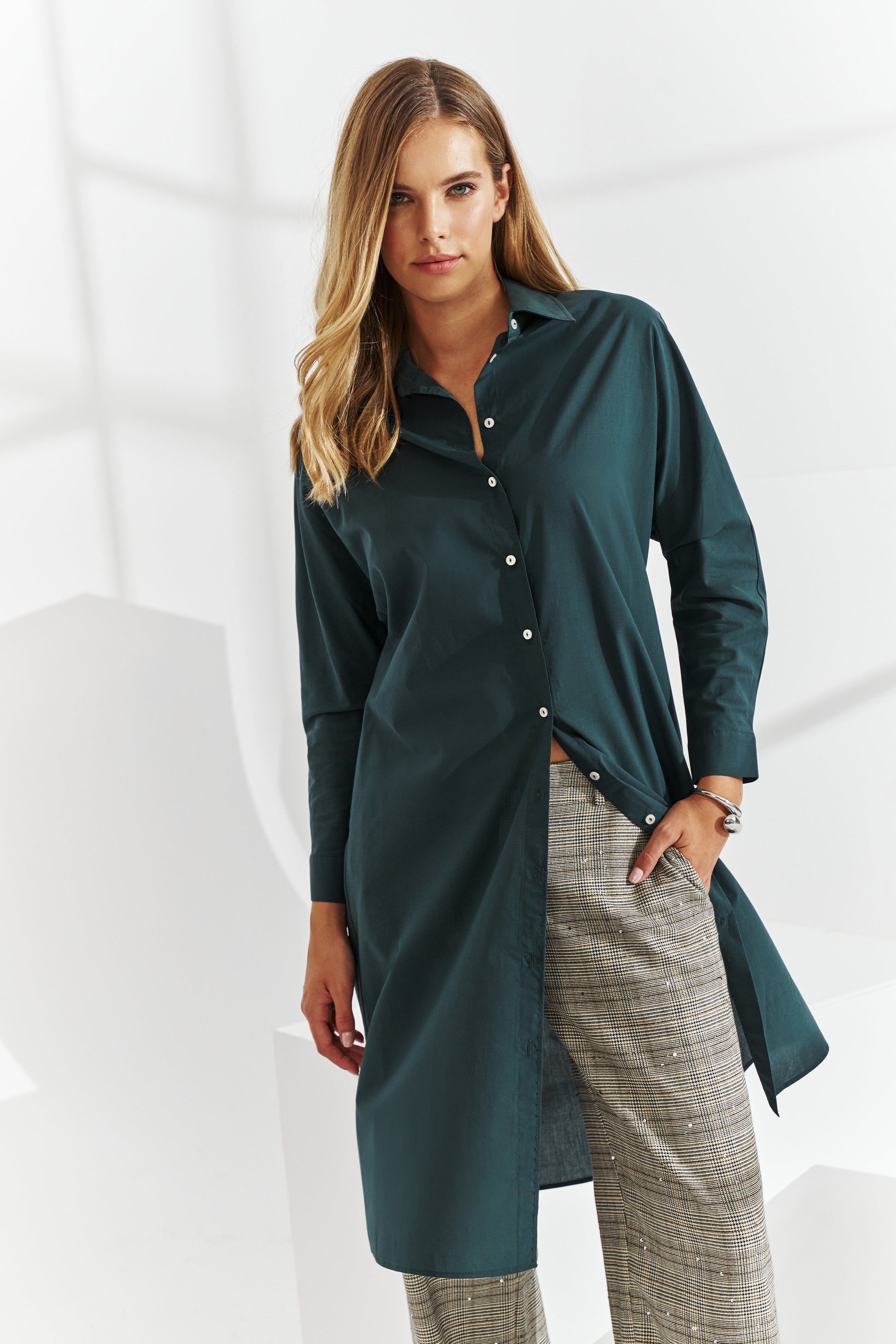 - Fastening: Delicate, small, white buttons - subtle and casual.