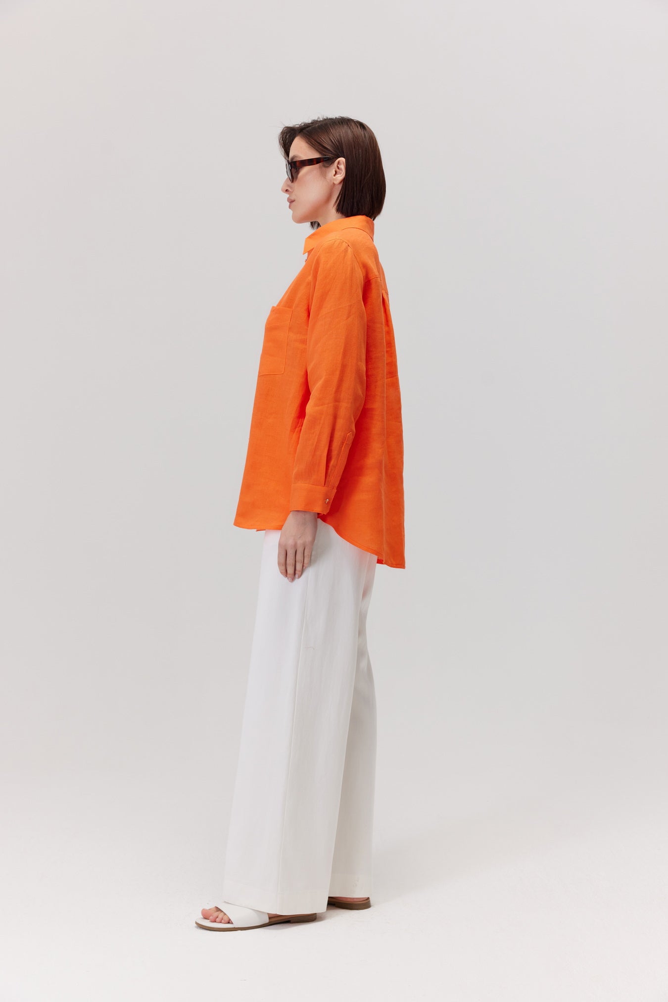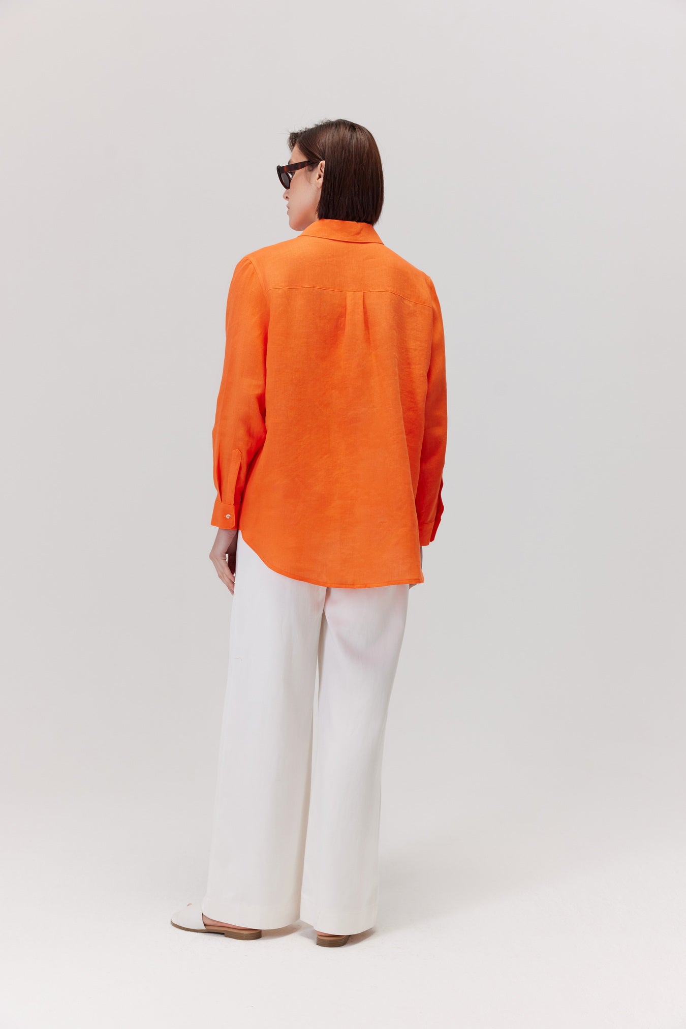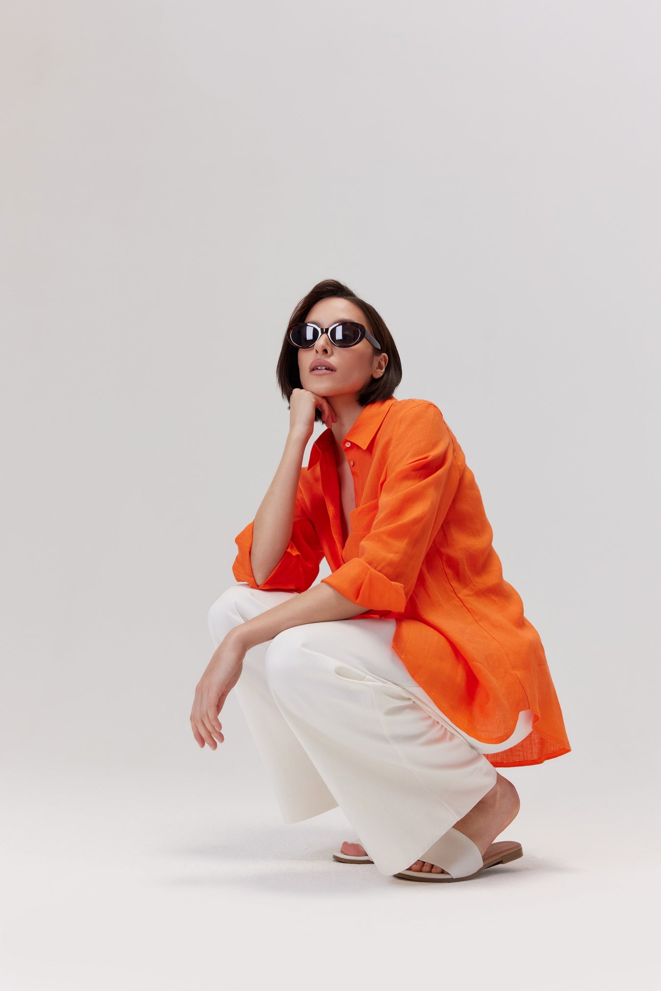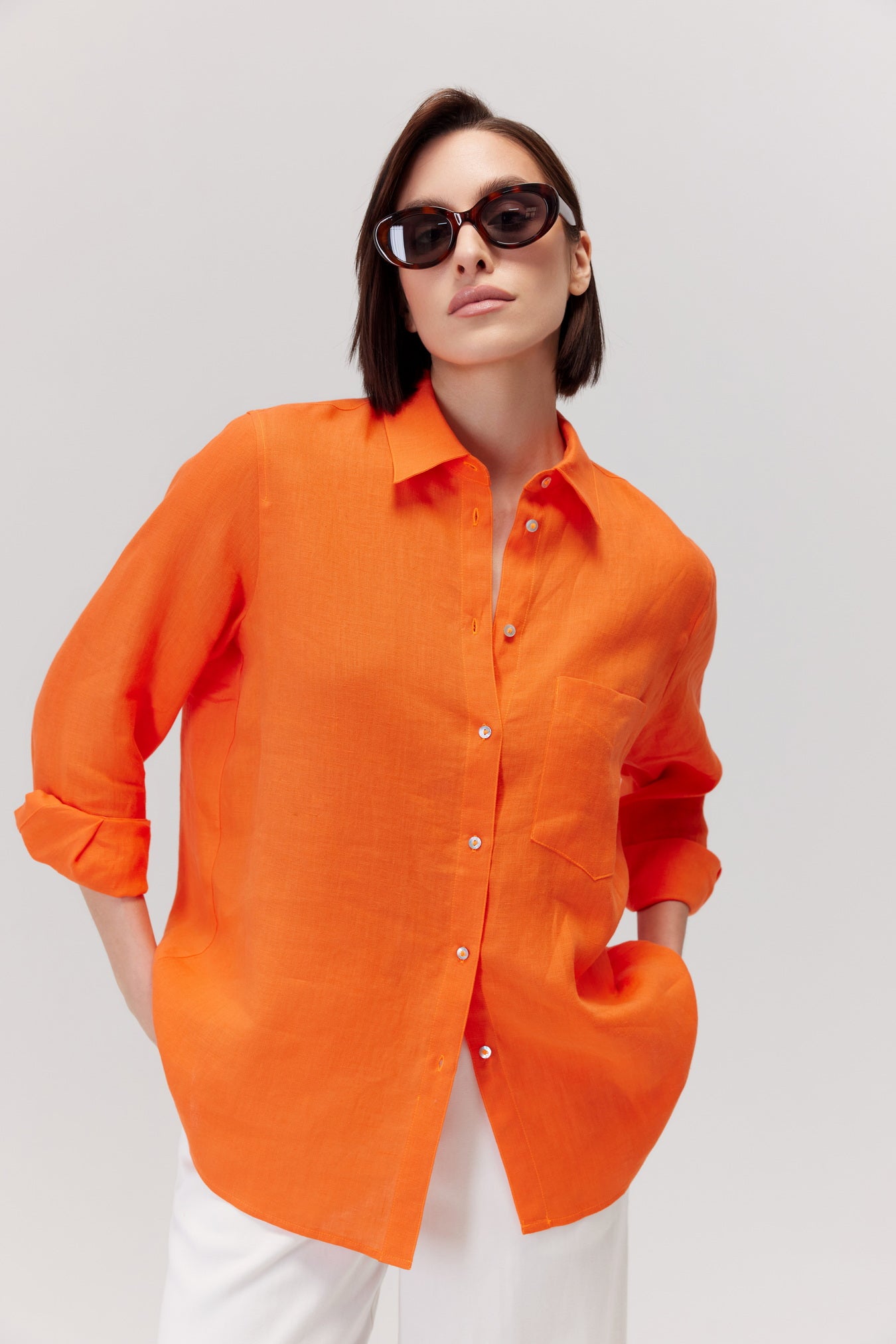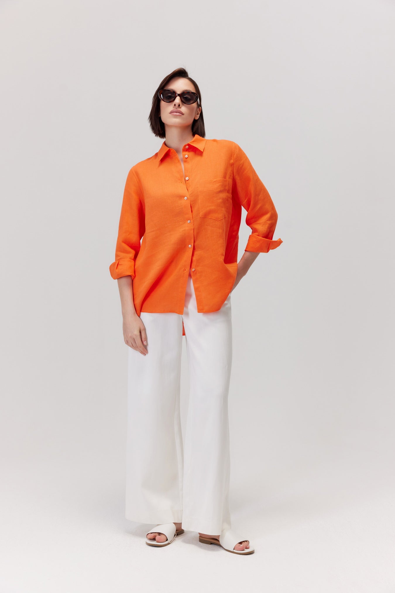 - Koszula Flax w odcieniu intensywnej pomarańczy to idealny wybór na lato – łączy naturalność, wygodę i modowy akcent w jednym.