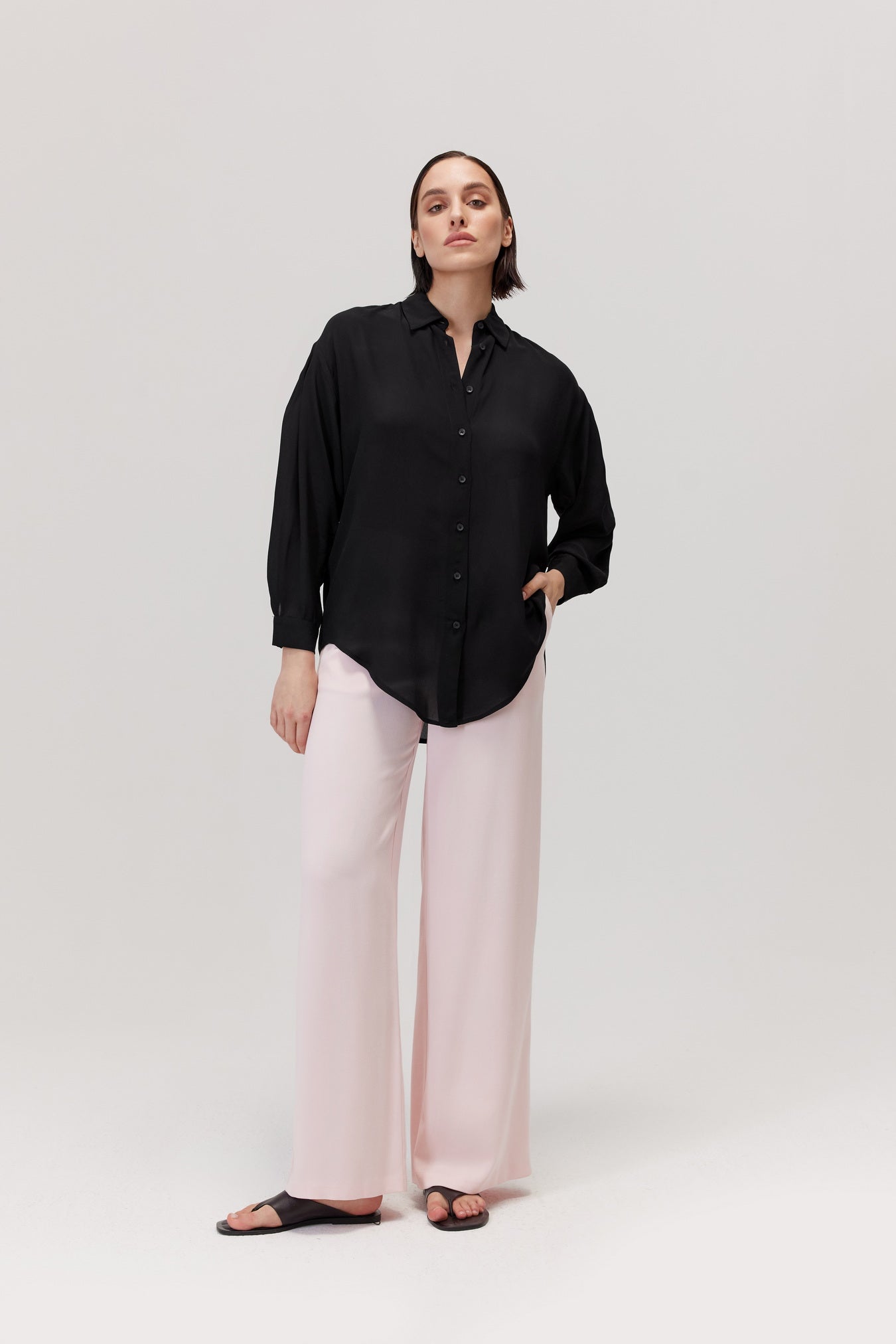 - Model Nevra doskonale współgra z szerokimi spodniami, jeansami czy spódnicami o prostym kroju. To idealna koszula do biura, ale i na wieczorne wyjście – wystarczy zmienić dodatki.