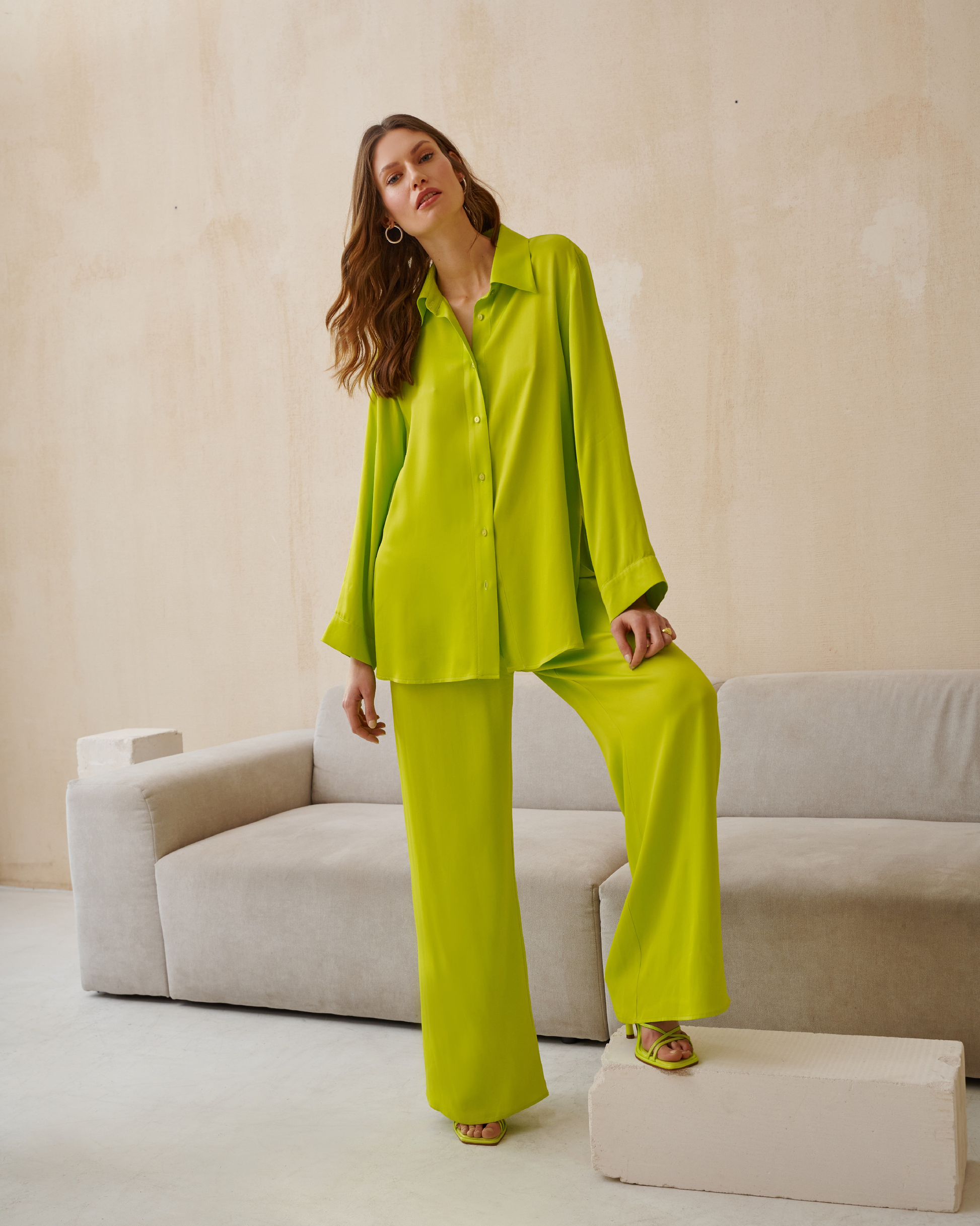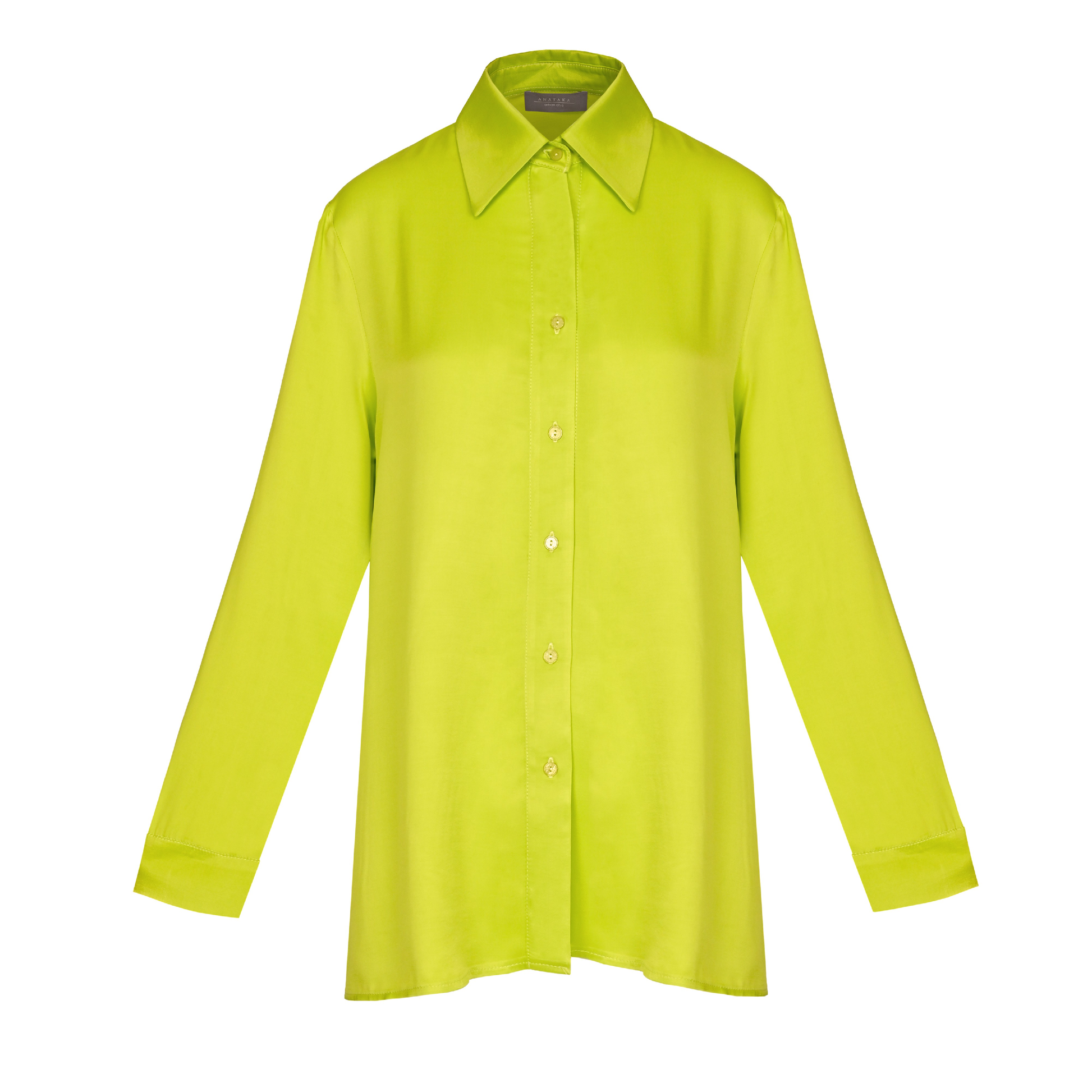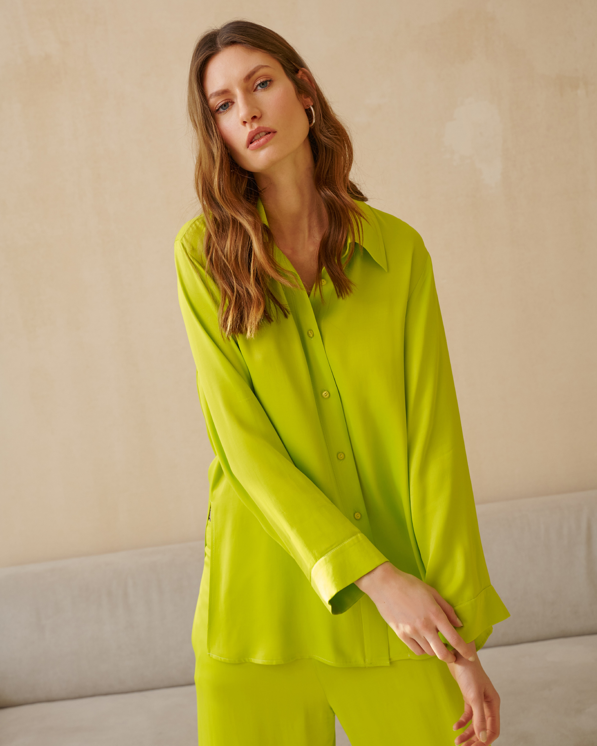 Sign up for our newsletter and get a 10% discount on your purchasesIntense lime-colored shirt made of satin viscose with a delicate shine. A model that flows freely over the figure with a classic collar and fastening with a row of small, iridescent buttons. Loose sleeve with cuff. Its elongated form and high cracks on the hips give it lightness.