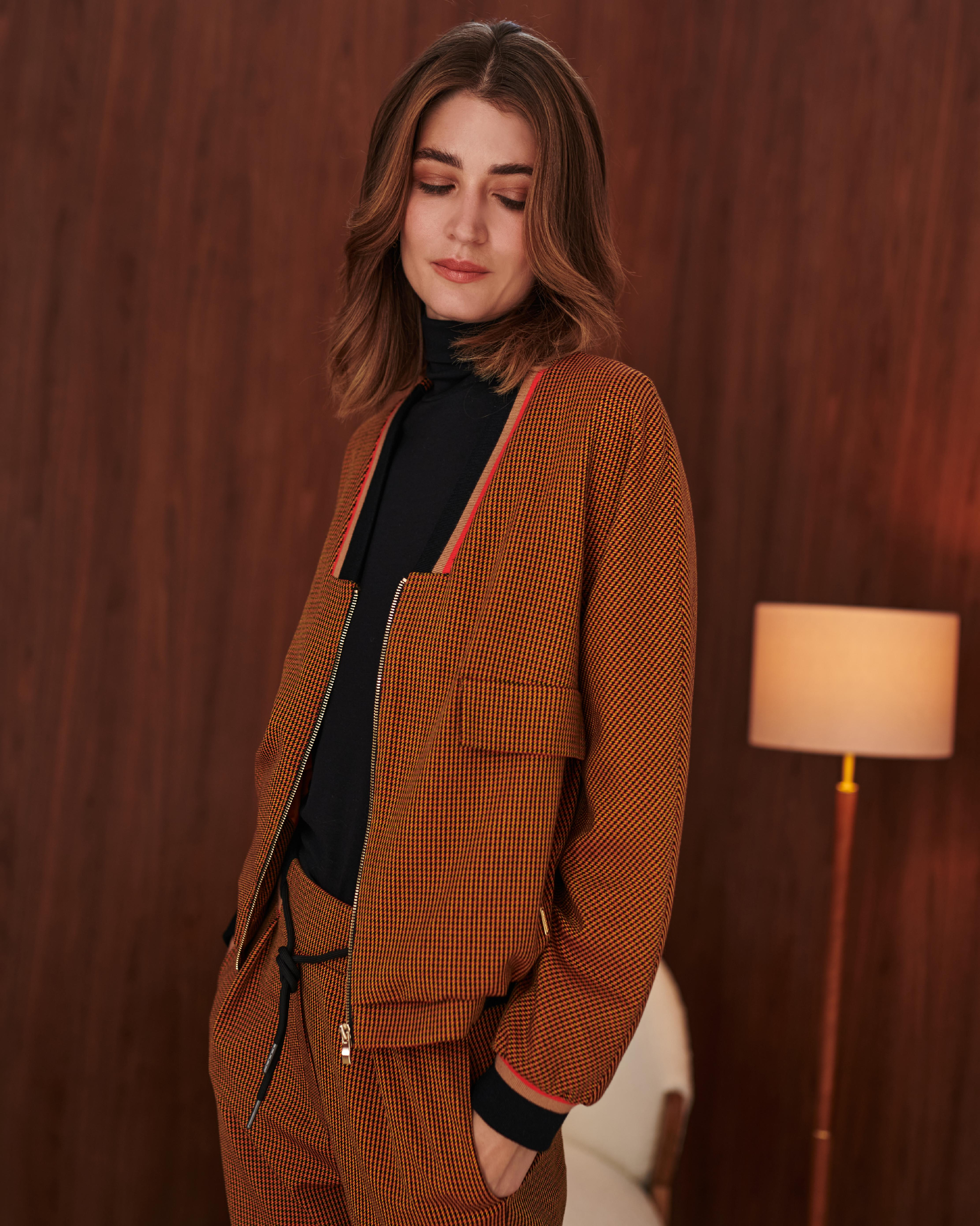 The Sisley jacket attracts attention with its seasonal, warm color and original checkered pattern. Creates a very stylish tracksuit a la suit with Sisley trousers.
