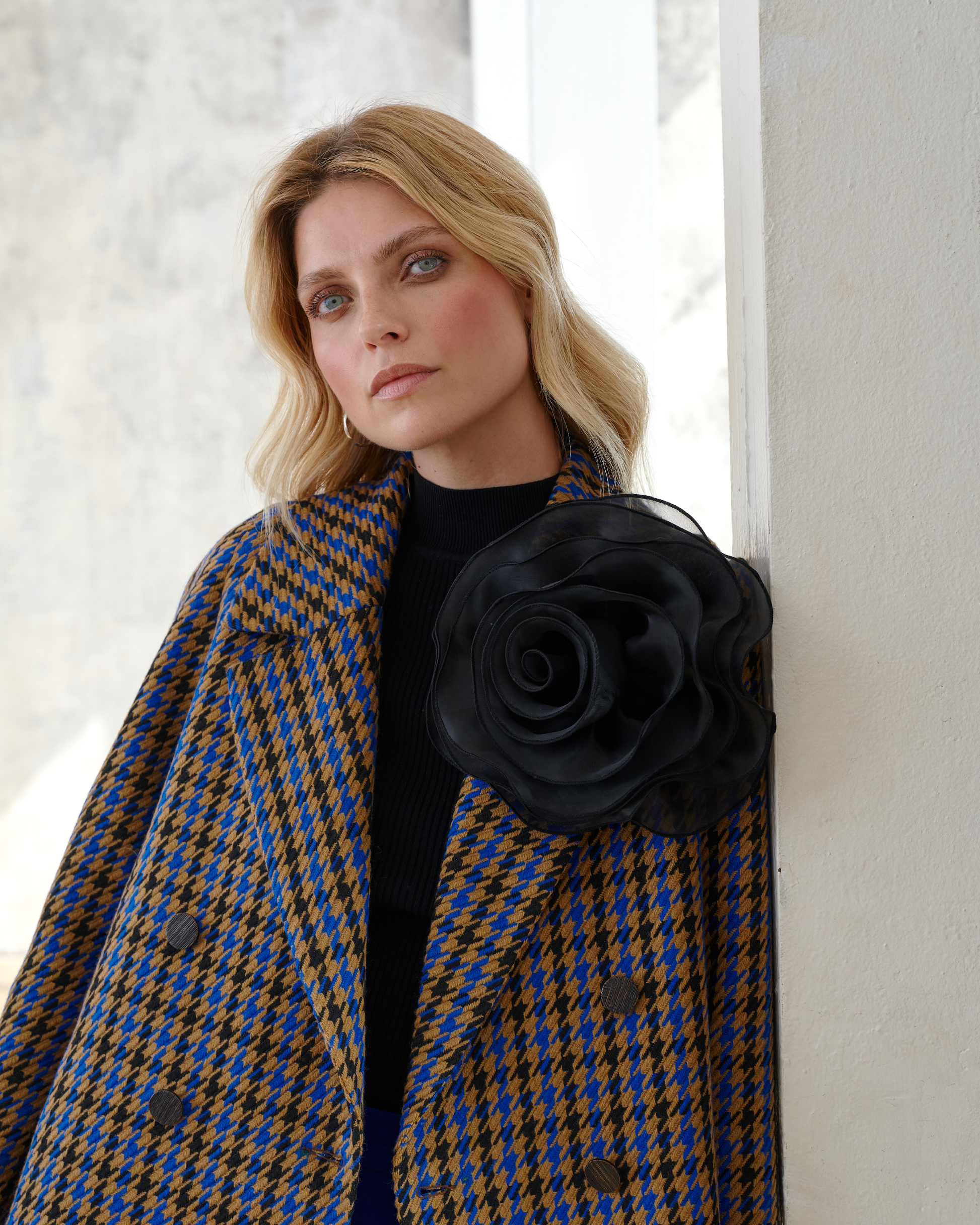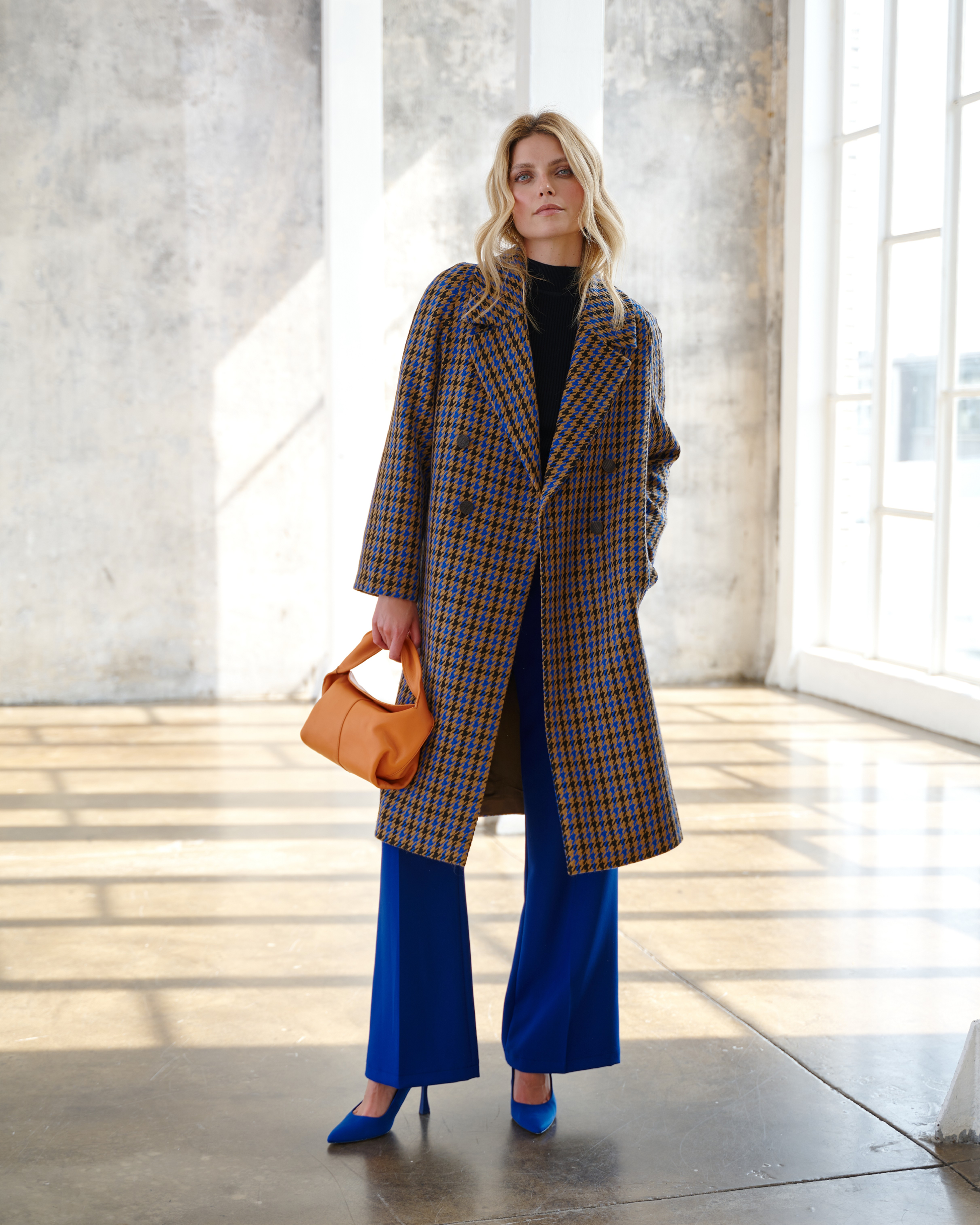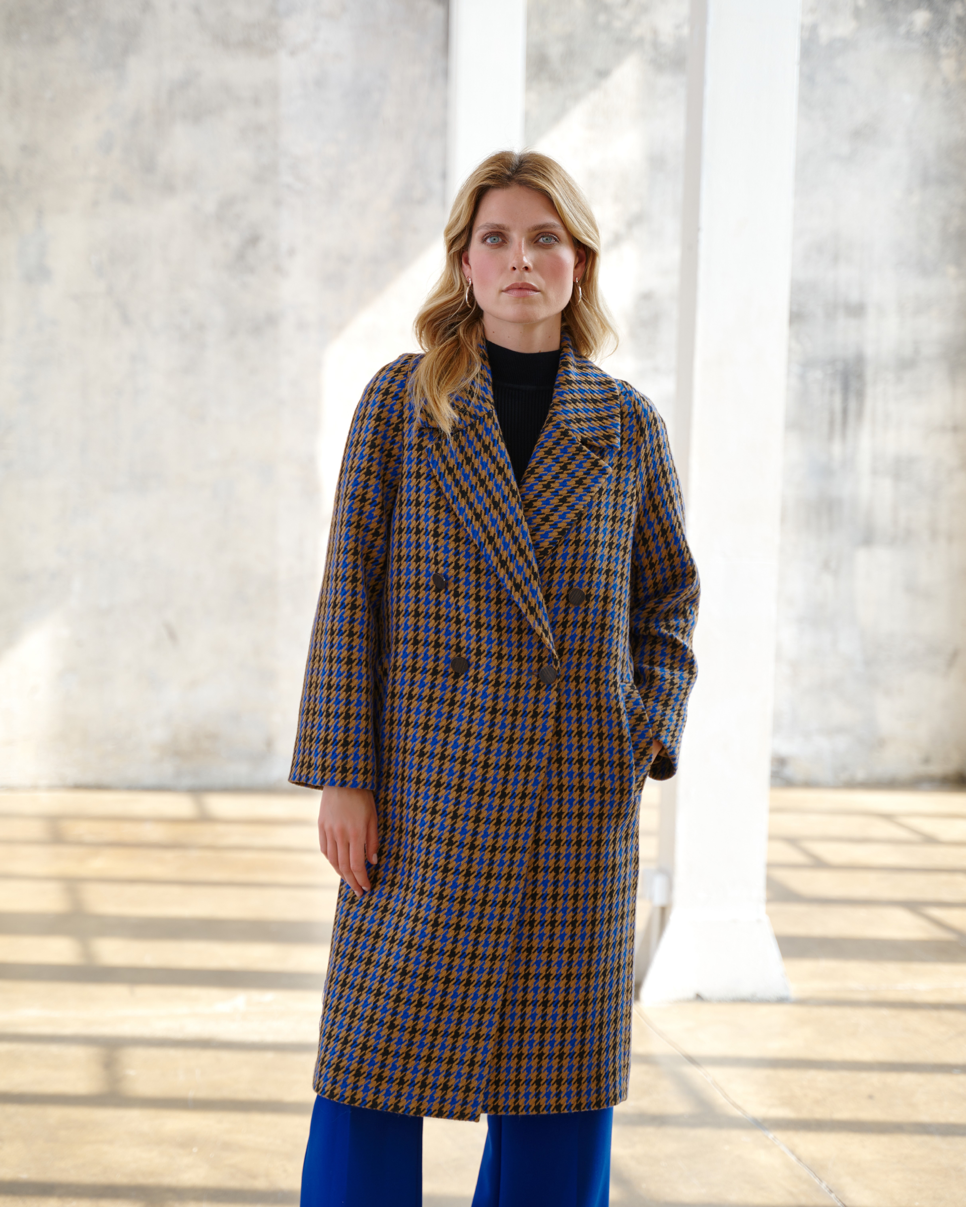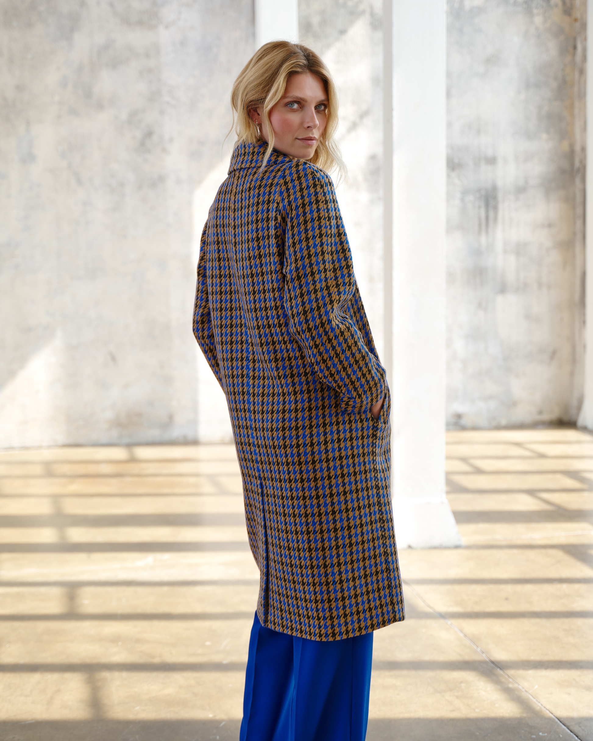 Sign up for our newsletter and get a 10% discount on your purchases A stylish and comfortable coat made of original fabric with a unique pattern - sapphire, black and beige houndstooth. We made it in a simple, classic cut in midi length. The whole is complemented by: a breathable viscose lining in a subtly shiny coffee shade and a slimming reverse collar. For comfortable wearing and an oversized look, we lowered the sleeves and added comfortable pockets at hip level. The front is decorated with colorful buttons. Straight back with a slit.
