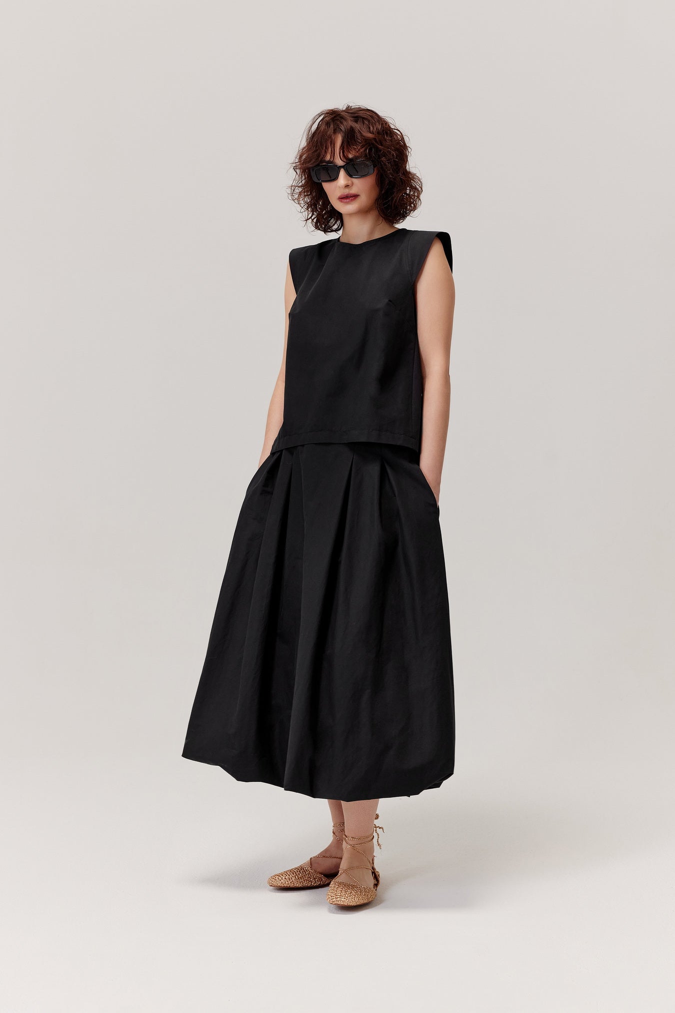 Sign up for our newsletter and get a 10% discount on your purchasesOtul się lekkością i prostotą w zestawie Blister! To połączenie topu i spódnicy o unikalnym kroju, które razem tworzą ponadczasową, minimalistyczną stylizację.