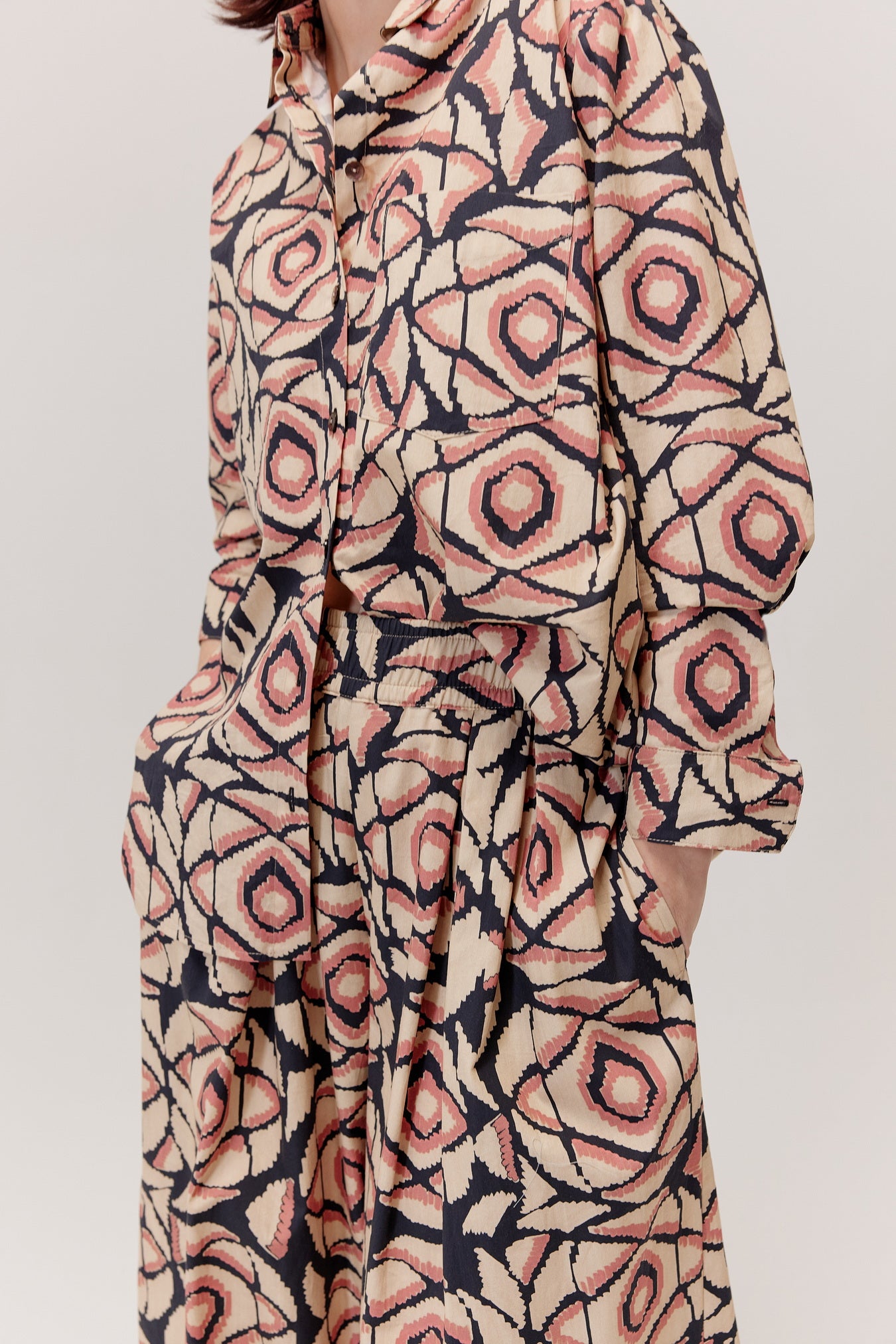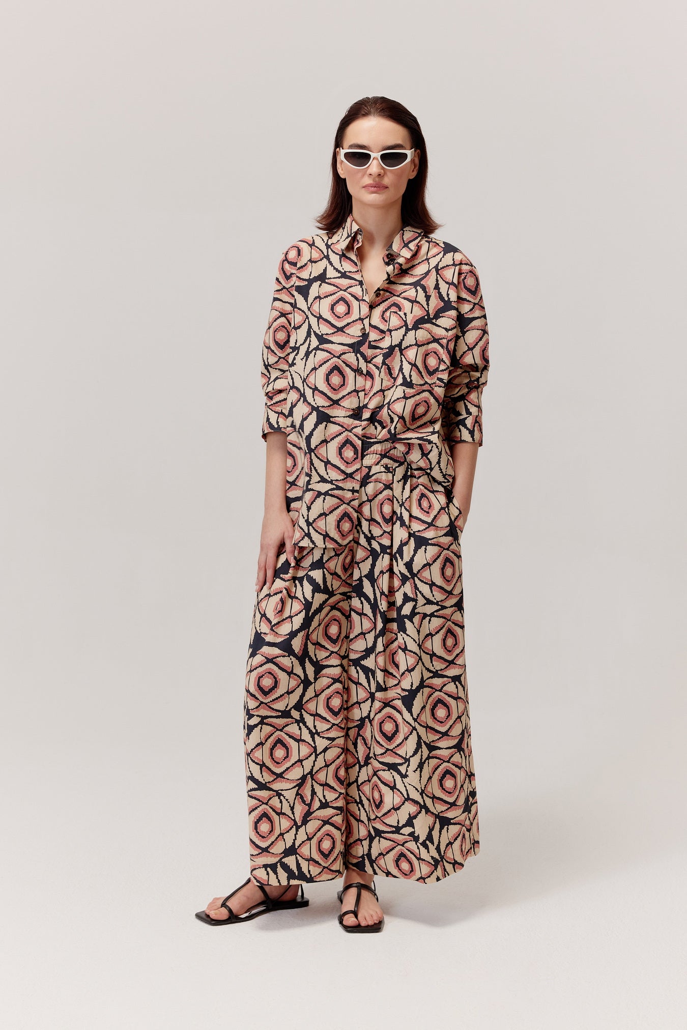 Sign up for our newsletter and get a 10% discount on your purchasesTo połączenie koszuli i spodni o szerokich nogawkach w hipnotyzujący wzór, które przeniesie Cię w świat swobody wyobraźni.