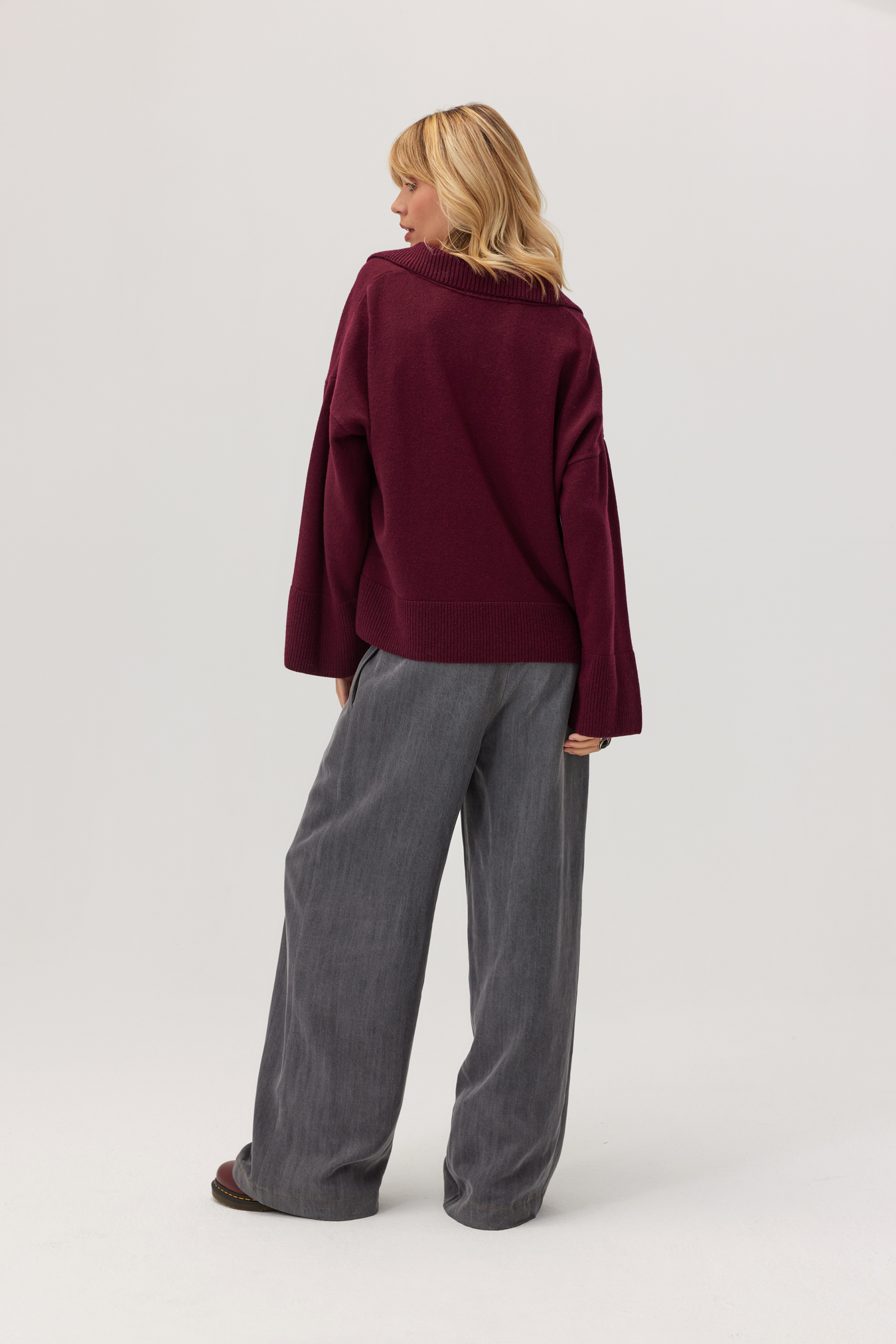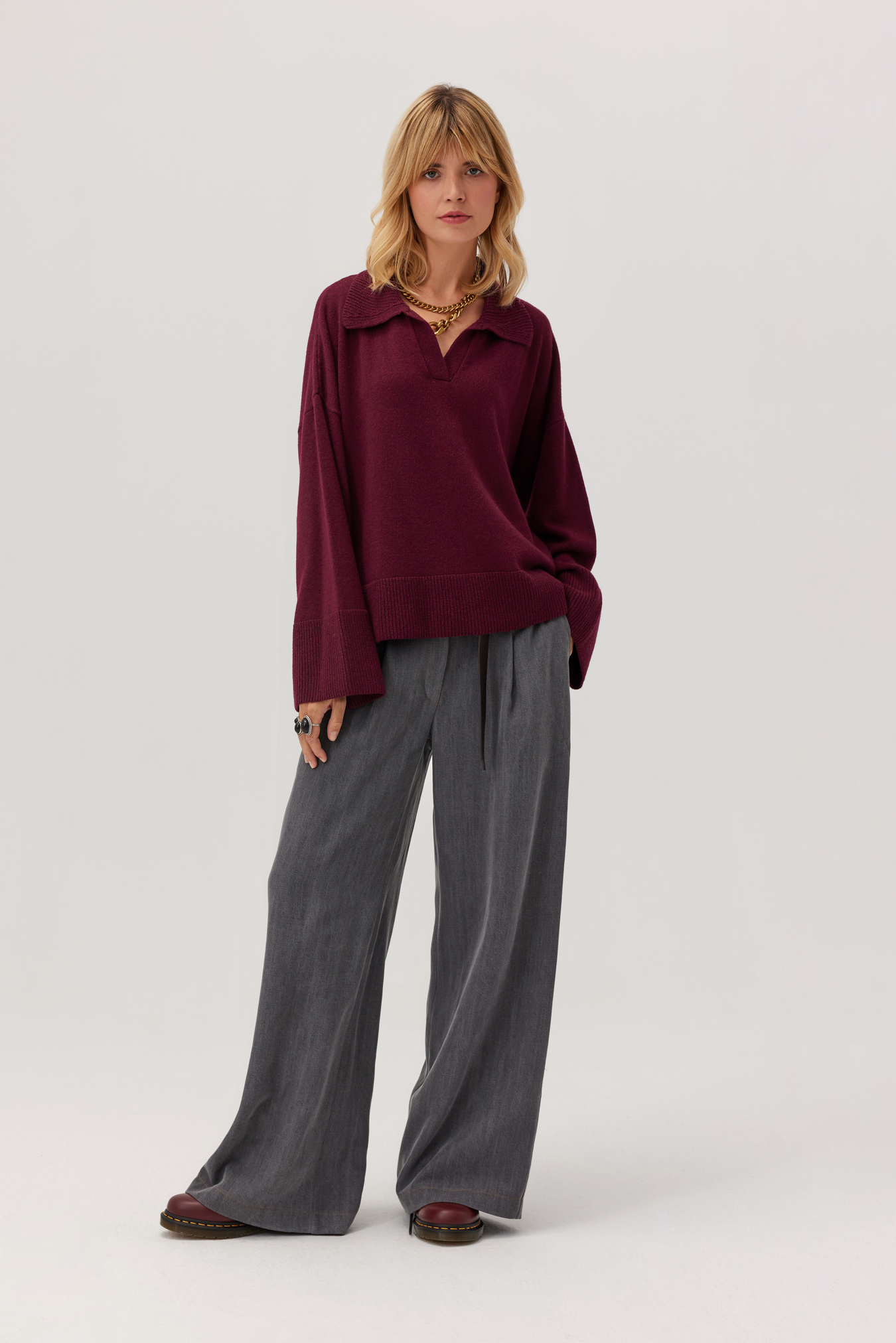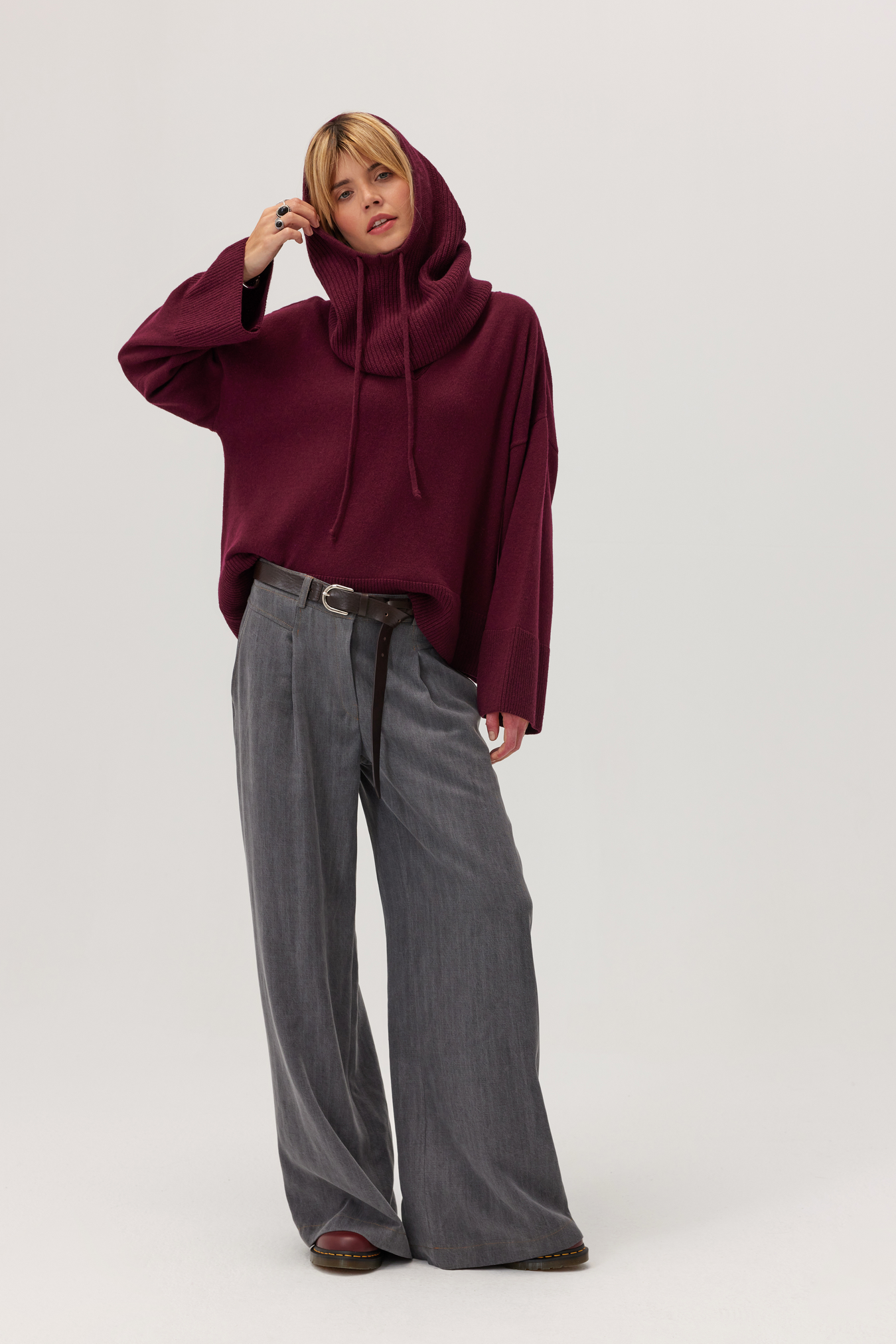 Sign up for our newsletter and get a 10% discount on your purchasesSweter Adore z wełną i kaszmirem w kolorze głębokiego burgundu to propozycja idealna na chłodniejsze dni. Oversize’owy krój z lekko opuszczoną linią ramion nadaje mu nowoczesny, swobodny charakter, a wyrazisty kołnierz i subtelne detale sprawiają, że wyróżnia się w każdej stylizacji. Luksusowa mieszanka kaszmiru i wełny otula przyjemnym ciepłem i gwarantuje komfort noszenia nawet przez cały dzień.