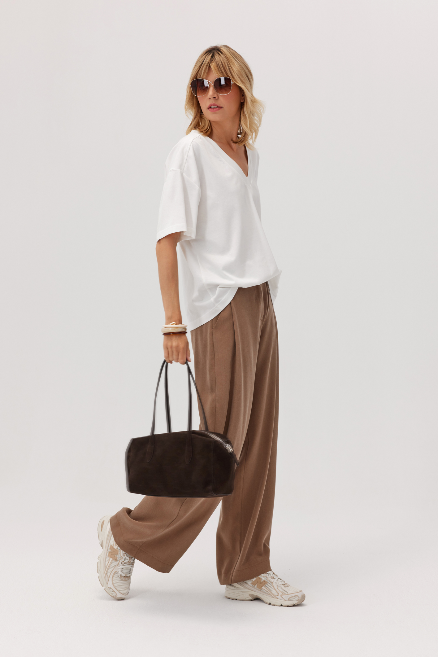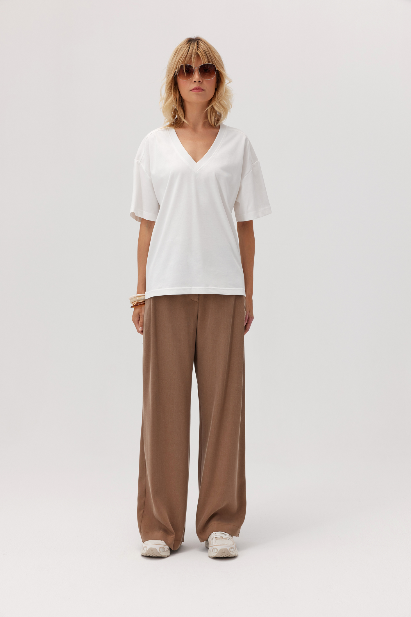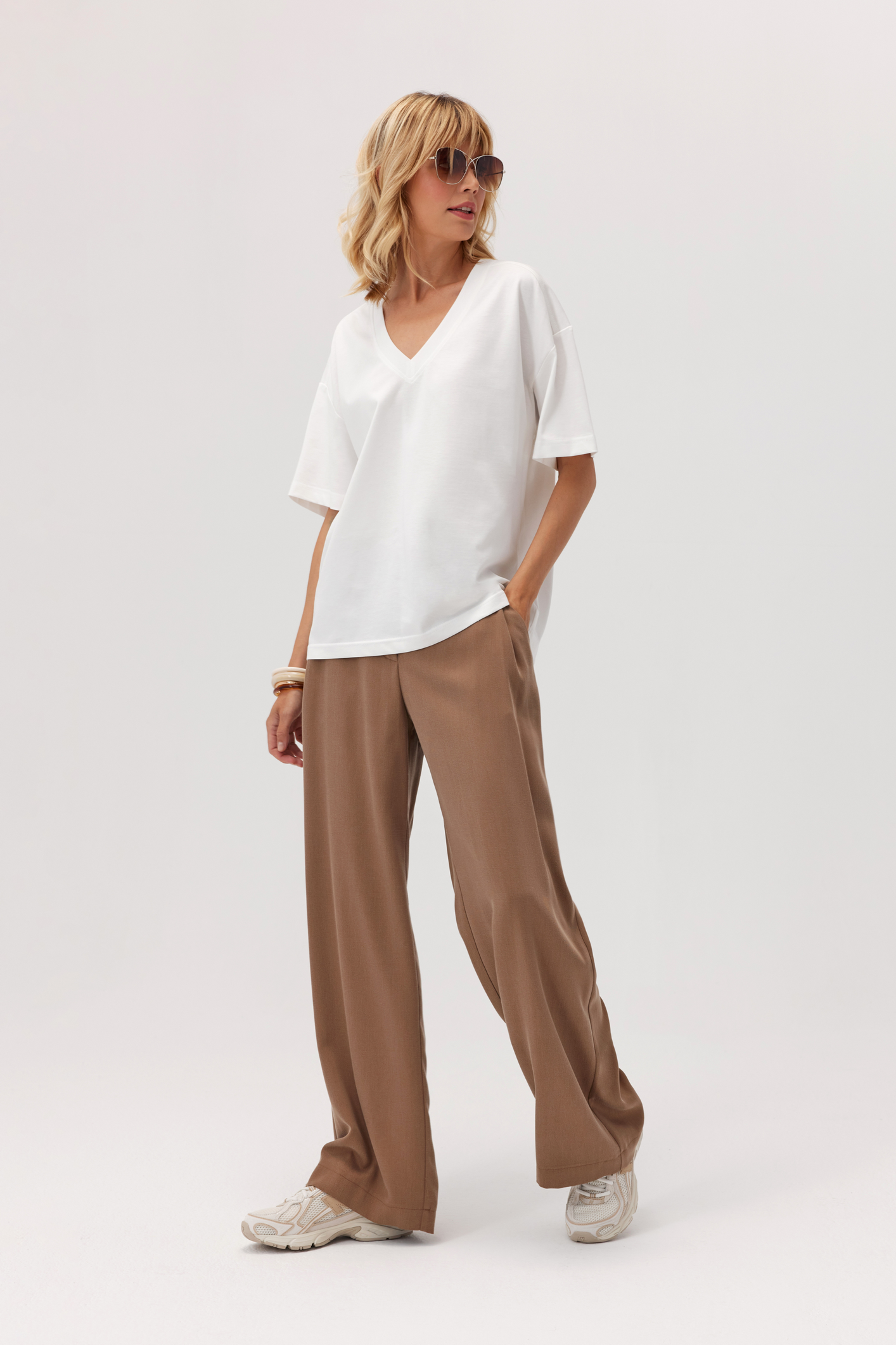 Sign up for our newsletter and get a 10% discount on your purchasesT-shirt Orte to oversize’owa bluzka z grubszej bawełny, która zapewnia pełen luz i wygodę na co dzień. Ma głęboki dekolt w szpic, wykończony szeroką plisą. Luźne, sięgające łokcia rękawy z wyraźnie obniżoną linią ramion nadają całości swobodny, nowoczesny charakter. Bluzka świetnie pasuje do codziennych, miejskich stylizacji, a jej długość (62 cm) sprawia, że można ją nosić swobodnie, bez wpuszczania w spodnie czy spódnicę.