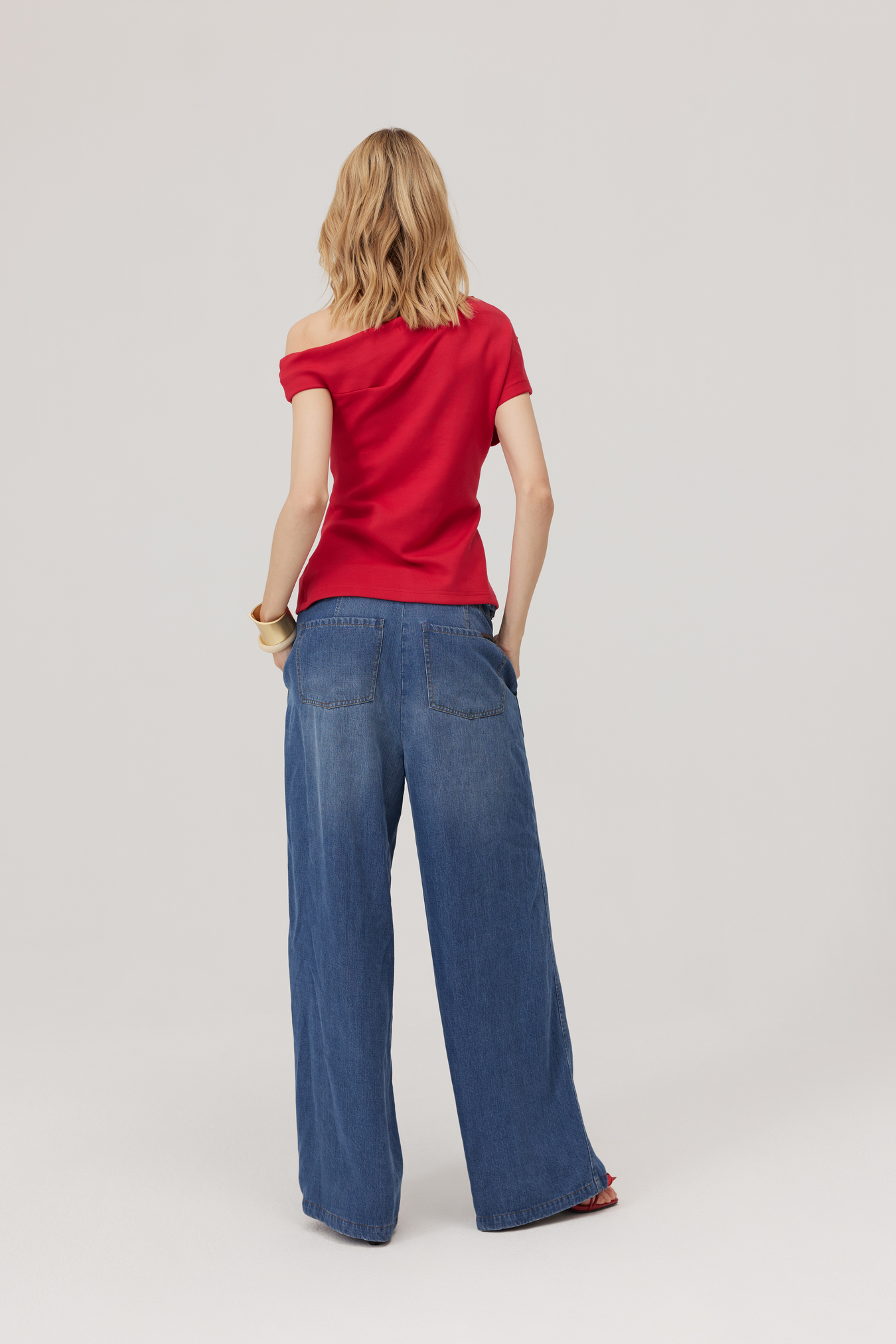 Dzianina dopasowuje się do sylwetki i miękko układa na ciele. Skrócona długość dobrze współgra z szerokimi spodniami i wysokim stanem.