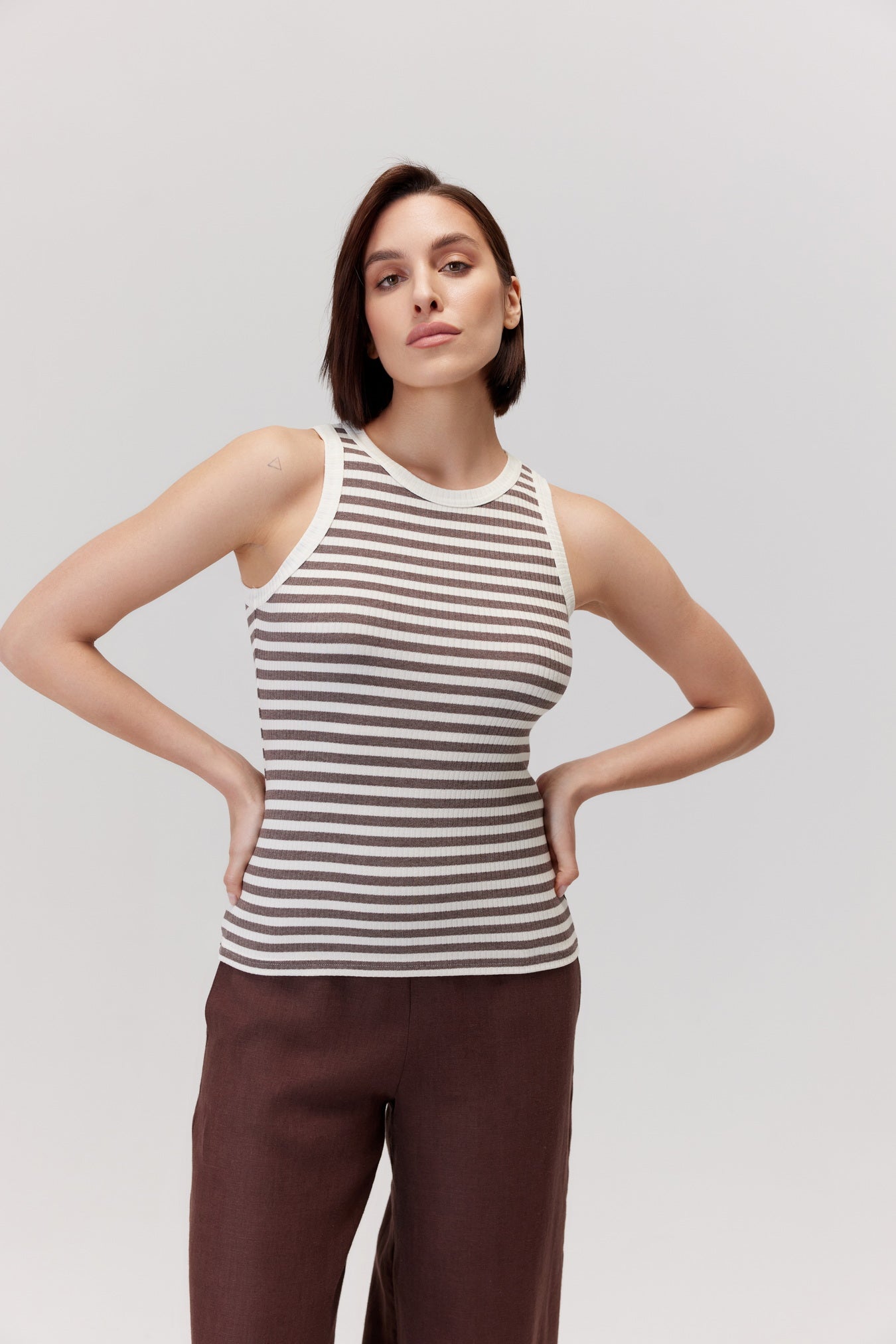 - Ten top w ciepłej szarości z nutą brązu to uniwersalna, subtelna alternatywa dla klasycznych pasków;