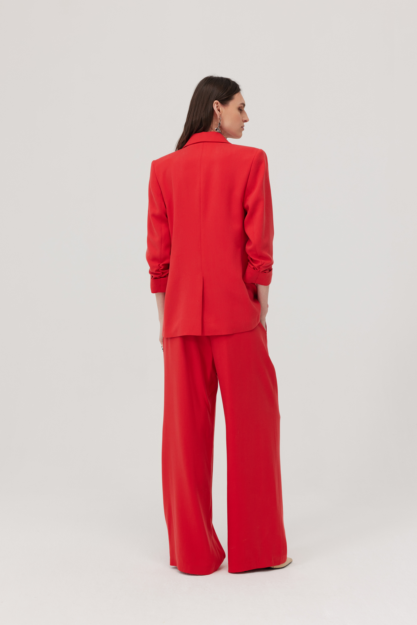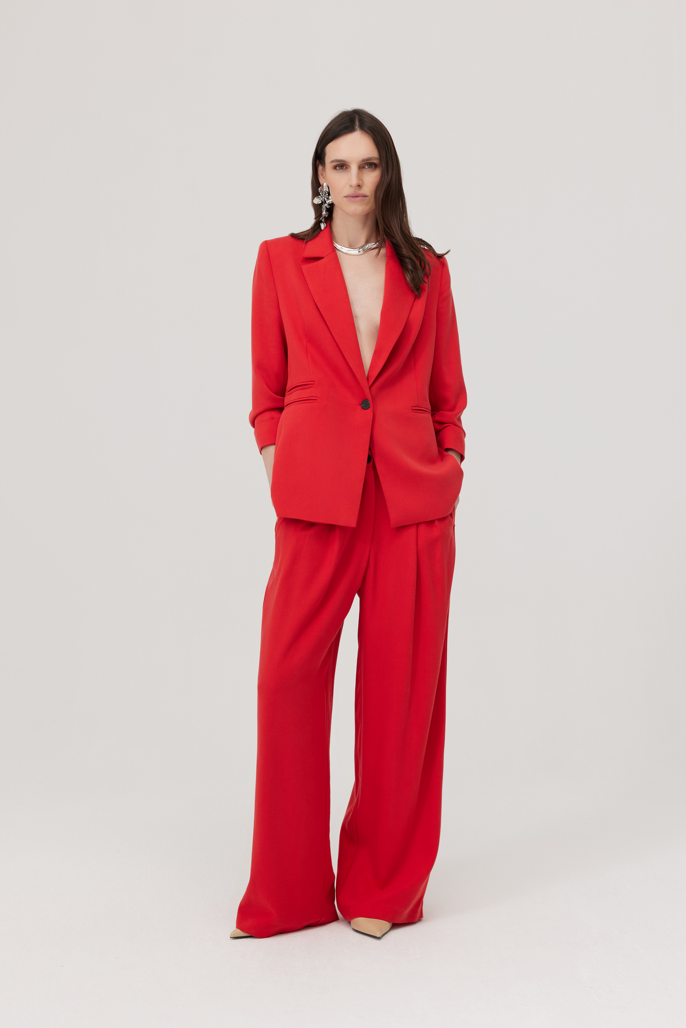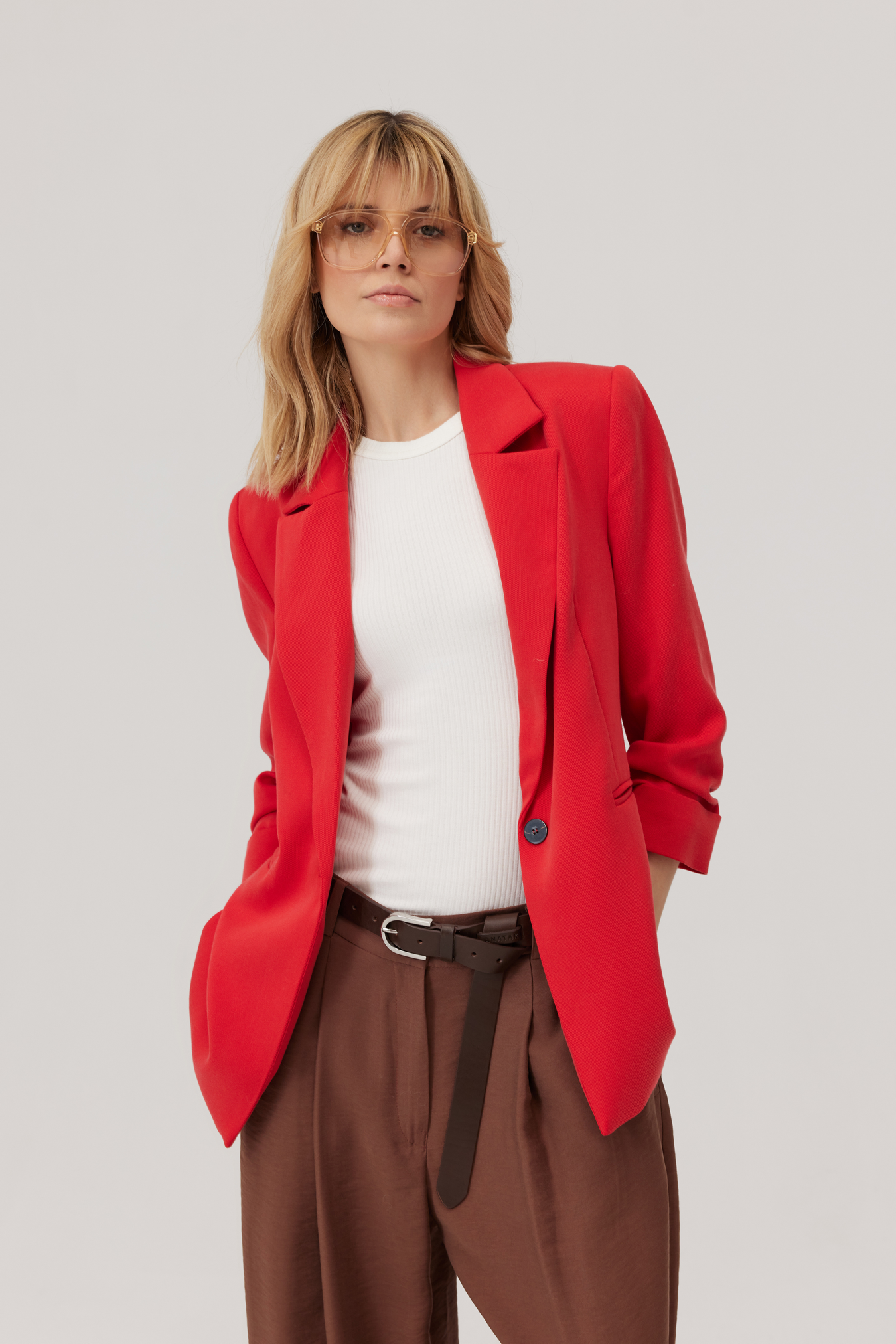 Żakiet Edgar w intensywnej czerwieni przyciąga uwagę kolorem i wyważoną linią. Uszyty jest z lyocellu i ma prosty, lekko wydłużony krój. Zapinany jest na jeden guzik, dzięki czemu przód układa się w głębszy, otwarty dekolt.