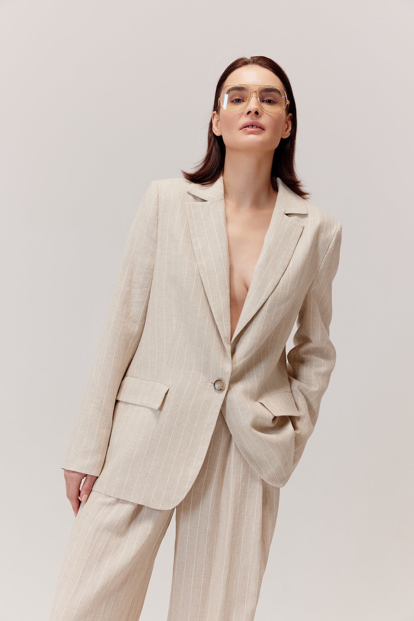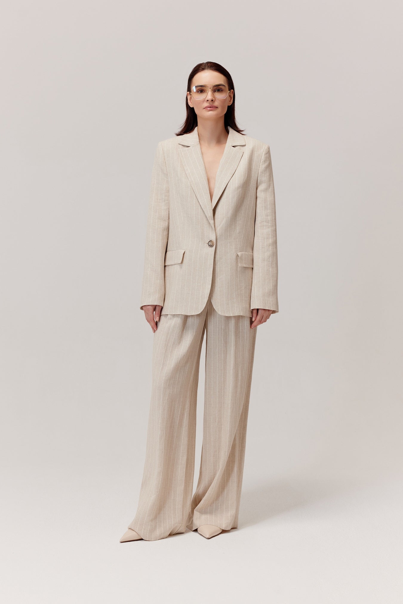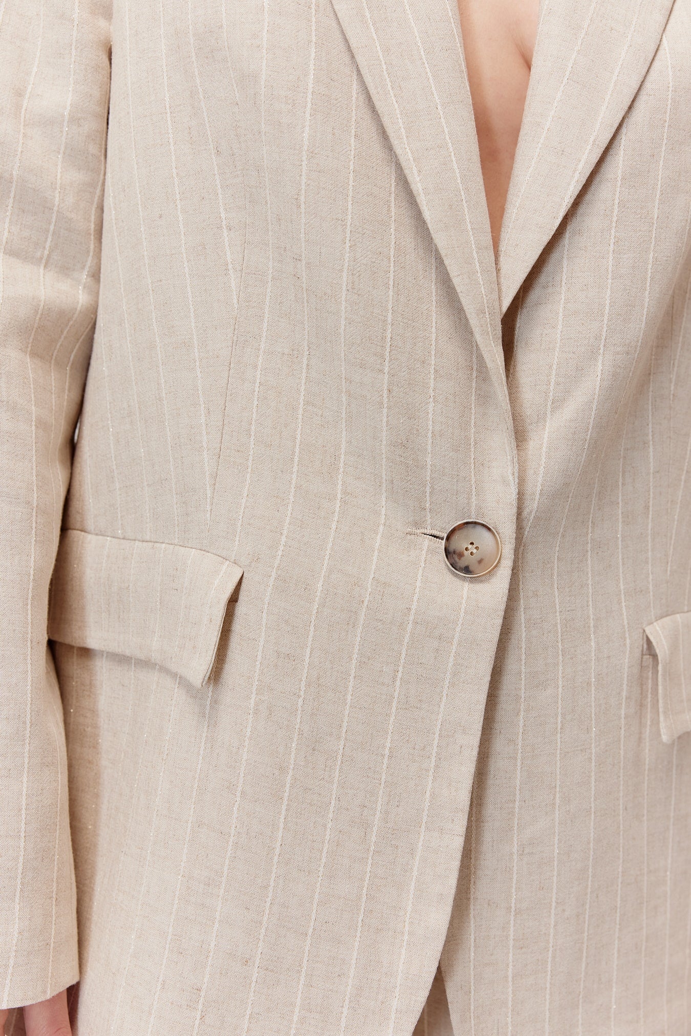 - Kolor: jasny, naturalny beż w drobny prążek – elegancki, ponadczasowy i letni,