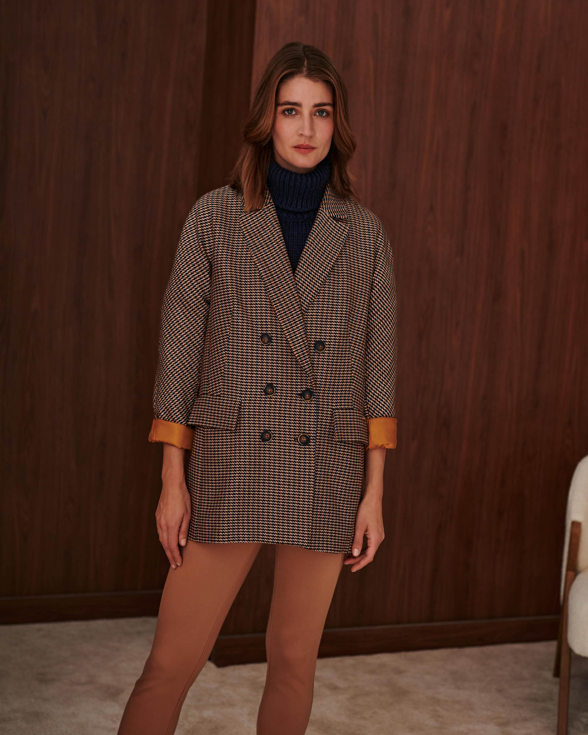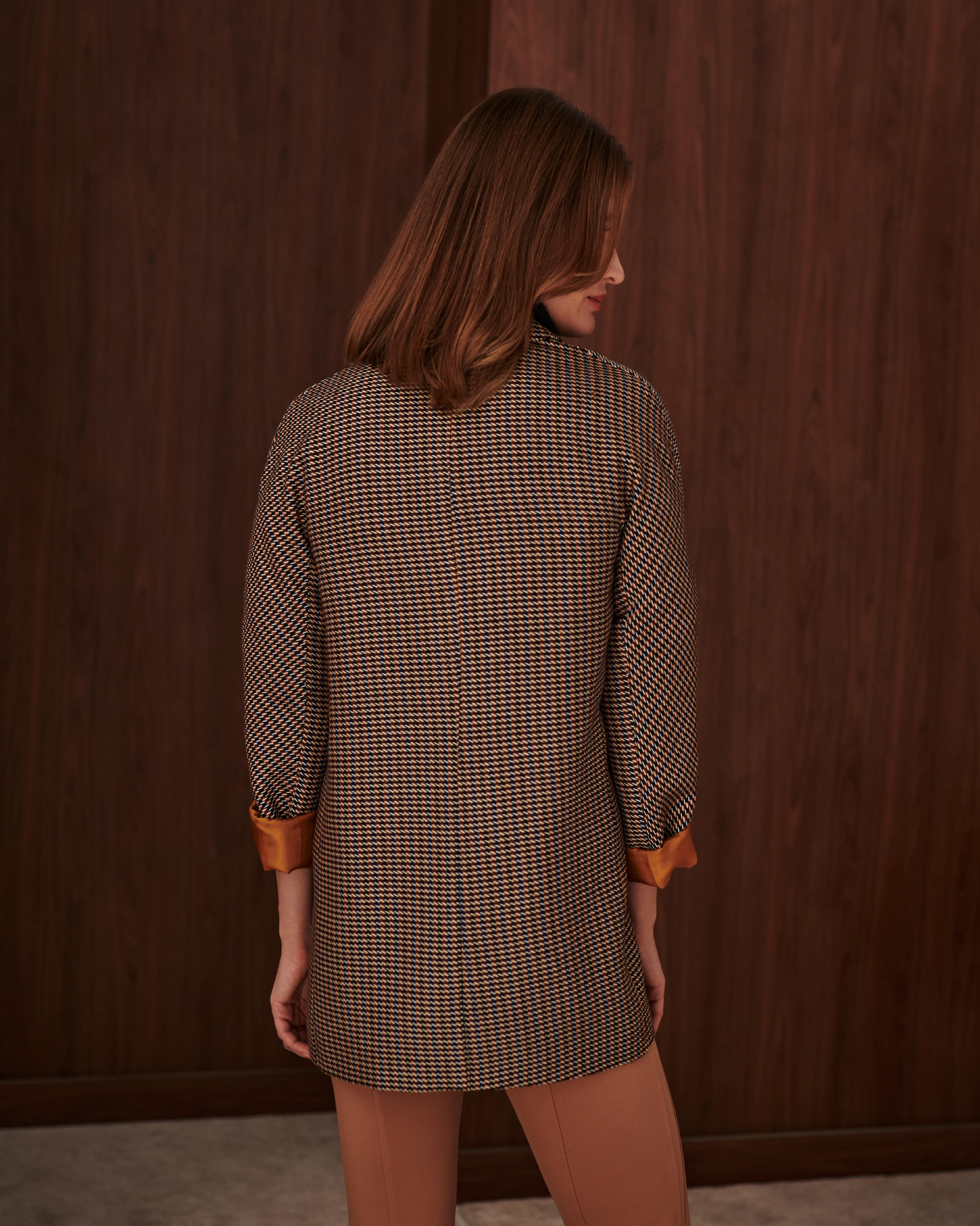 intemporelle veste ˆ carreaux bleu marine, marron et camel. Le dŽcolletŽ est ŽquipŽ d'un double col inversŽ. La ligne des Žpaules se transforme en une manche longue et droite en un arc de cercle doux. La veste est fermŽe par des boutons ˆ double boutonnage. Nous avons Žgalement ajoutŽ des coutures latŽrales et des poches ˆ rabat sur les hanches. L'intŽrieur est complŽtŽ par une doublure de couleur assortie.