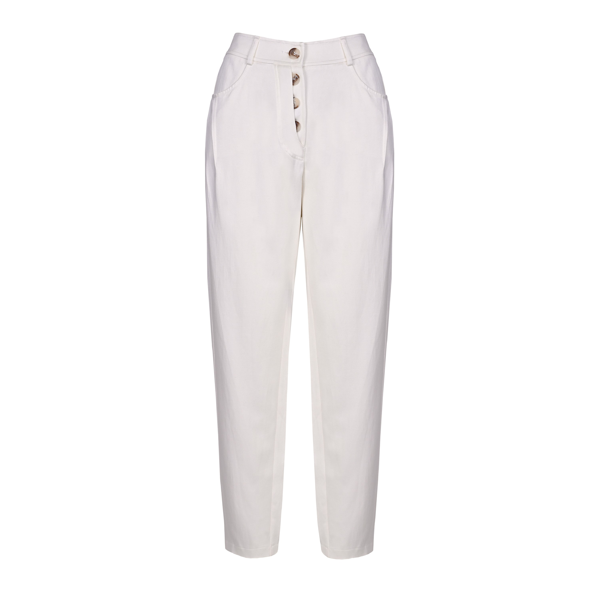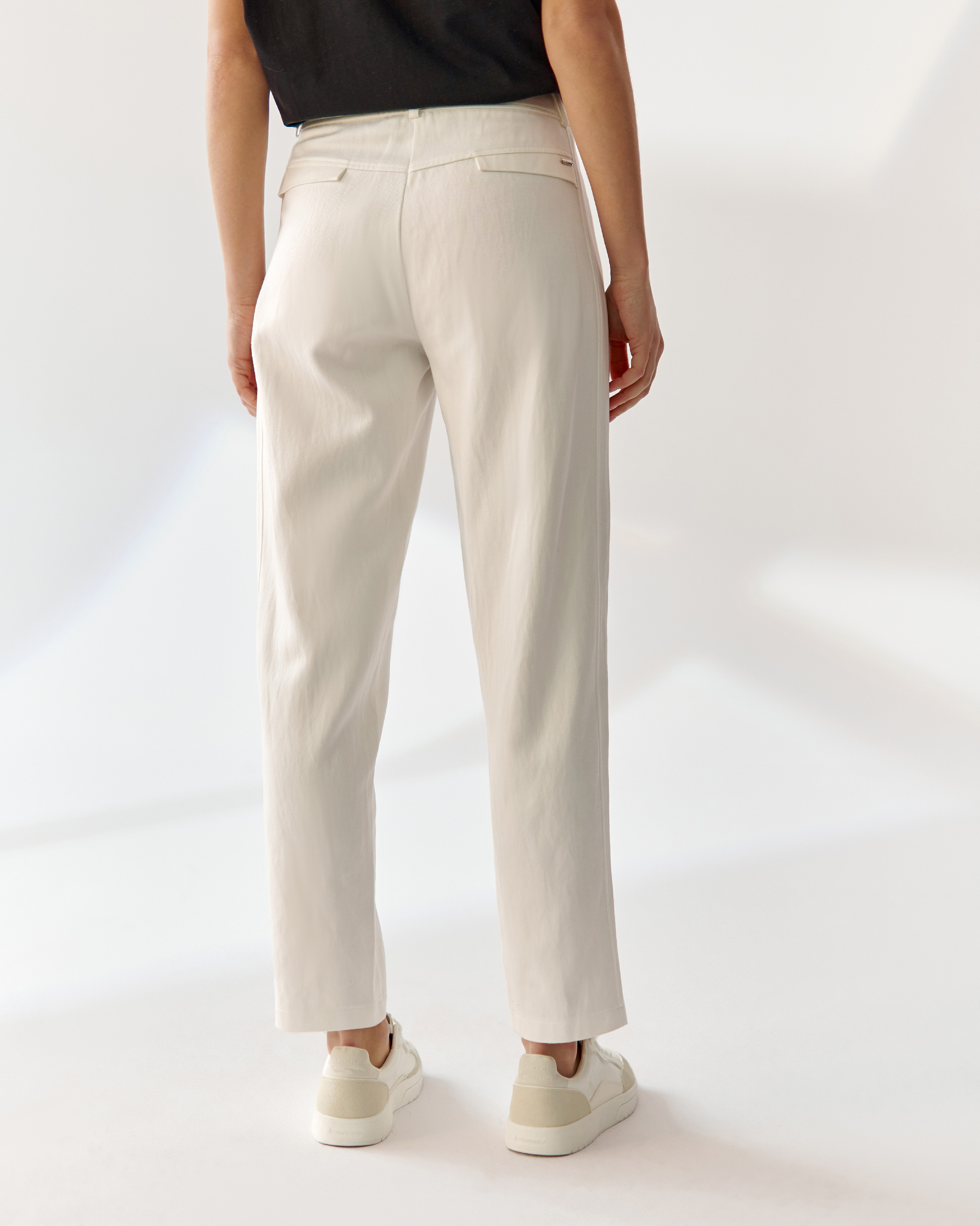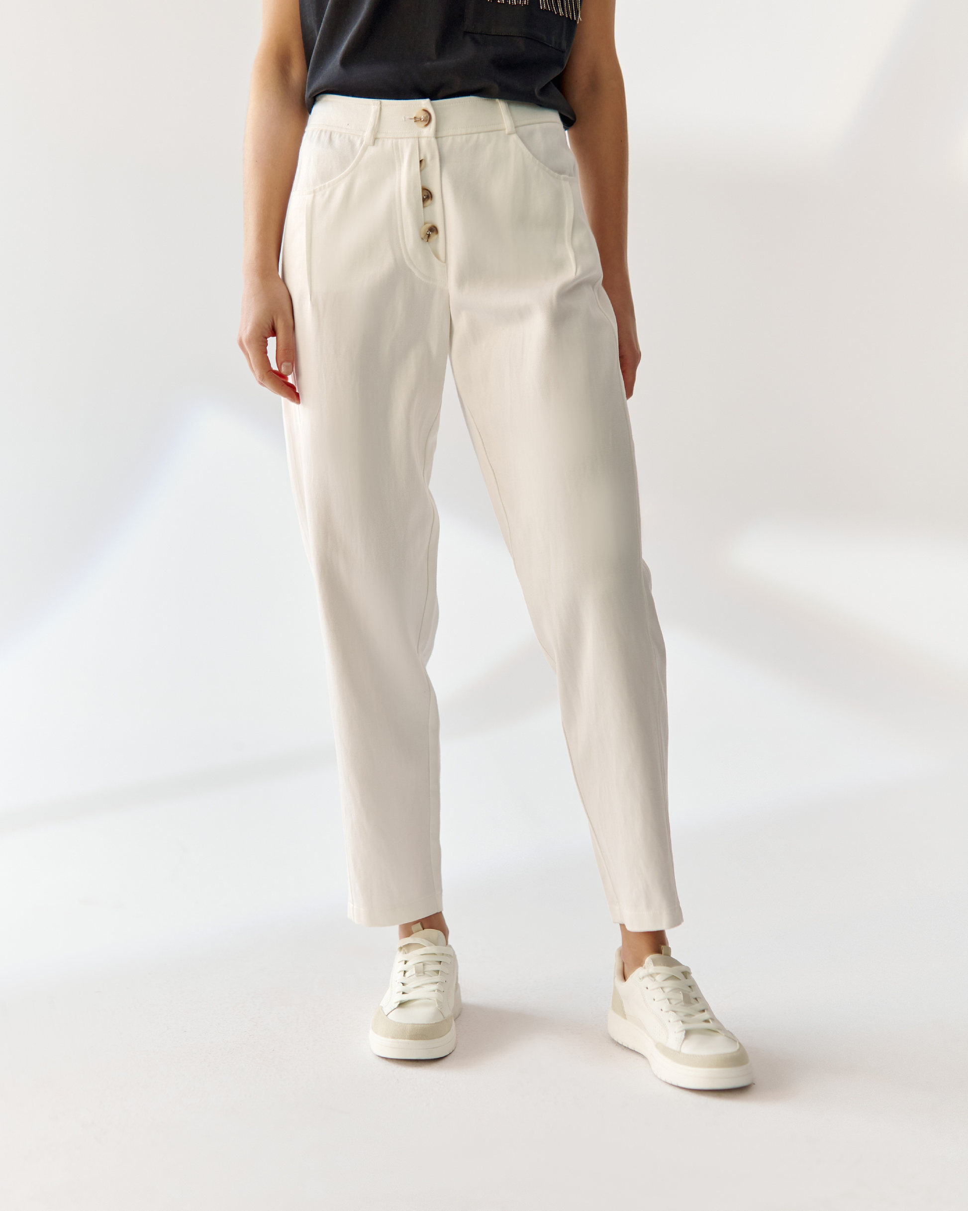 Inscrivez-vous à notre newsletter et obtenez une remise de 10% sur vos achatsPantalon blanc crème aux jambes amples et légèrement fuselées, indispensable dans toute garde-robe. Nous avons enrichi le modèle de coutures verticales sur les côtés des jambes, affinant optiquement la silhouette. Nous avons rehaussé les poches en biais sur les hanches avec des plis élégants. Nous avons rassemblé le tout avec une ceinture avec passants, qui permettent d'ajuster parfaitement le pantalon à la taille, et une fermeture éclair unique avec des boutons visibles et accrocheurs.