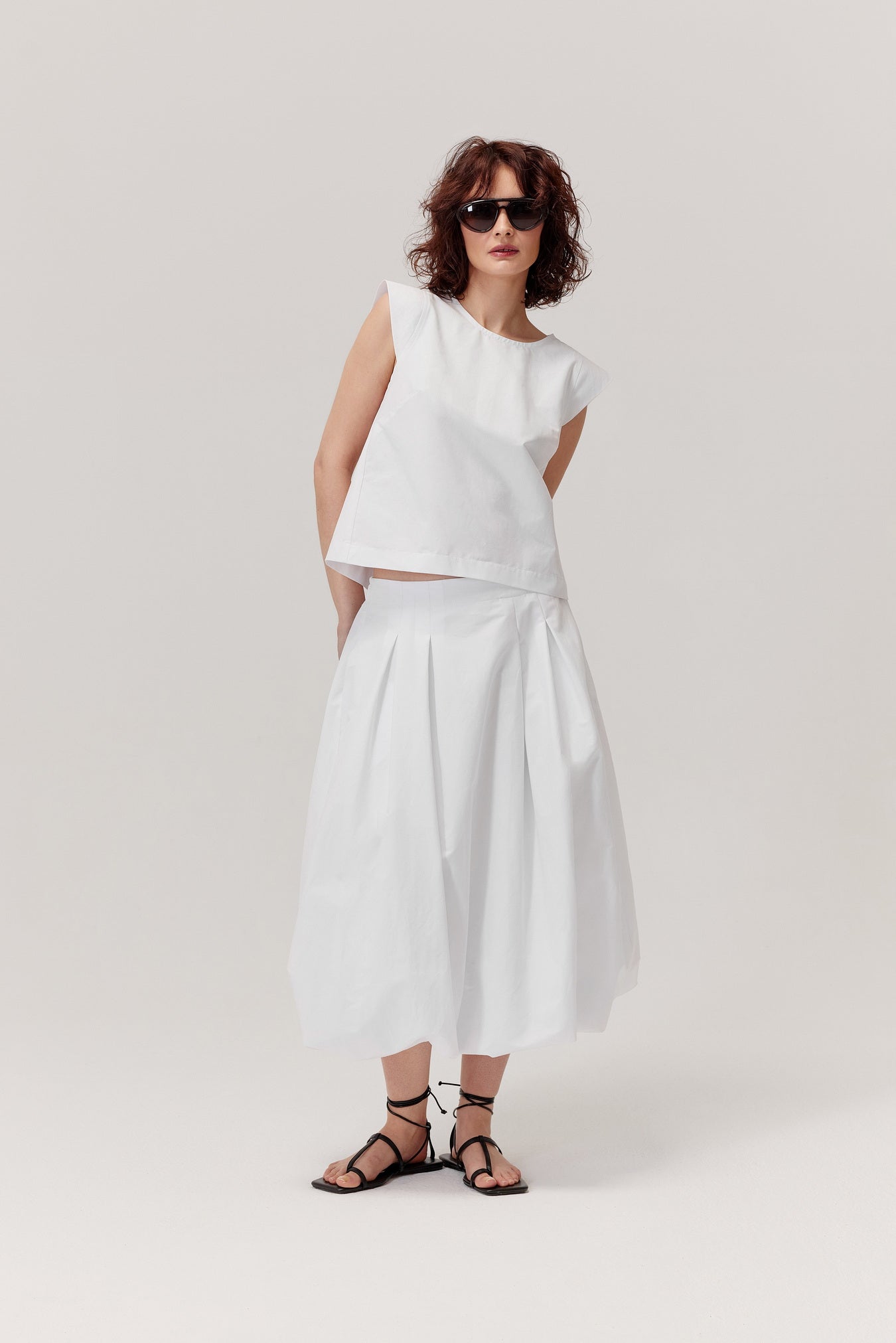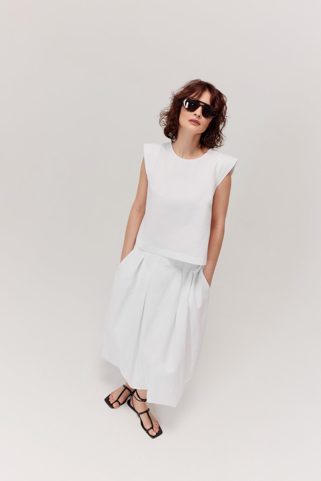 - „Boxy top” – czyli bluzka o krótkim, prostokątnym kroju, luźno opadająca, bez wcięcia w talii;