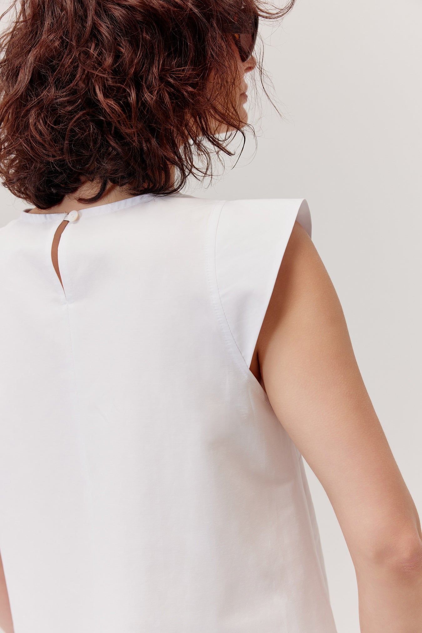 - Rękaw typu „cap sleeve” z efektem przedłużenia ramienia;