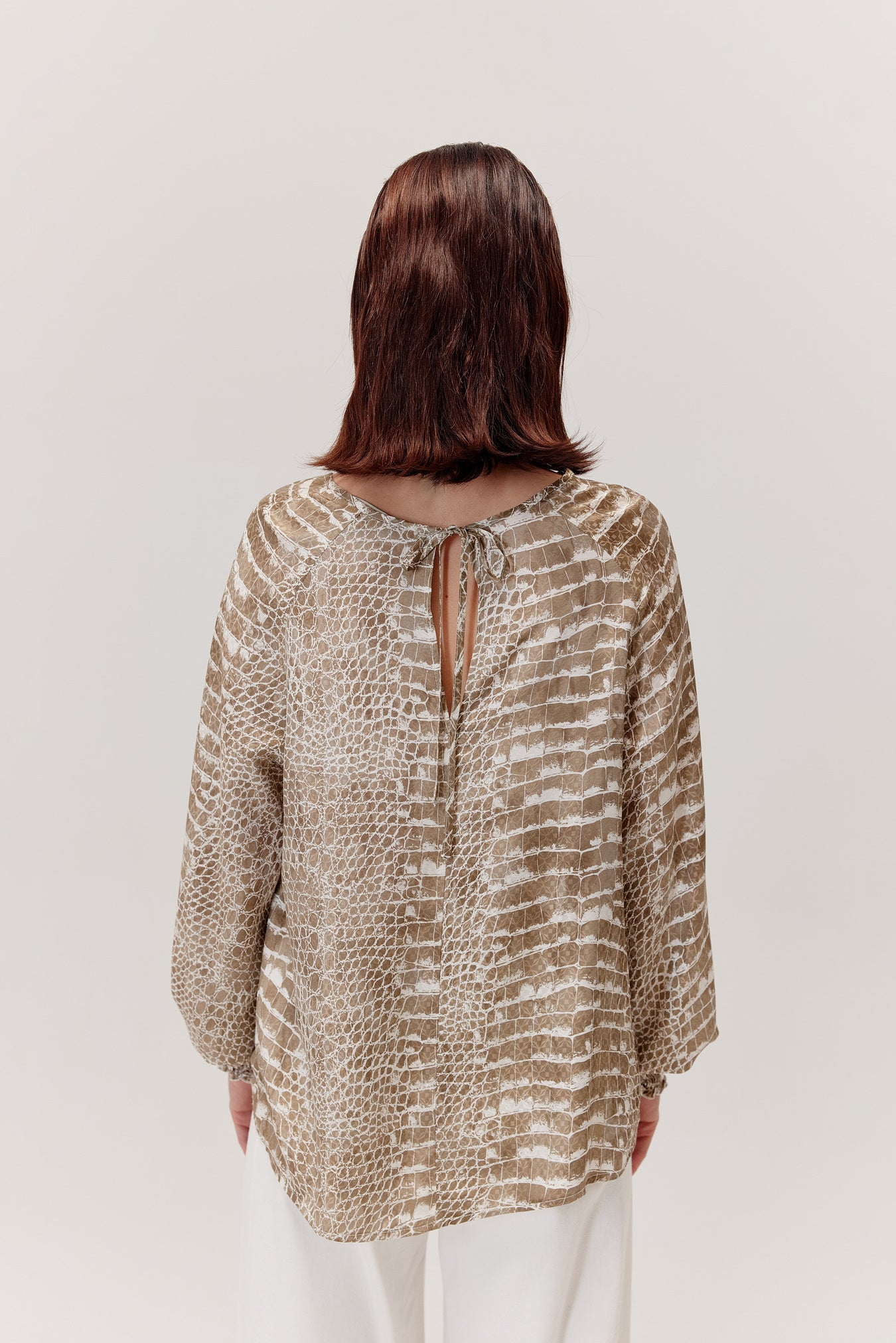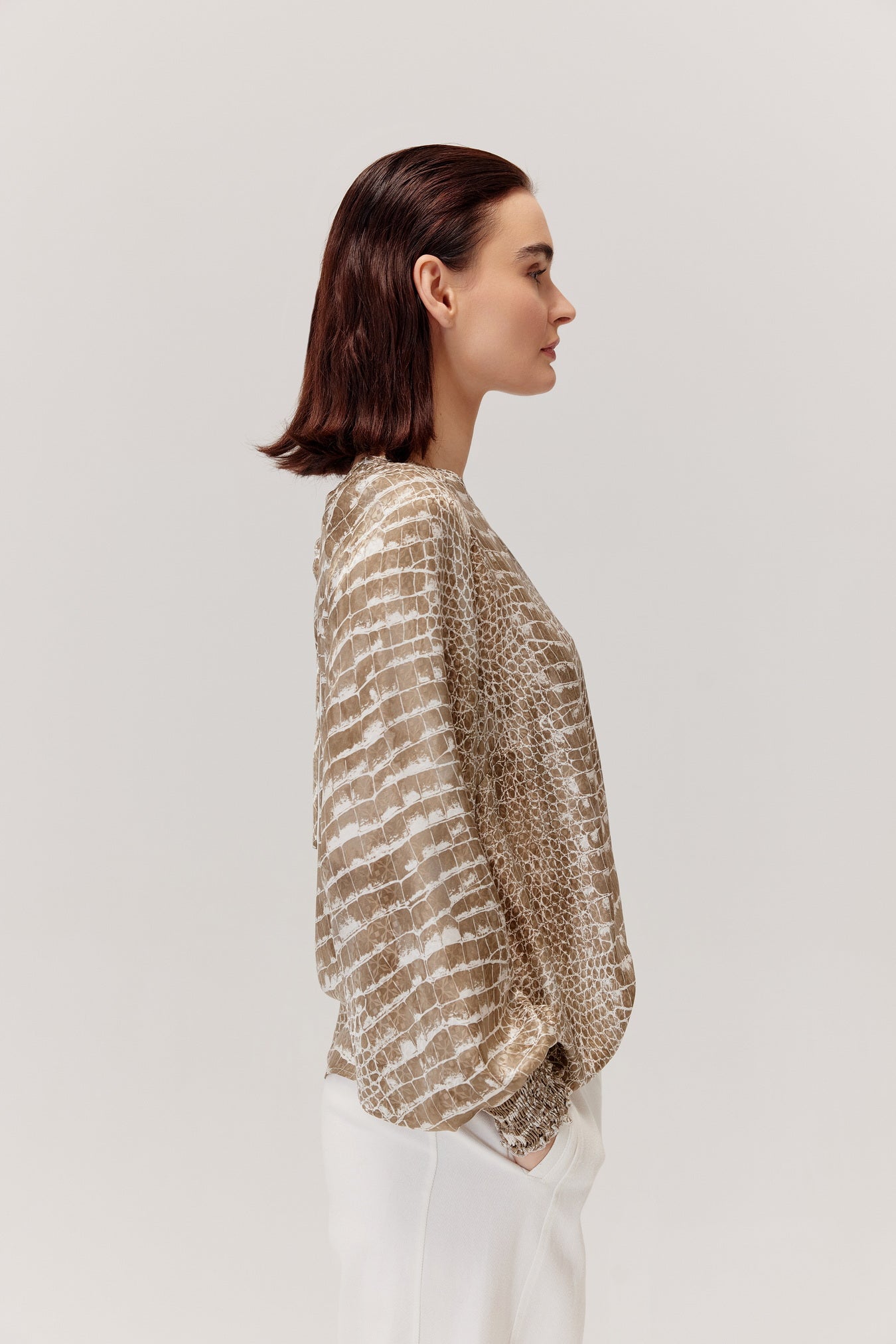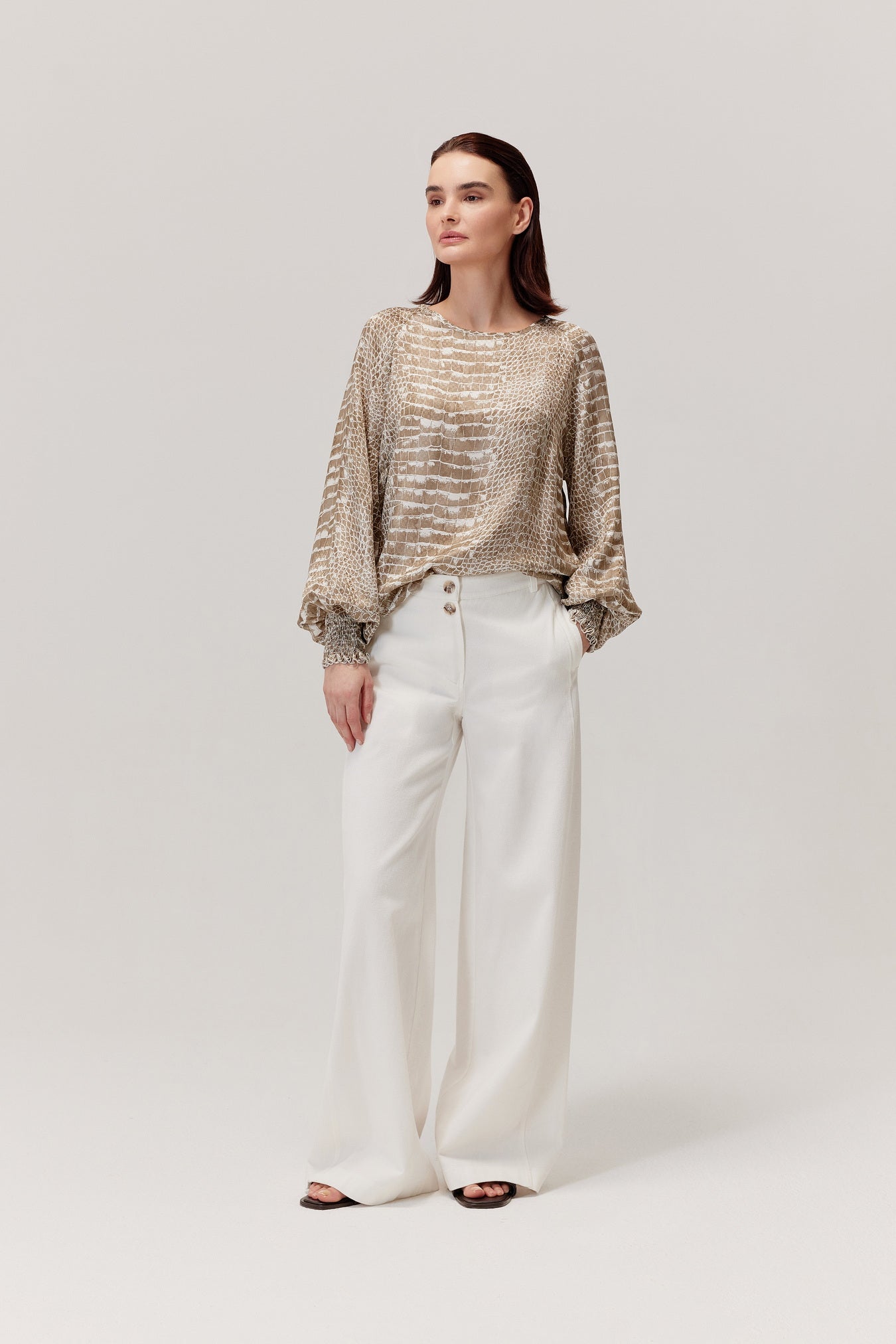 - lekka i przewiewna tkanina z domieszką jedwabiu – 65% wiskoza, 35% jedwab, zapewnia delikatność i przewiewność;