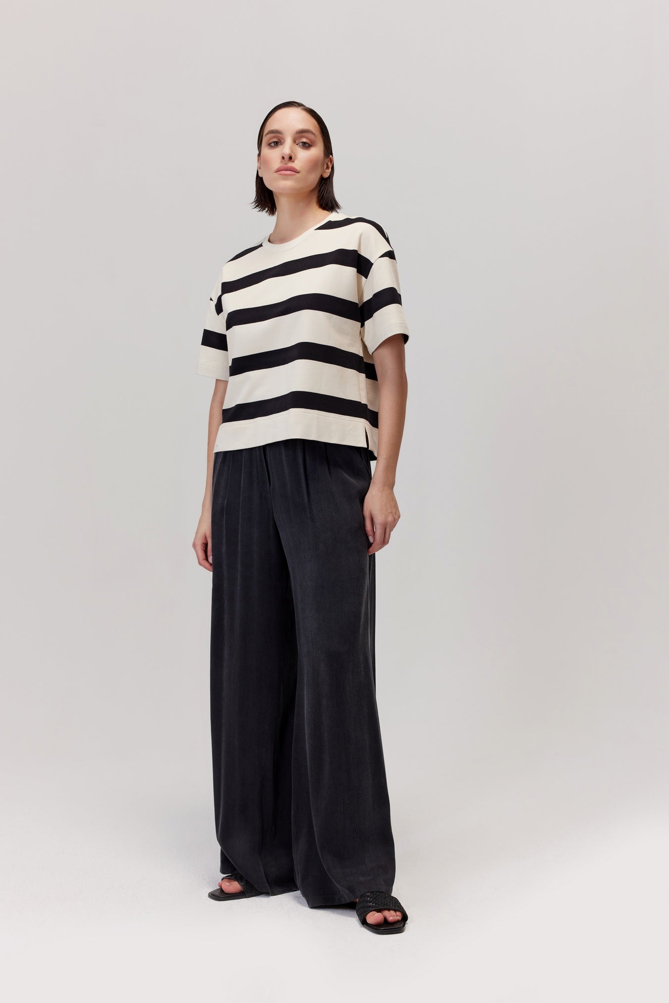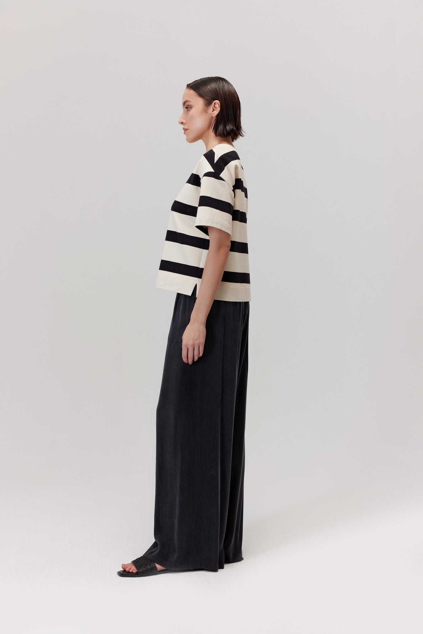 - Wzór: szerokie, poziome pasy w kolorze ecru i głębokiej czerni;