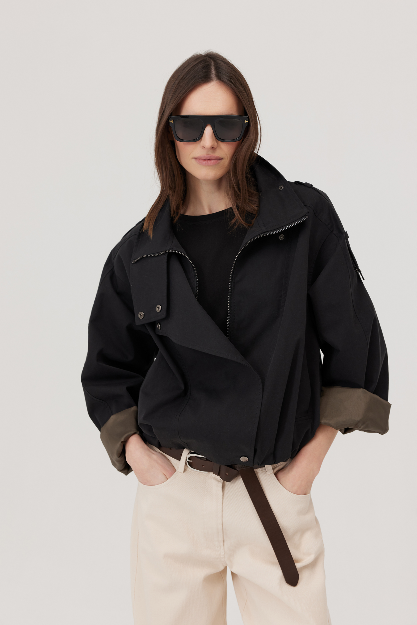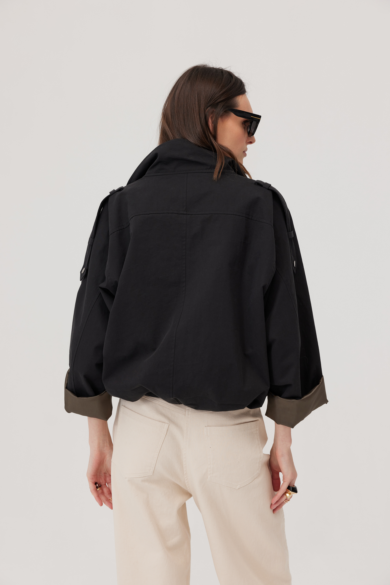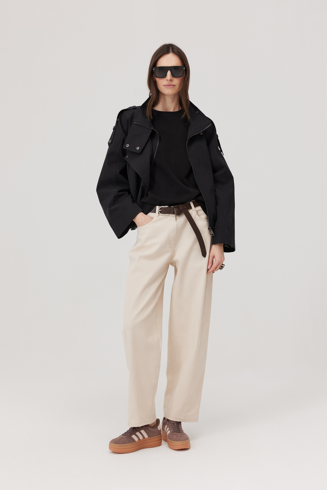 Zapinana na zamek ukryty pod szerokim panelem, wykończona stójką i pagonami na ramionach, subtelnie nawiązuje do klasycznych fasonów, ale we współczesnym wydaniu. Szerokie rękawy z podwinięciem oraz delikatne marszczenie przy dole dodają jej objętości i charakteru. To model, który dobrze równoważy proste formy — świetnie wygląda zarówno z dopasowaną górą, jak i szerokimi spodniami z kolekcji.
