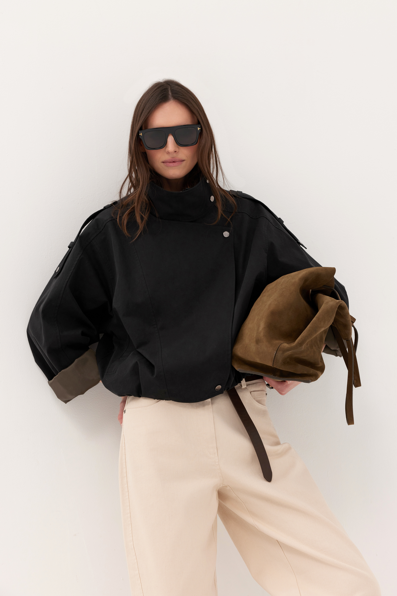 Kurtka Arni to oversizowy model ze stójką, który od razu nadaje stylizacji wyrazisty kierunek. Ma krótszą, lekko zaokrągloną formę z miękko zaznaczoną linią dołu, dzięki czemu nadaje sylwetce zdecydowany, miejski rys.