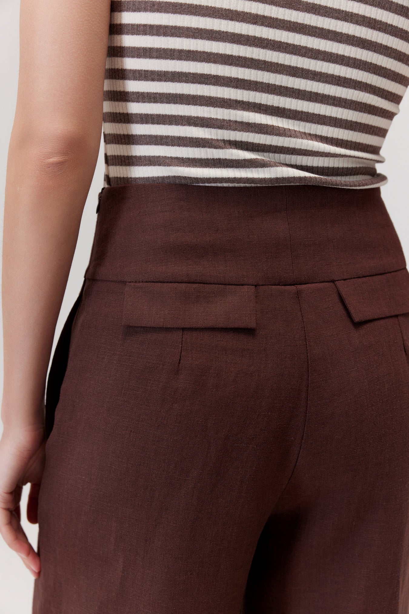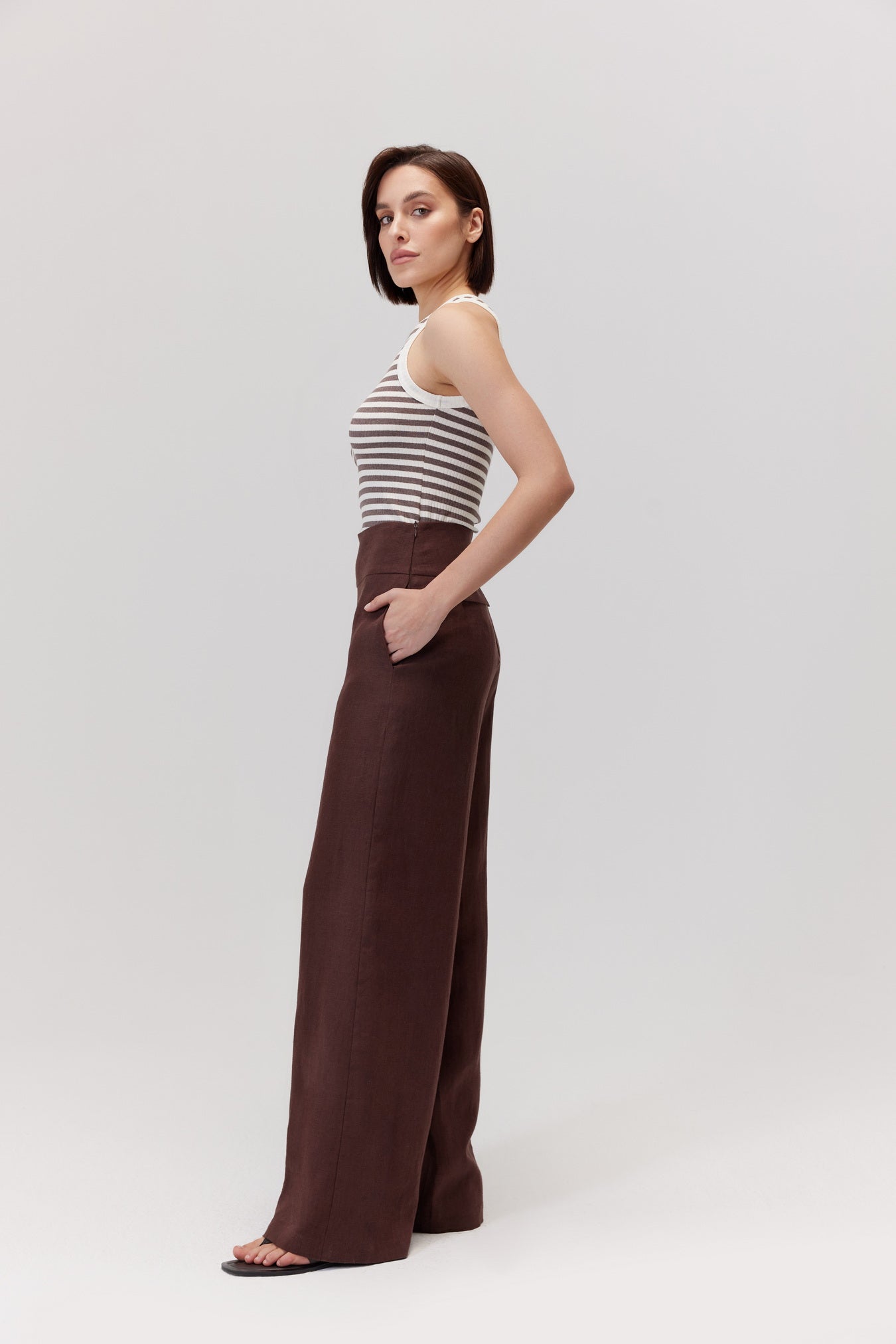 - Fason: szerokie spodnie typu palazzo z wysokim stanem;