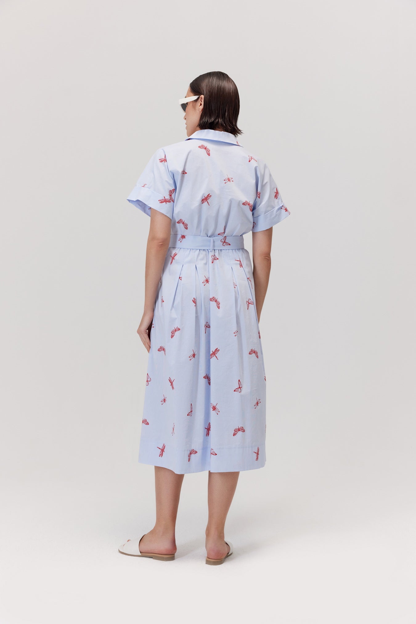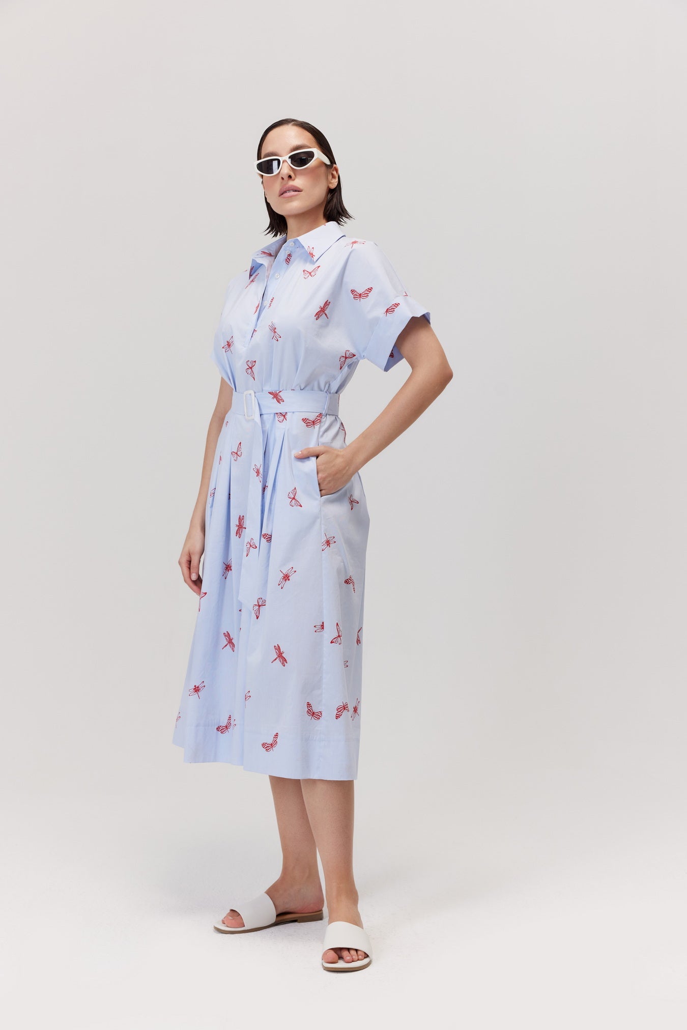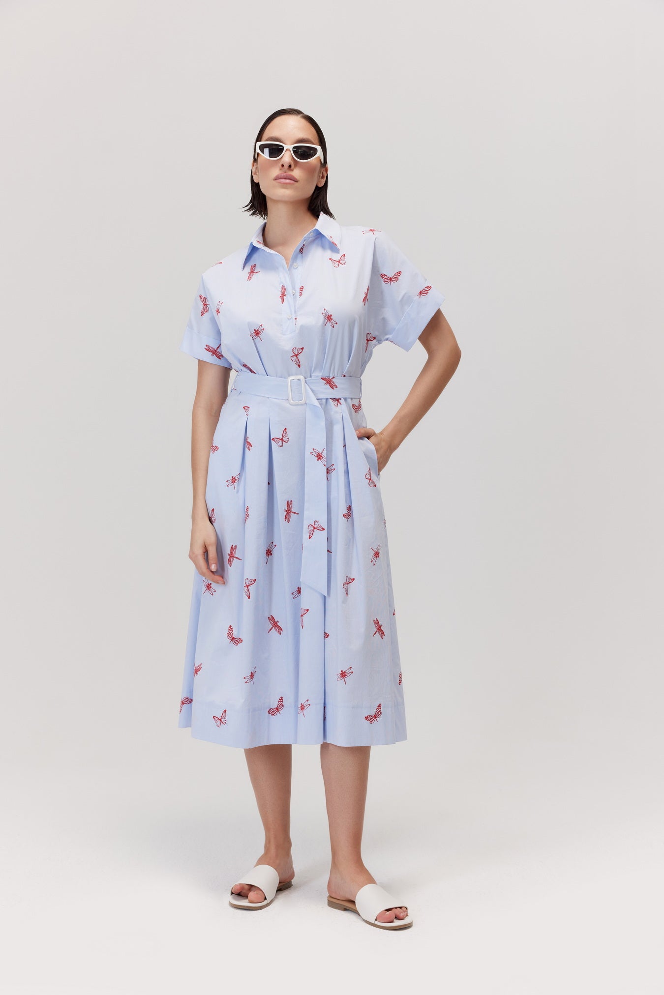 - Koszulowy krój połączony z rozkloszowanym dołem pięknie balansuje proporcje sylwetki, a błękitna tkanina ozdobiona drobnym nadrukiem czerwonych ważek przyciąga uwagę i wprowadza wakacyjny klimat;