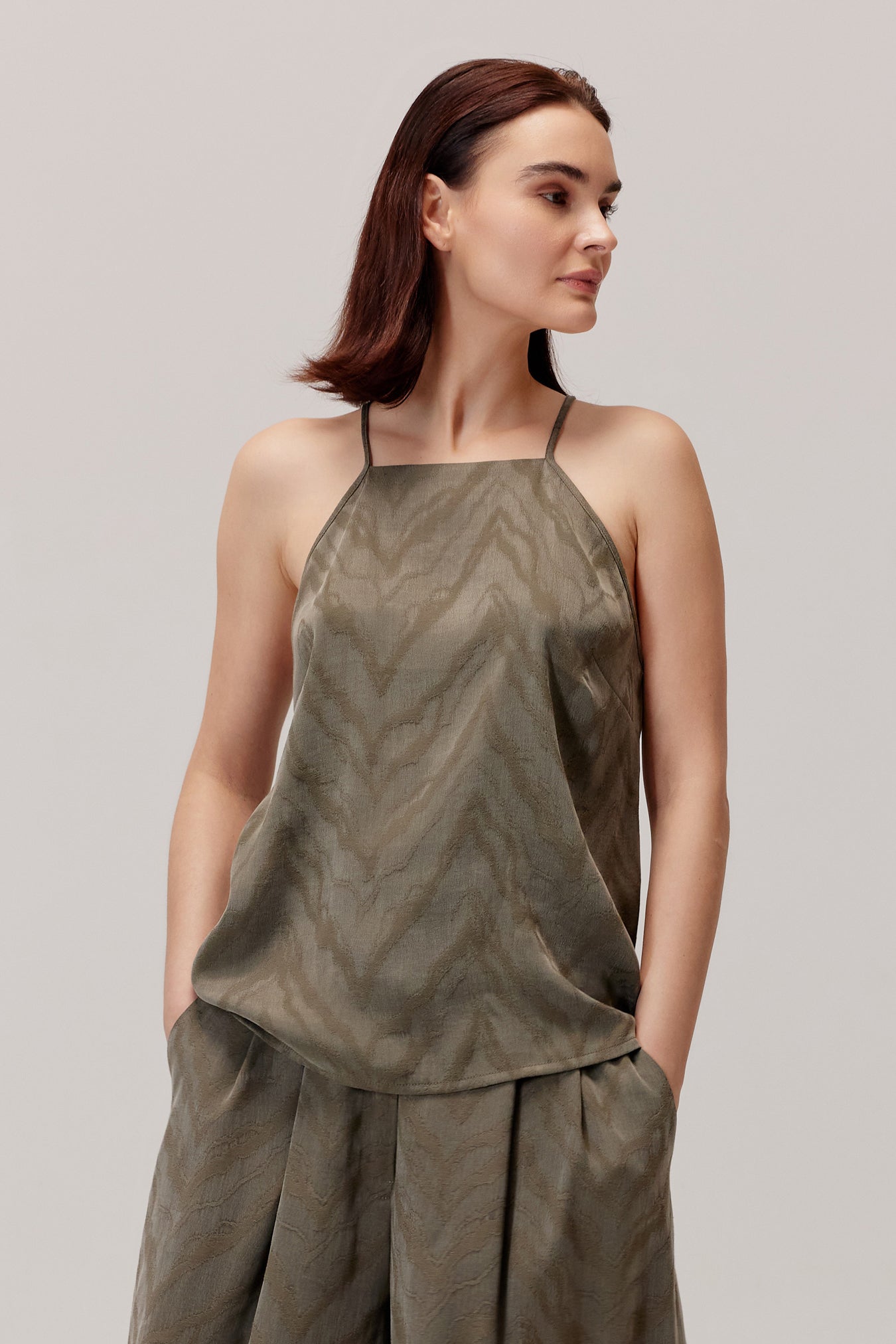 - Krój: Top o minimalistycznym kroju na cienkich ramiączkach, eksponujący ramiona.