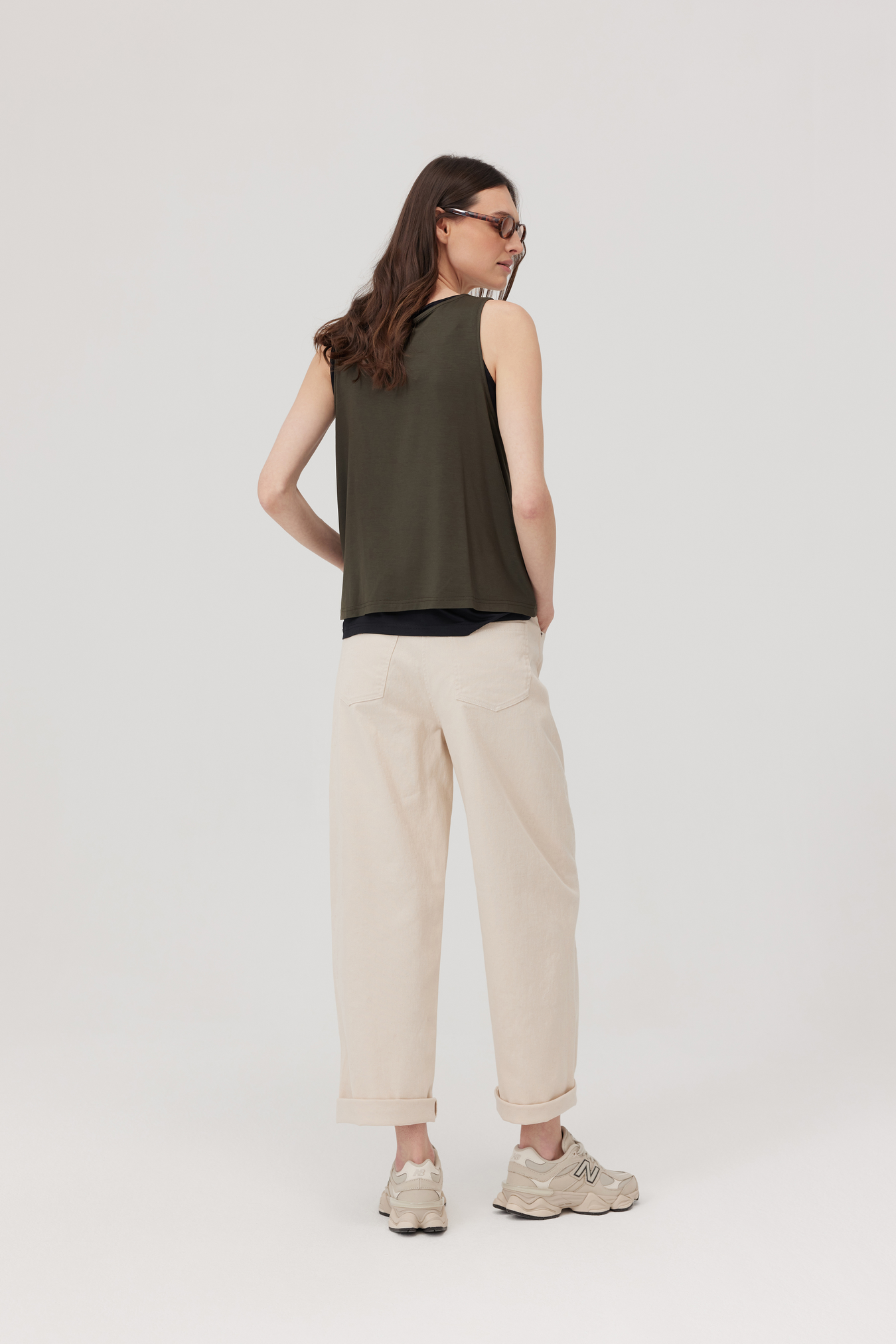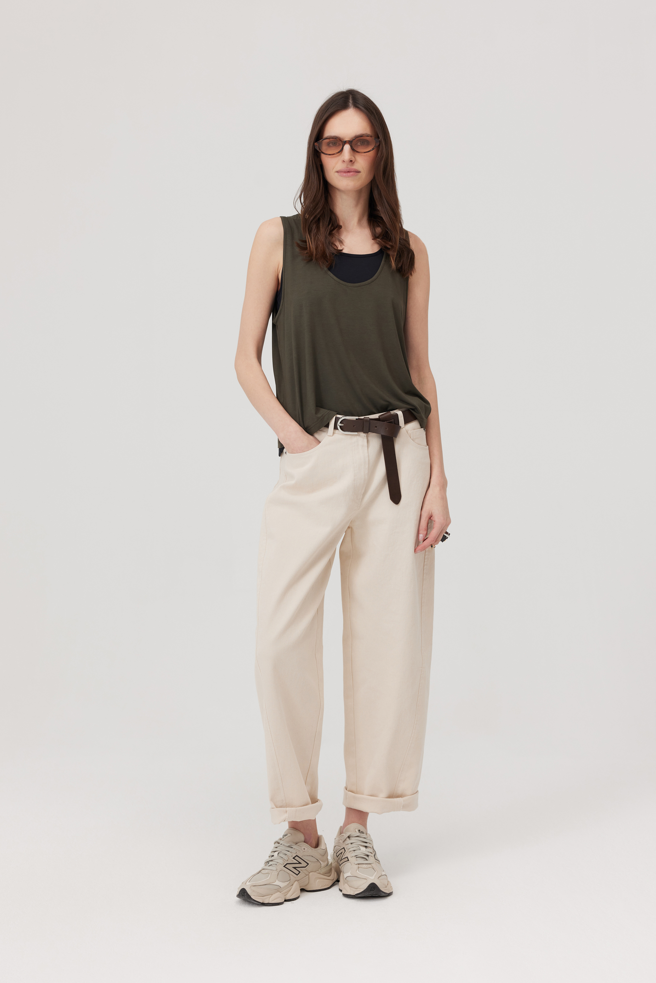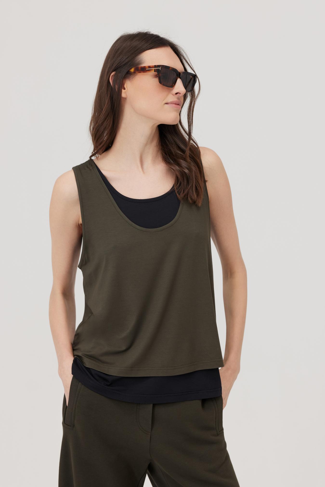 Dekolt ma miękki, zaokrąglony kształt, a luźniejszy fason swobodnie układa się na sylwetce. Boki nie są ze sobą zszyte, dzięki czemu top porusza się naturalnie i zachowuje lekkość. To prosta baza, która dzięki podwójnej konstrukcji zyskuje głębię i charakter.
