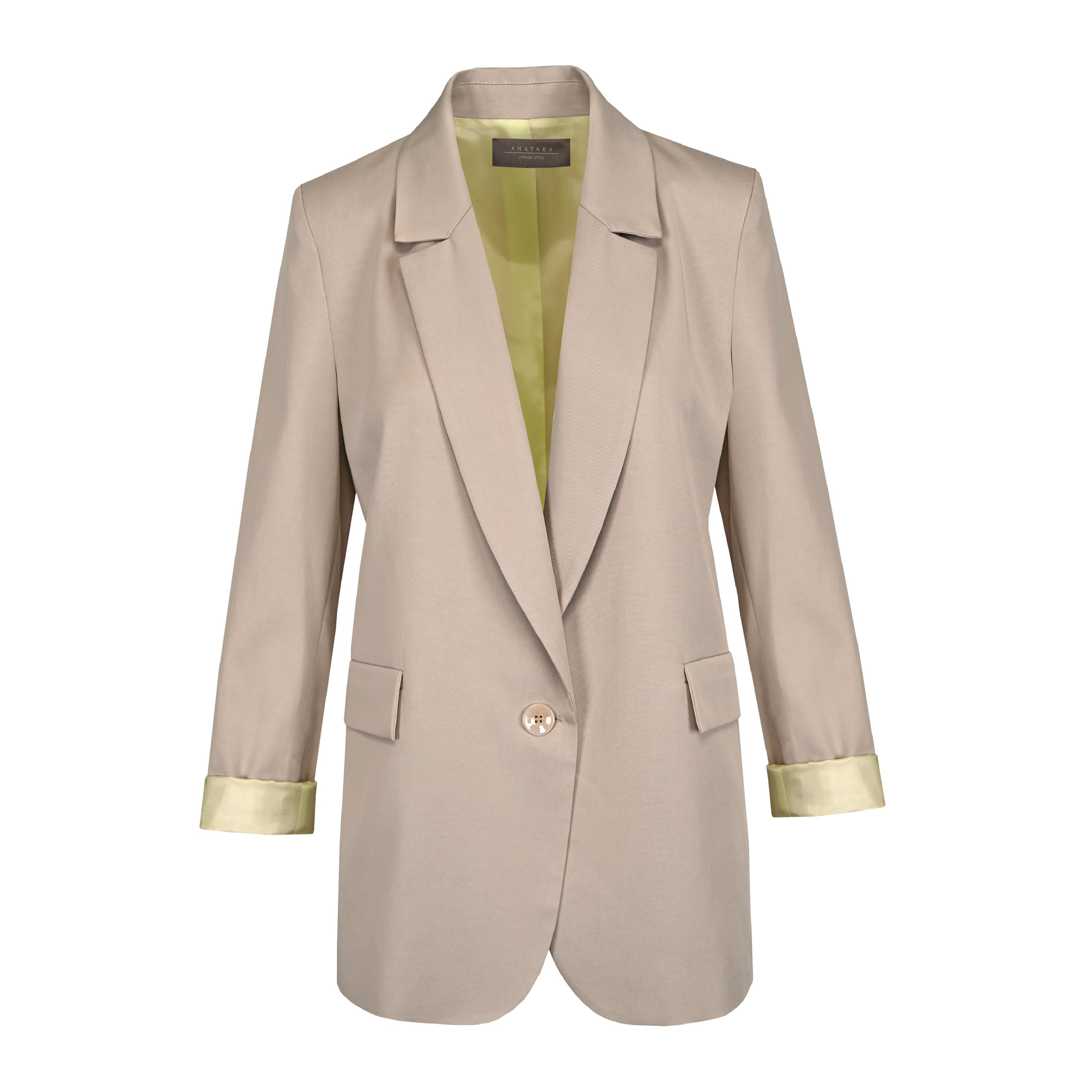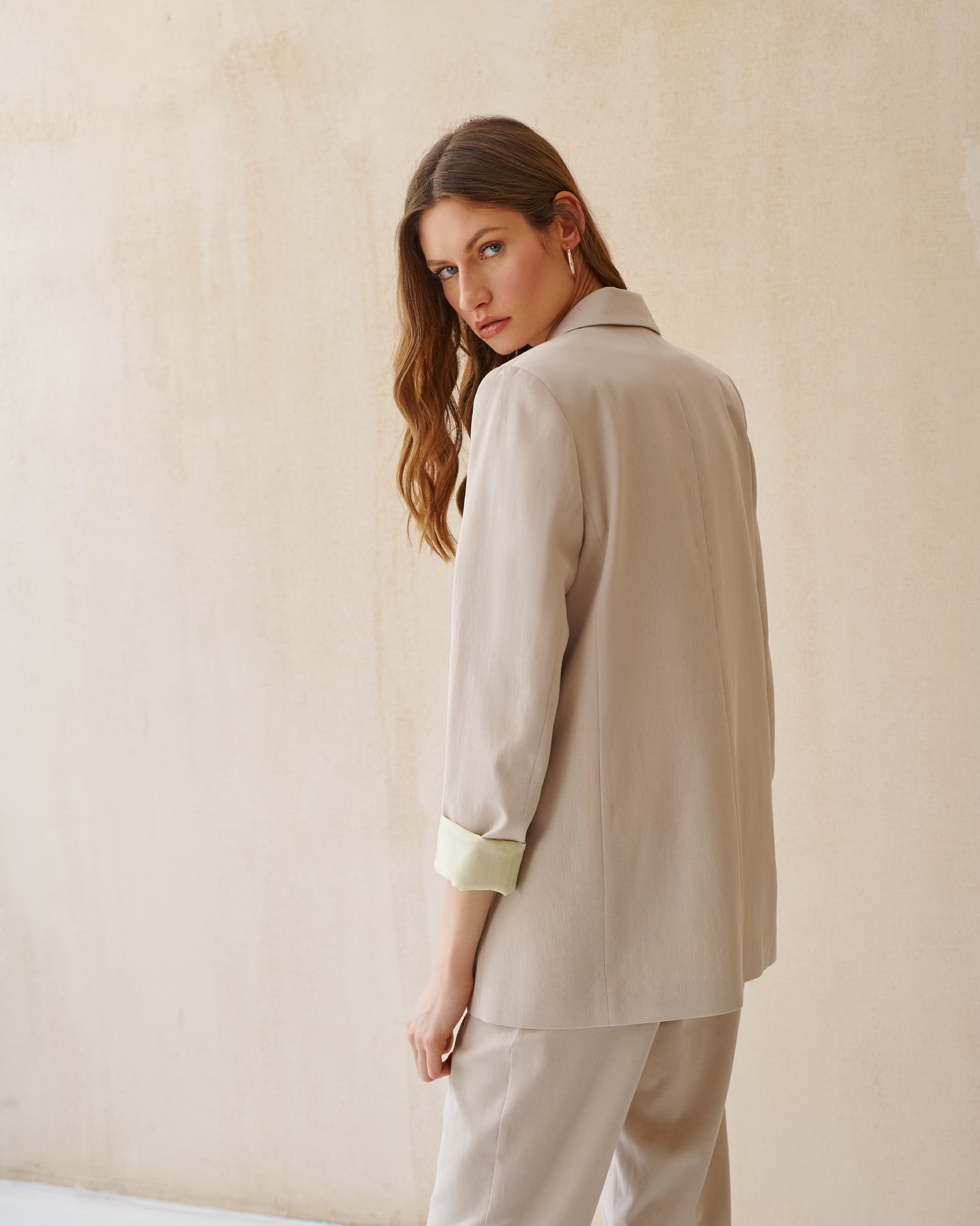 Zapisz się do newslettera i zyskaj 10% rabatu na zakupyMODOWY KLASYK - rewelacyjny, prosty żakiet w kolorze piaskowego beżu. Dekolt wyposażyliśmy w podwójny, rewersowy kołnierz wysmuklający optycznie sylwetkę. Na lini bioder dodaliśmy kieszenie z patkami. Całość zapinana na efektowny, alabastrowym guzikiem. Wnętrze rozświetla podszewka w kolorze pastelowej limonki z lekkim połyskiem.