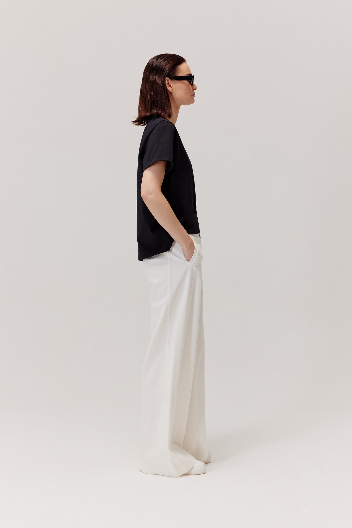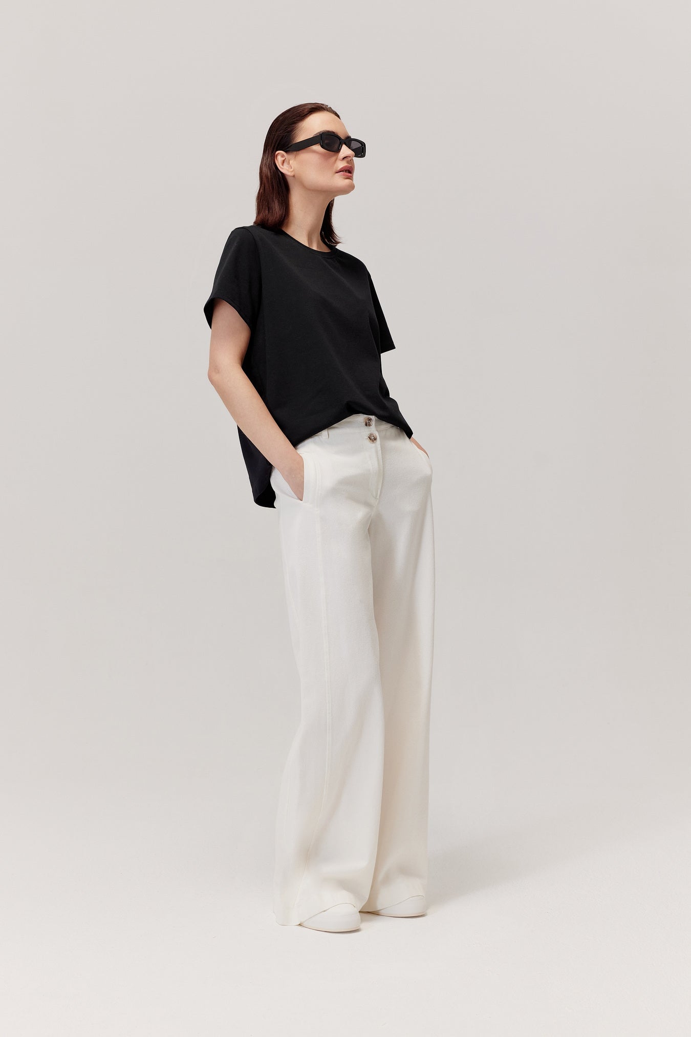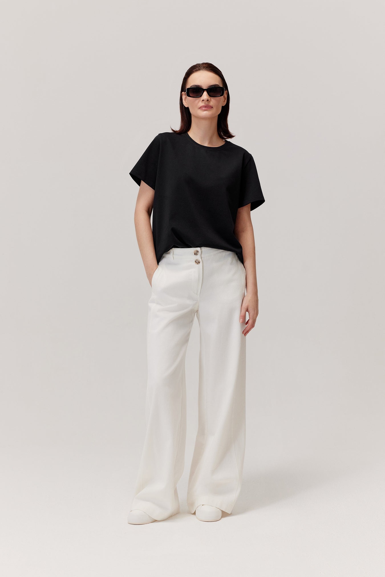 - Szeroka nogawka i minimalistyczny design sprawiają, że jeansy są doskonałym wyborem dla osób ceniących sobie prostotę i elegancję w każdej sytuacji.