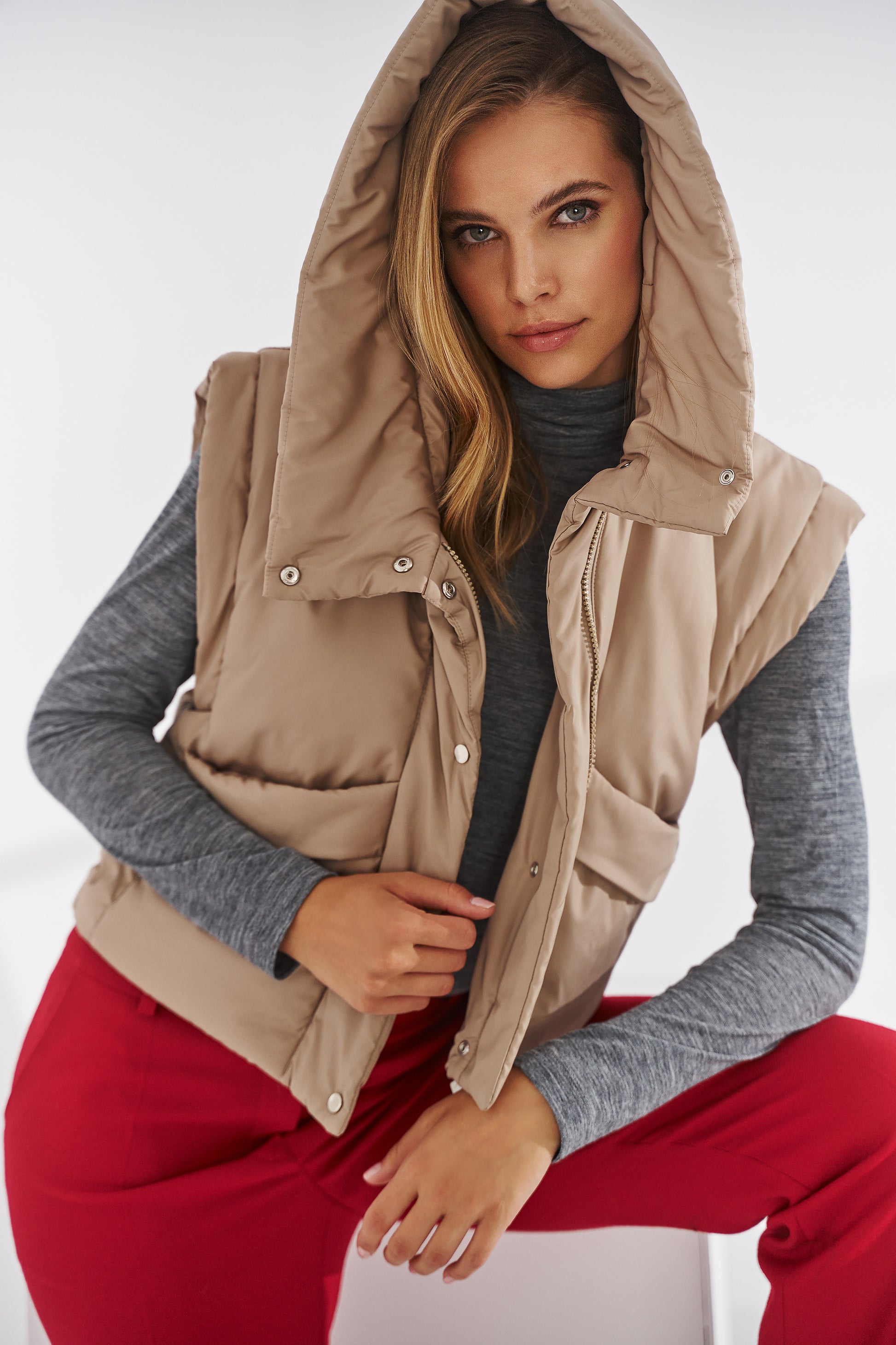 - Kolor: beżowa puchówka z kapturem to ciepły akcent kolorystyczny idealny na ciemne, szare dni.