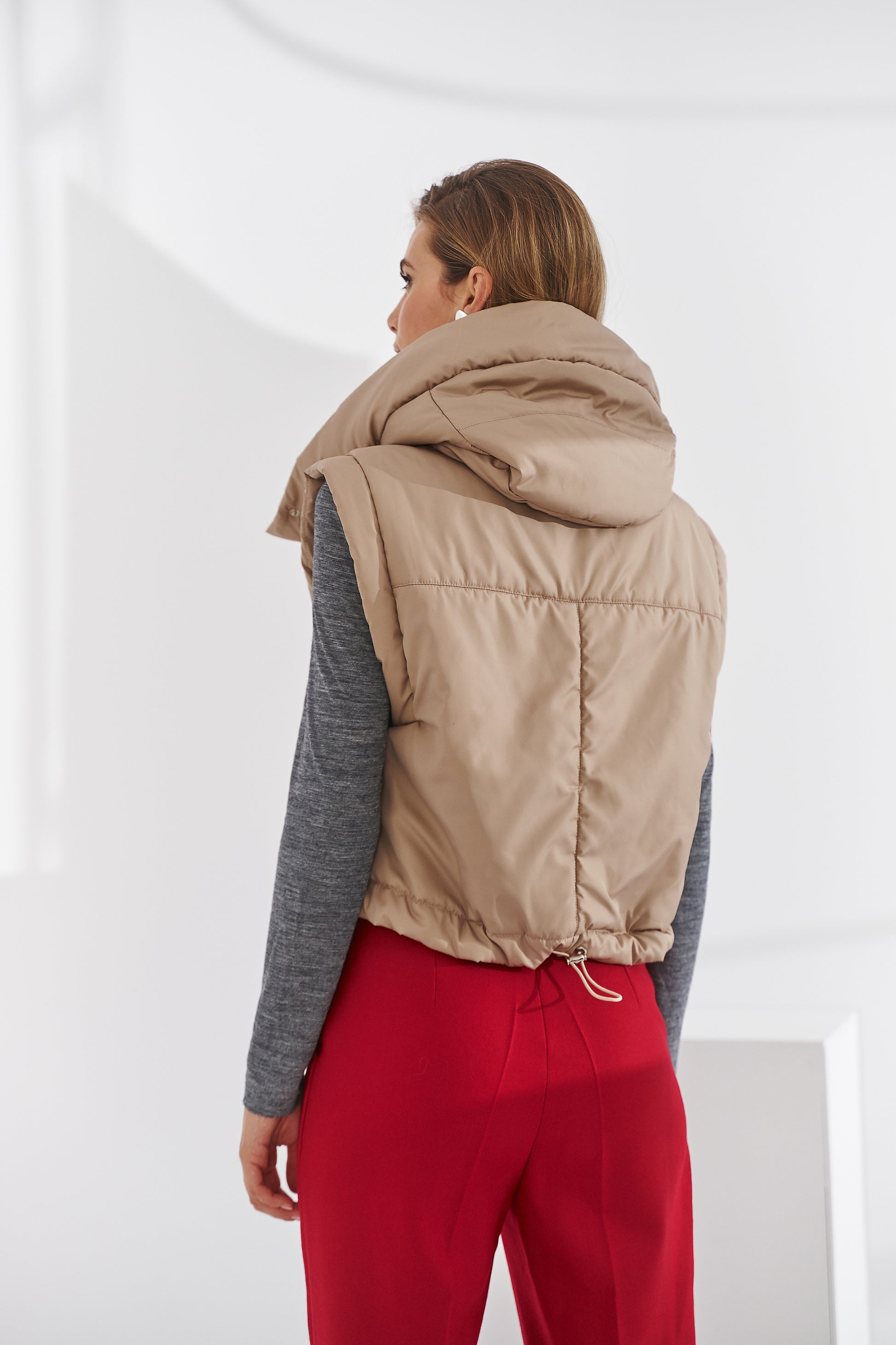 - Wzór: w przeciwieństwie do wielu innych puchowych kamizelek ta ma nowoczesną formę dzięki linii kieszeni i kapturowi.