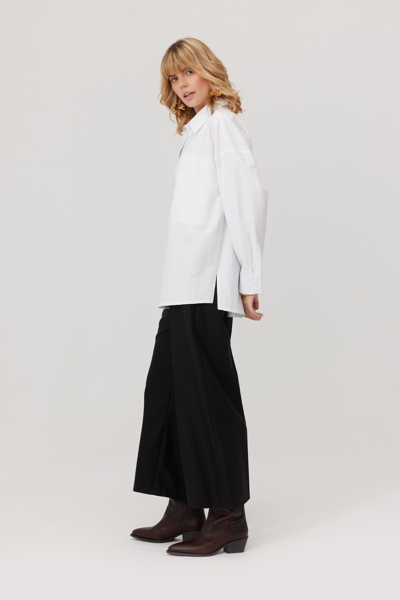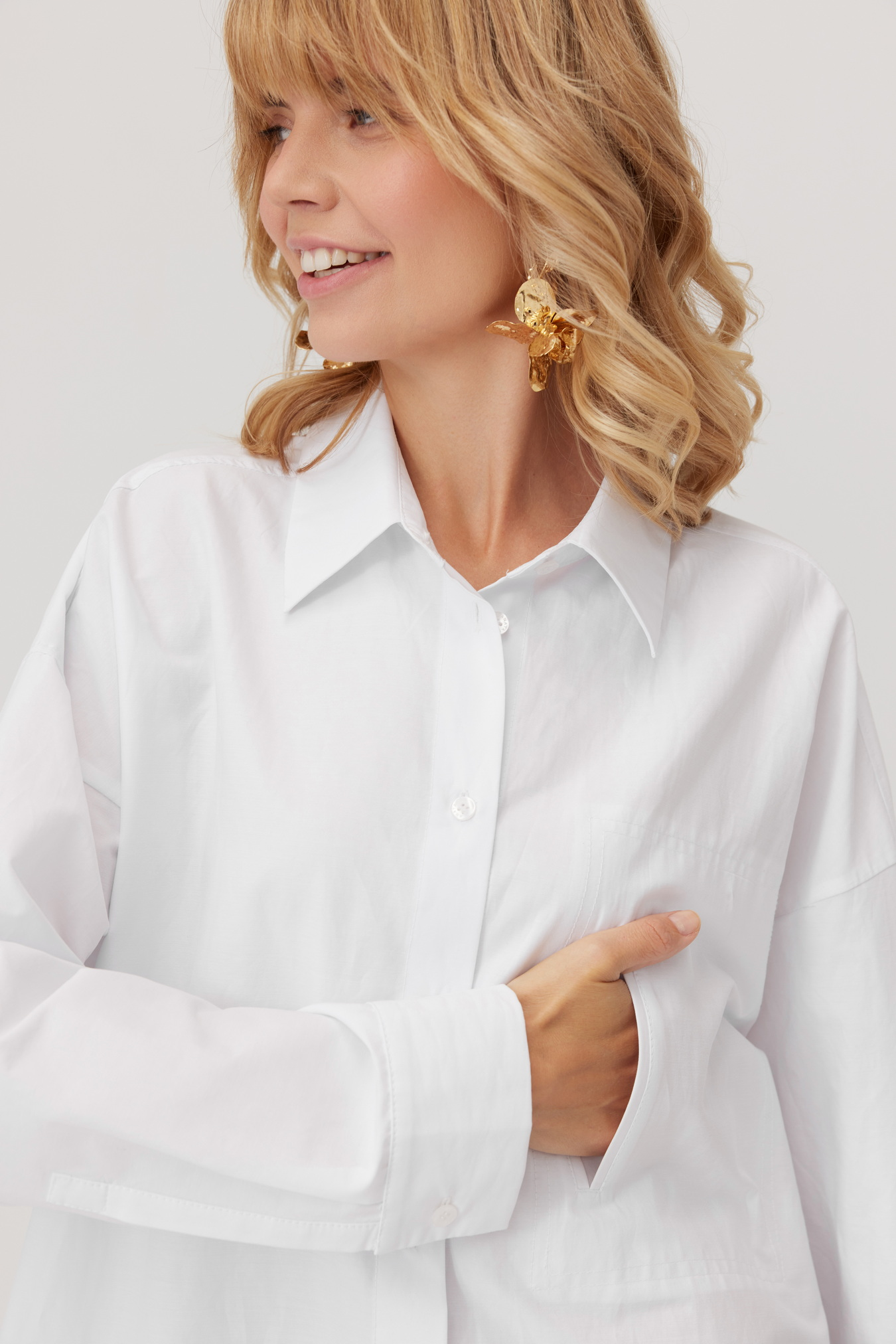 Zapisz się do newslettera i zyskaj 10% rabatu na zakupyLuźna koszula damska Lorris z bawełnianej popeliny to klasyczny, wygodny fason do wielu stylizacji. Oryginalna, duża kieszeń z przodu i szerokie mankiety nadają koszuli nowoczesny, miejski charakter. Obniżone ramiona i delikatnie zaokrąglony dół z bocznymi rozcięciami zapewniają swobodę i ciekawy wygląd. Koszula świetnie prezentuje się wsunięta w spodnie jak i noszona na zewnątrz. Uniwersalna biel i komfort bawełnianej koszuli damskiej sprawiają, że to model idealny na każdą porę roku. Sprawdzi się jako luźna koszula do pracy i baza do casualowych stylizacji na codzień