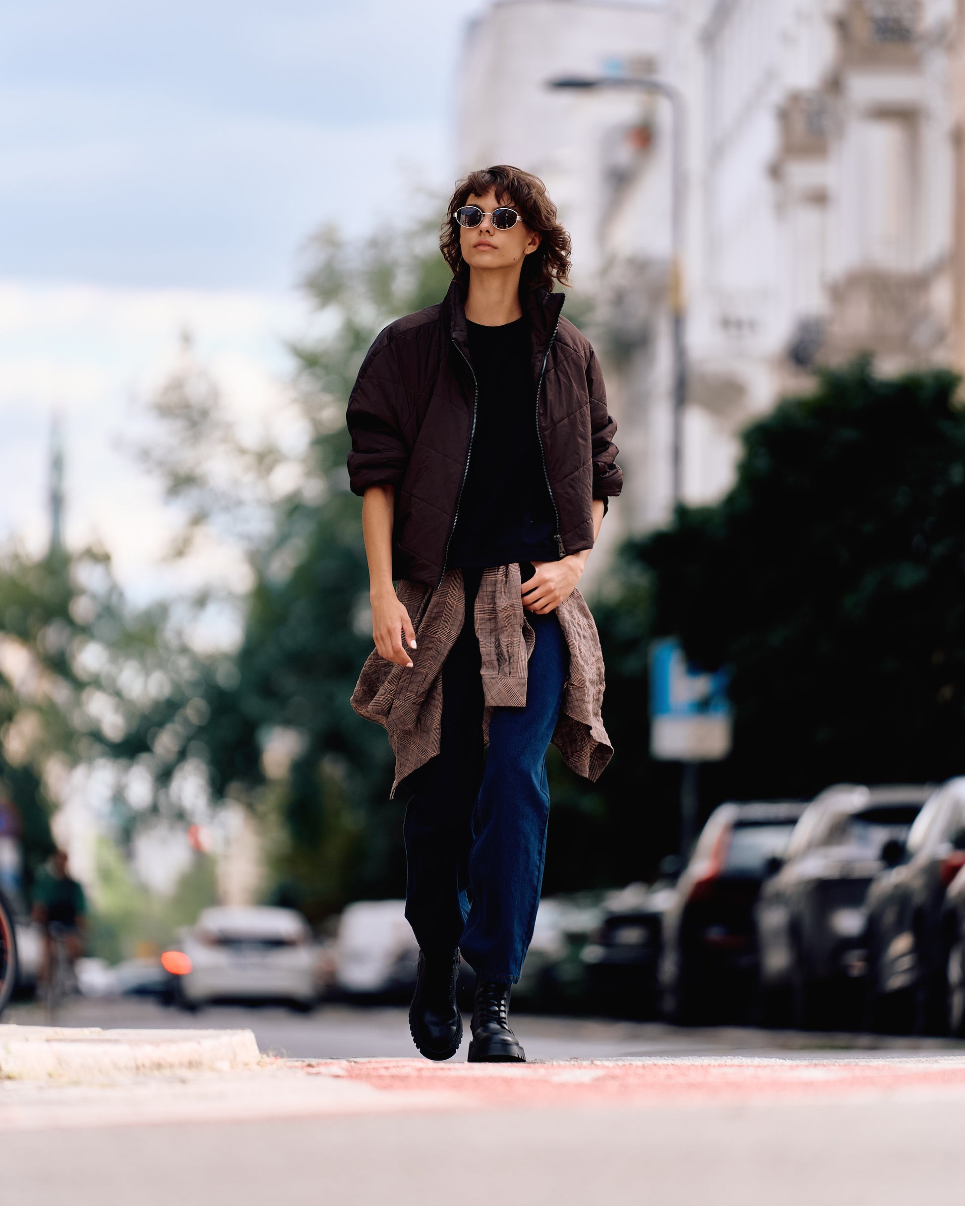 Luźniejszy fason świetnie współgra z grubym swetrem czy golfem. To wszechstronny model na co dzień: lekki, wygodny i łatwy do zestawienia z jeansami, spódnicą midi lub sukienką