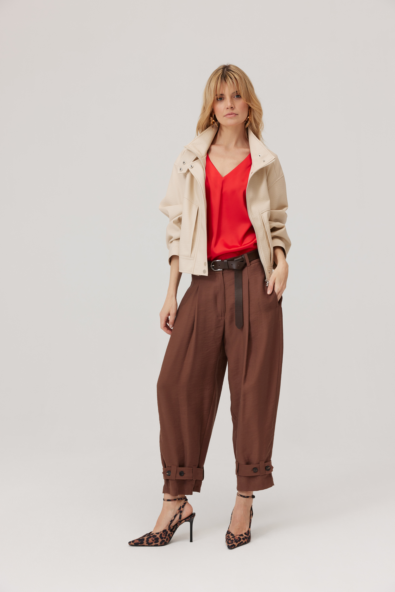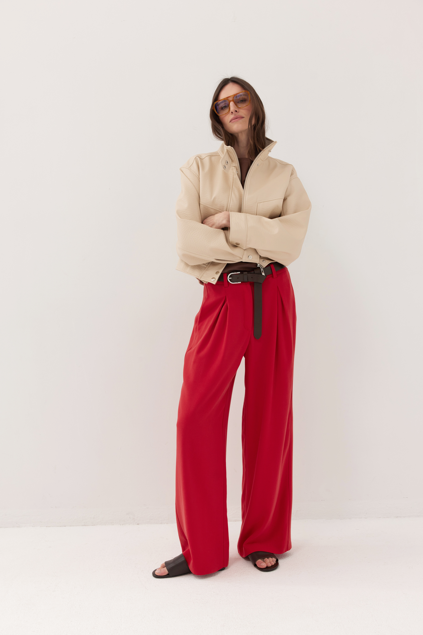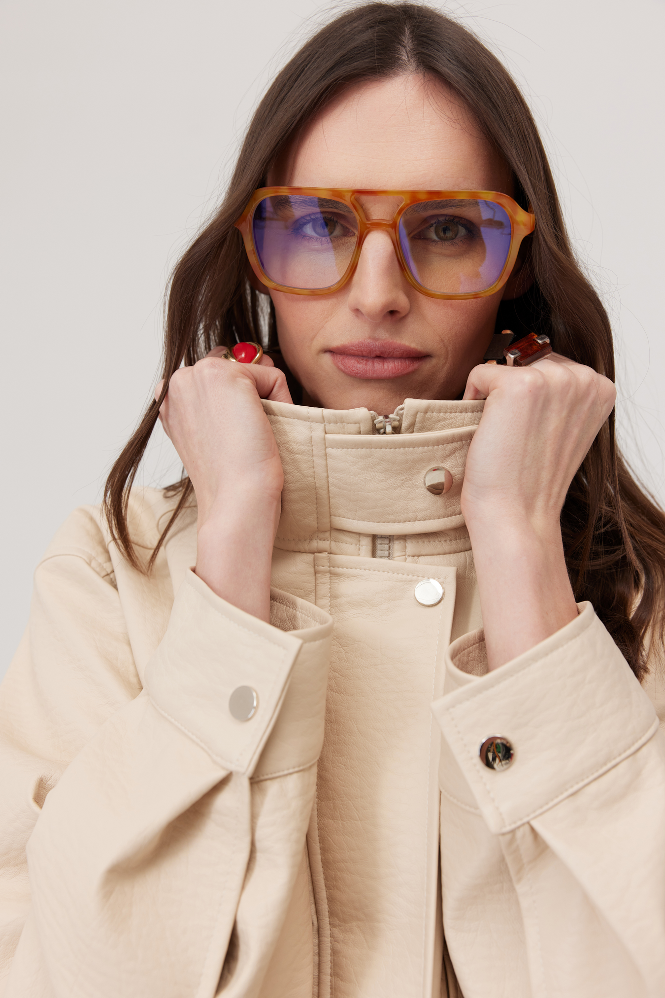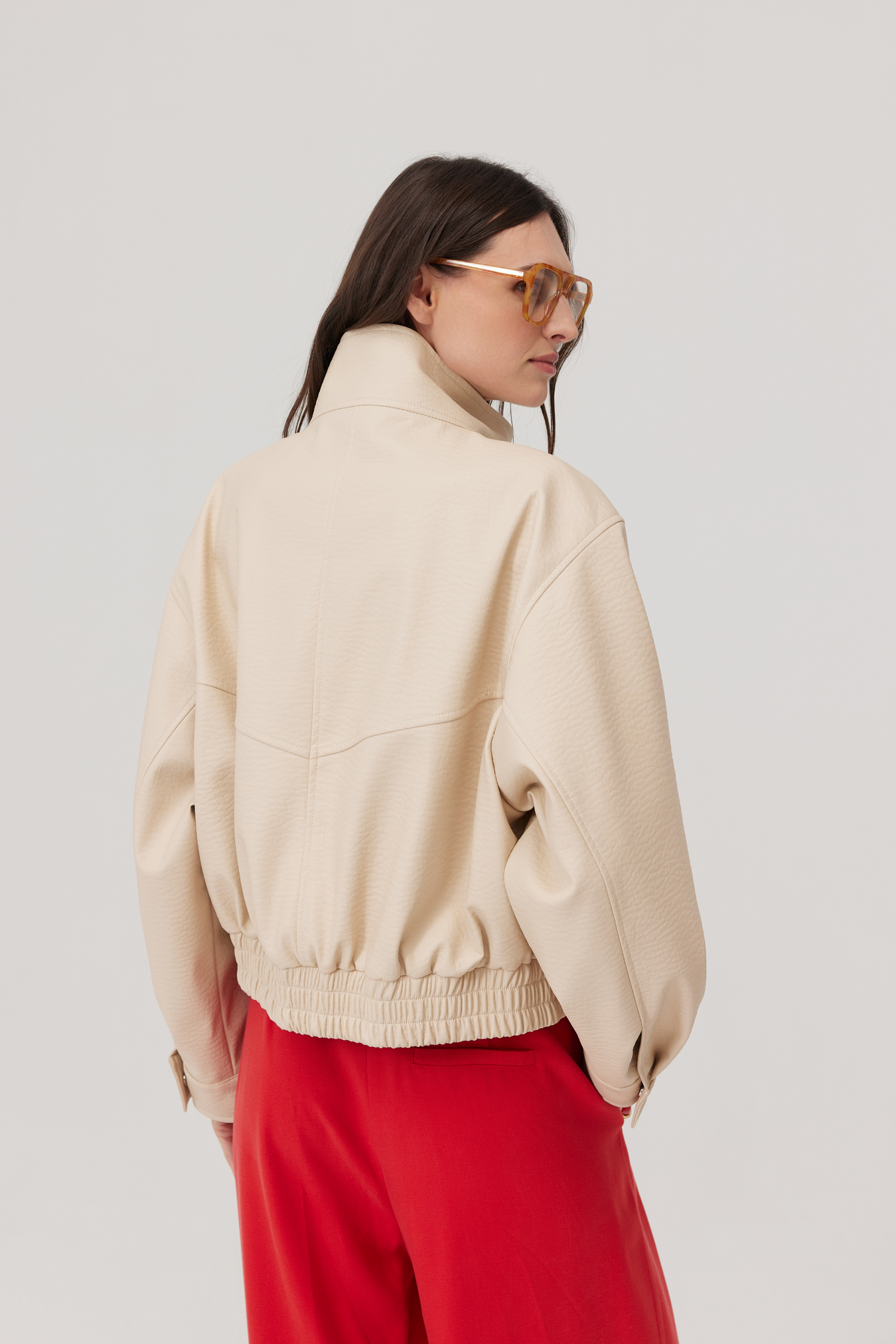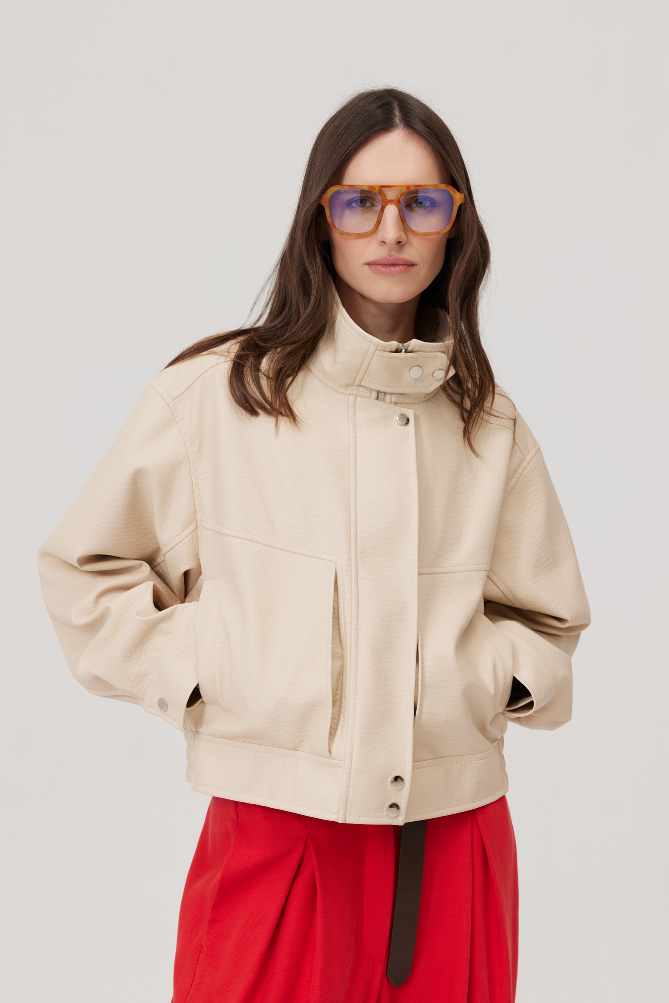 Kurtka Haley to krótki model z ekoskóry o lekko pudełkowej formie, która zachowuje minimalistyczną, nowoczesną linię. Przód jest czysty i prosty — to detale sprawiają, że kurtka zyskuje charakter.