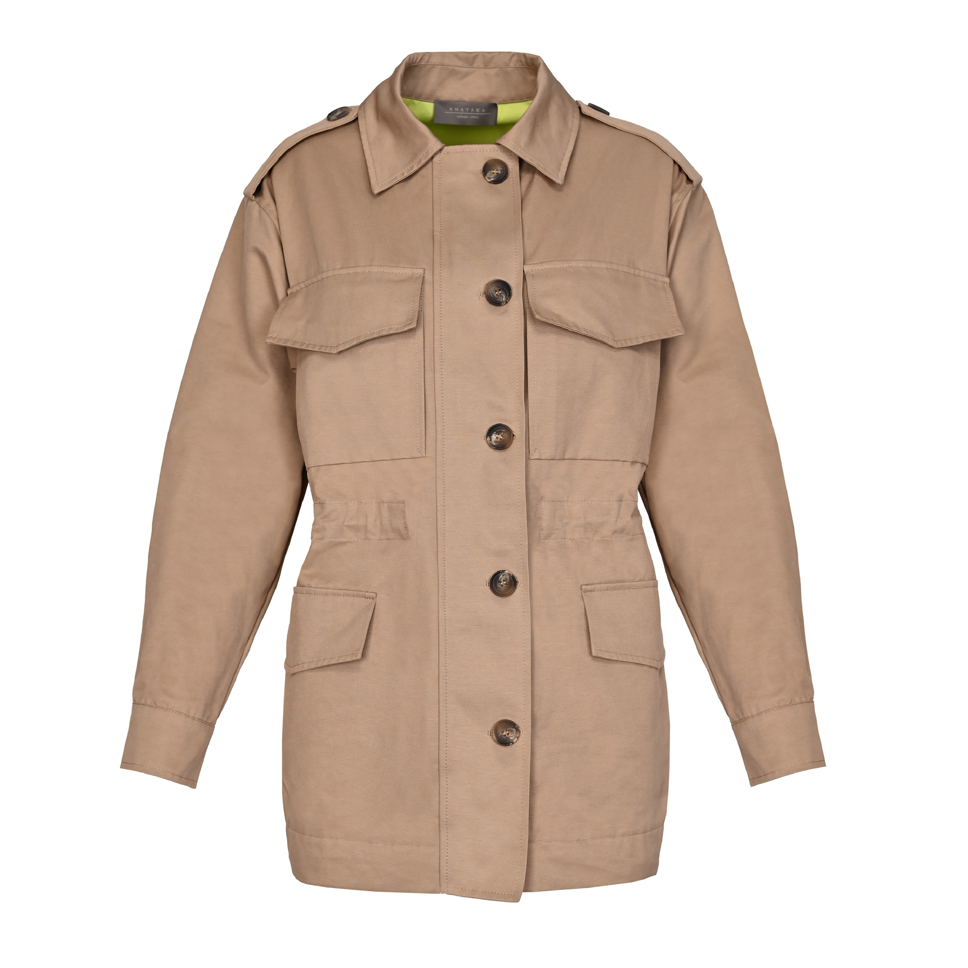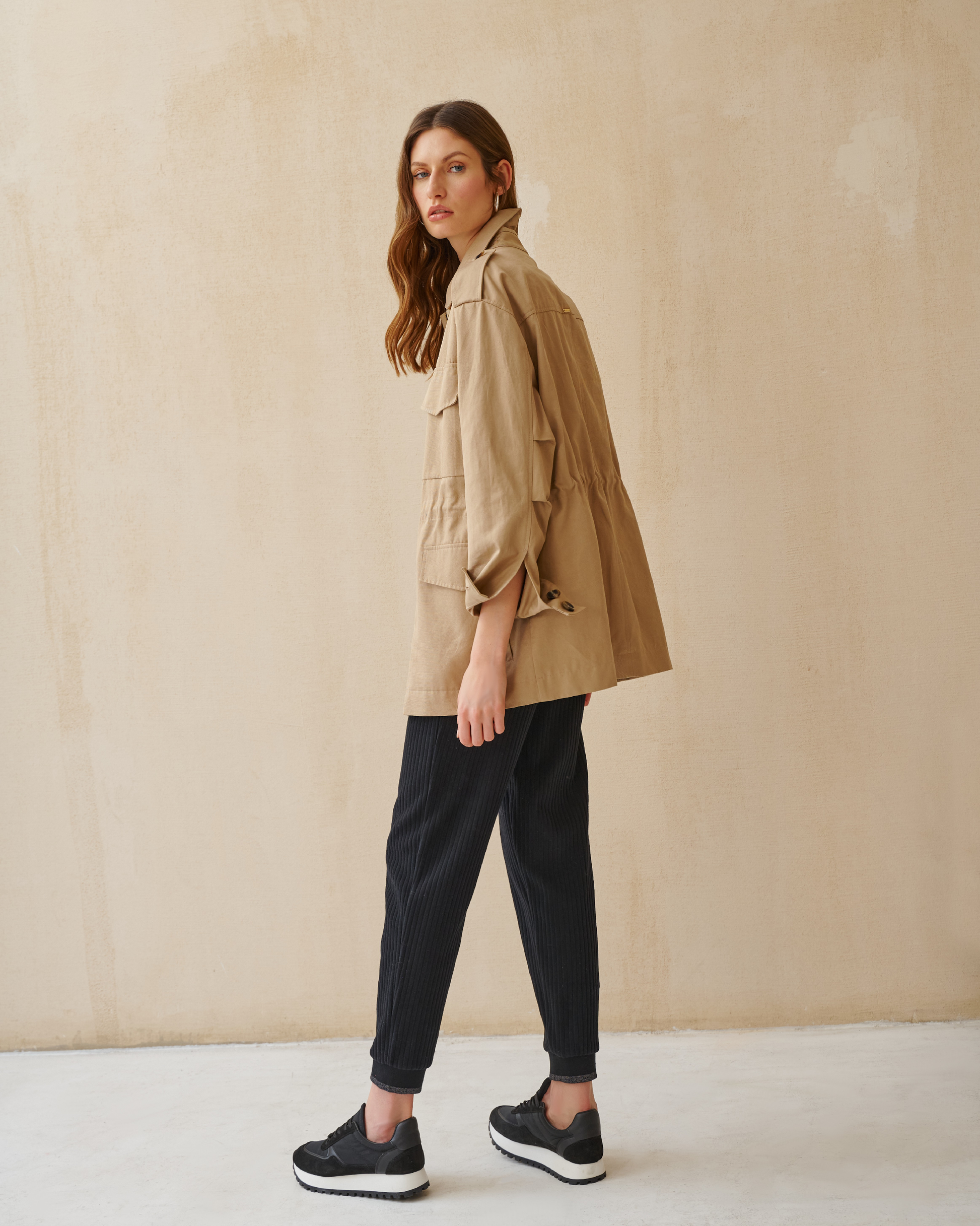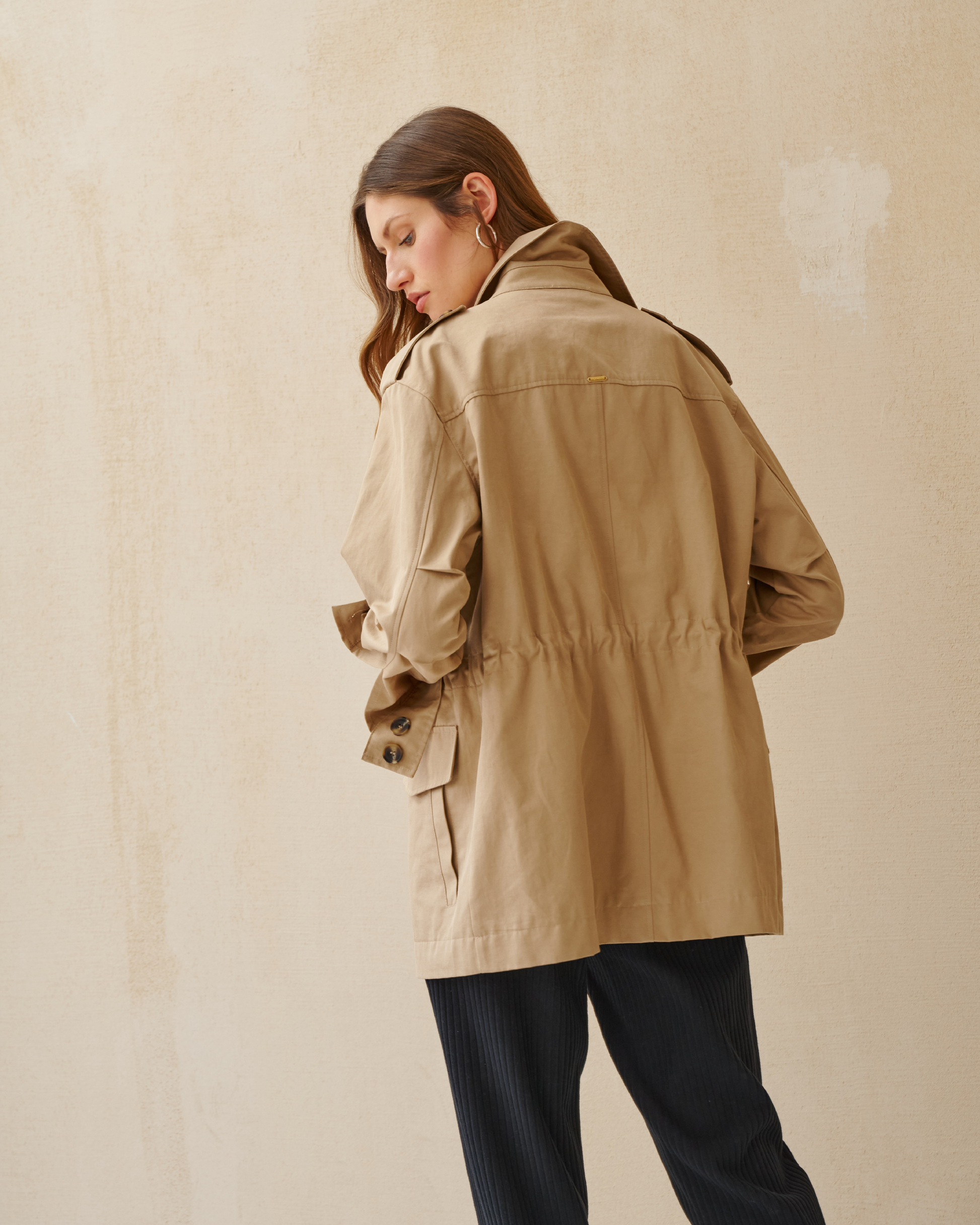 Zapisz się do newslettera i zyskaj 10% rabatu na zakupyKurtka typu safari w kolorze beżowym. Wyposażyliśmy ją w cztery kieszenie oraz patkę ozdobioną guzikami kryjącą suwak. Wewnątrz, na wysokości talii, jest taśma pozwalająca na dopasowanie kurki do sylwetki. Dekolt uzupełnia klasyczny kołnierz, a na ramionach pagony. Długie rękawy wyposażyliśmy o przymarszczenia dodające swobody oraz wykończyliśmy je mankietem.