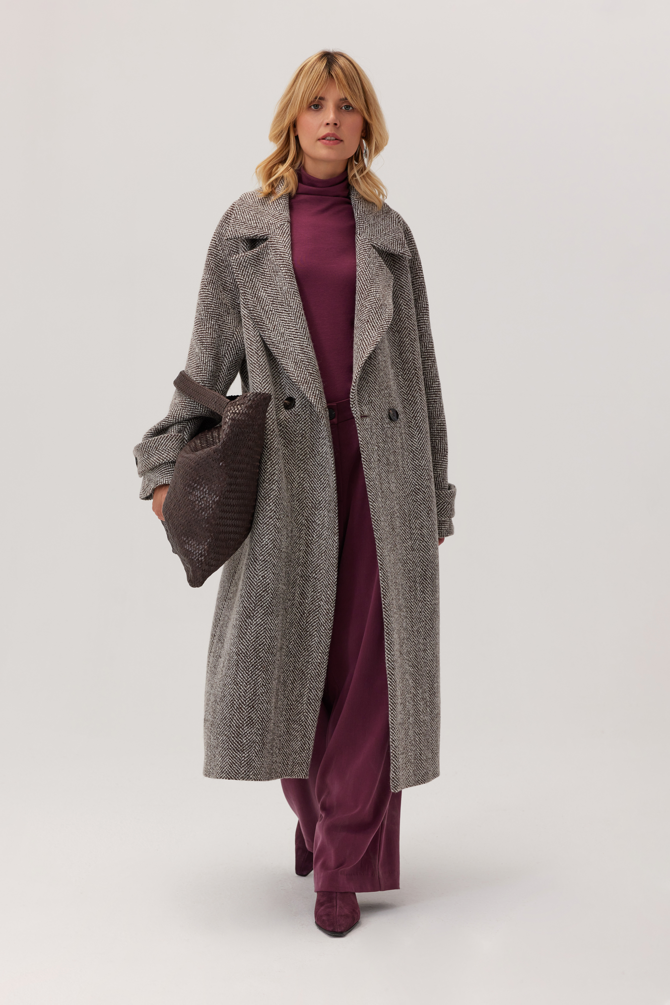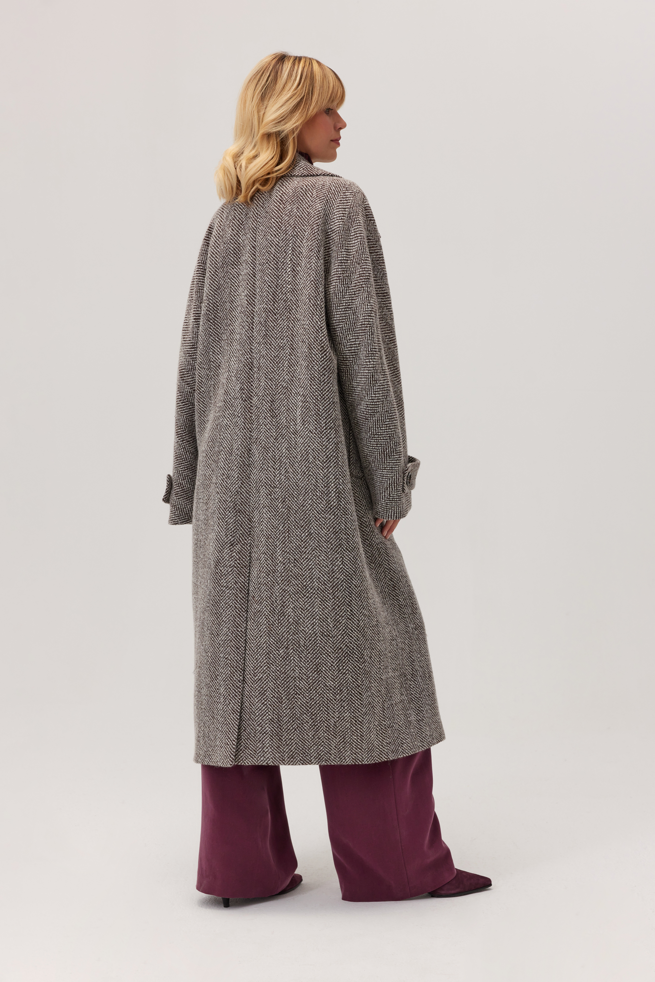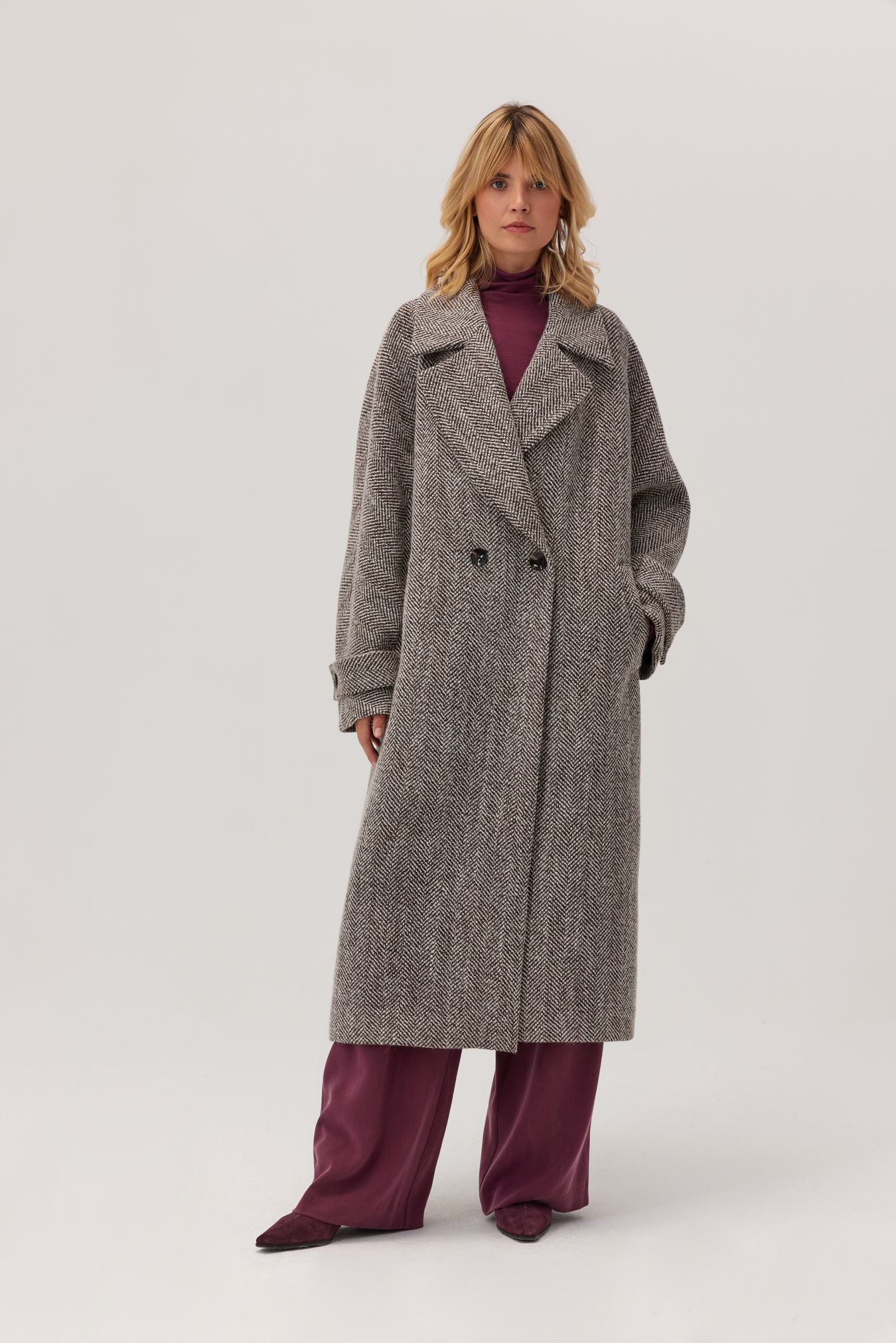 Płaszcz wełniany Arden w jodełkę to długi, ciepły model z szerokimi klapami i dwurzędowym zapięciem. Idealny na jesień i zimę. Klasyczny wzór podkreśla elegancję, a luźny fason wygodnie mieści grubszy sweter i zapewnia swobodę ruchów w codziennym użytkowaniu. Praktyczne kieszenie z listwą, paski przy mankietach i rozporek z tyłu sprawiają, że płaszcz doskonale sprawdza się zarówno do pracy, jak i na wieczorne wyjścia.