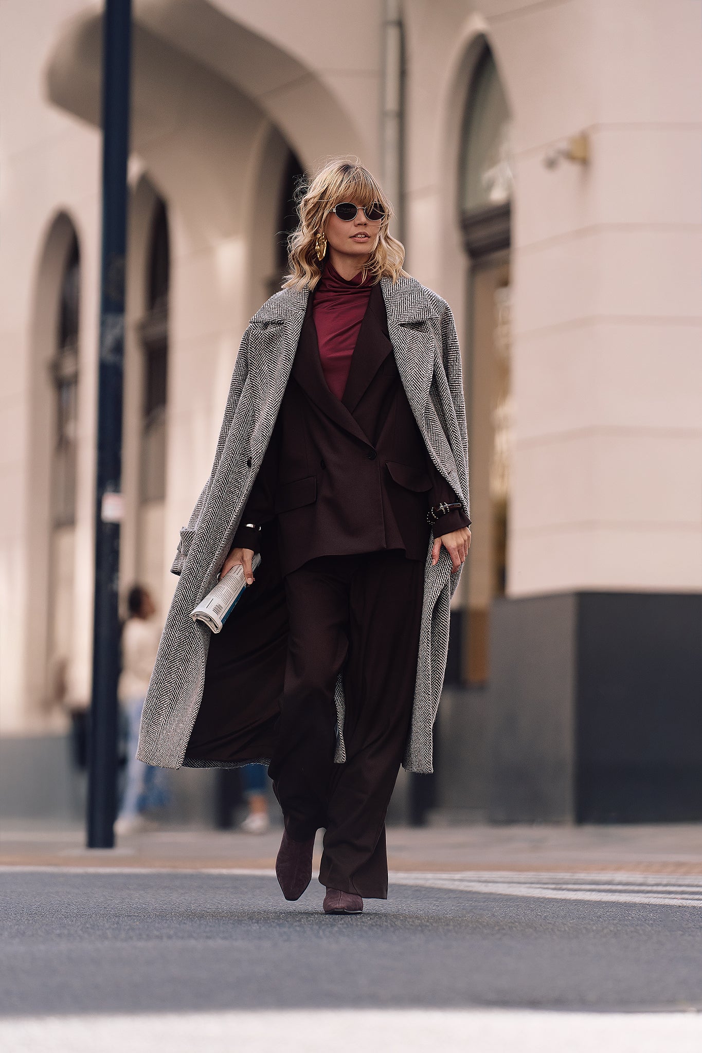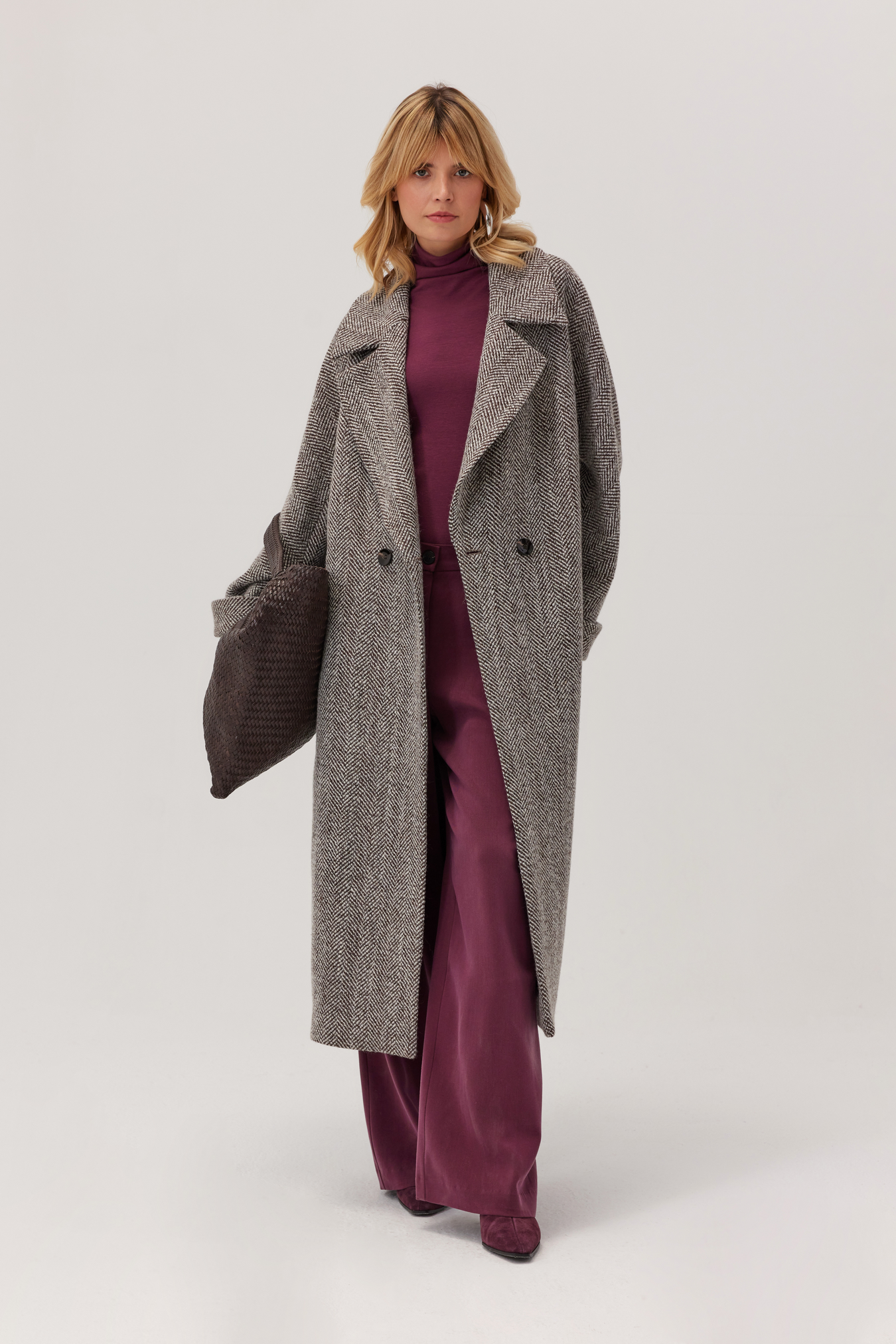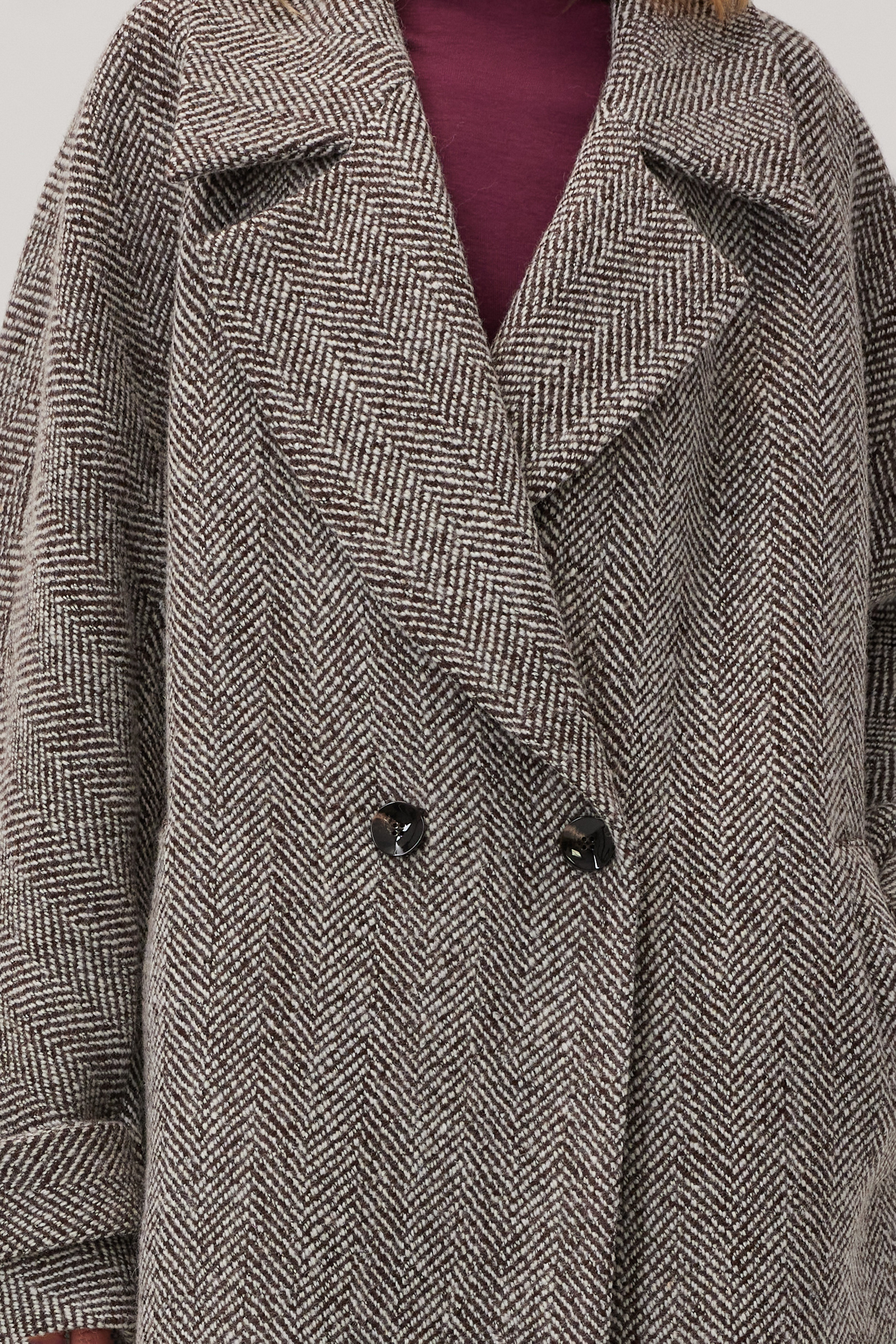 Płaszcz wełniany Arden w jodełkę to długi, ciepły model z szerokimi klapami i dwurzędowym zapięciem. Idealny na jesień i zimę. Klasyczny wzór podkreśla elegancję, a luźny fason wygodnie mieści grubszy sweter i zapewnia swobodę ruchów w codziennym użytkowaniu. Praktyczne kieszenie z listwą, paski przy mankietach i rozporek z tyłu sprawiają, że płaszcz doskonale sprawdza się zarówno do pracy, jak i na wieczorne wyjścia.