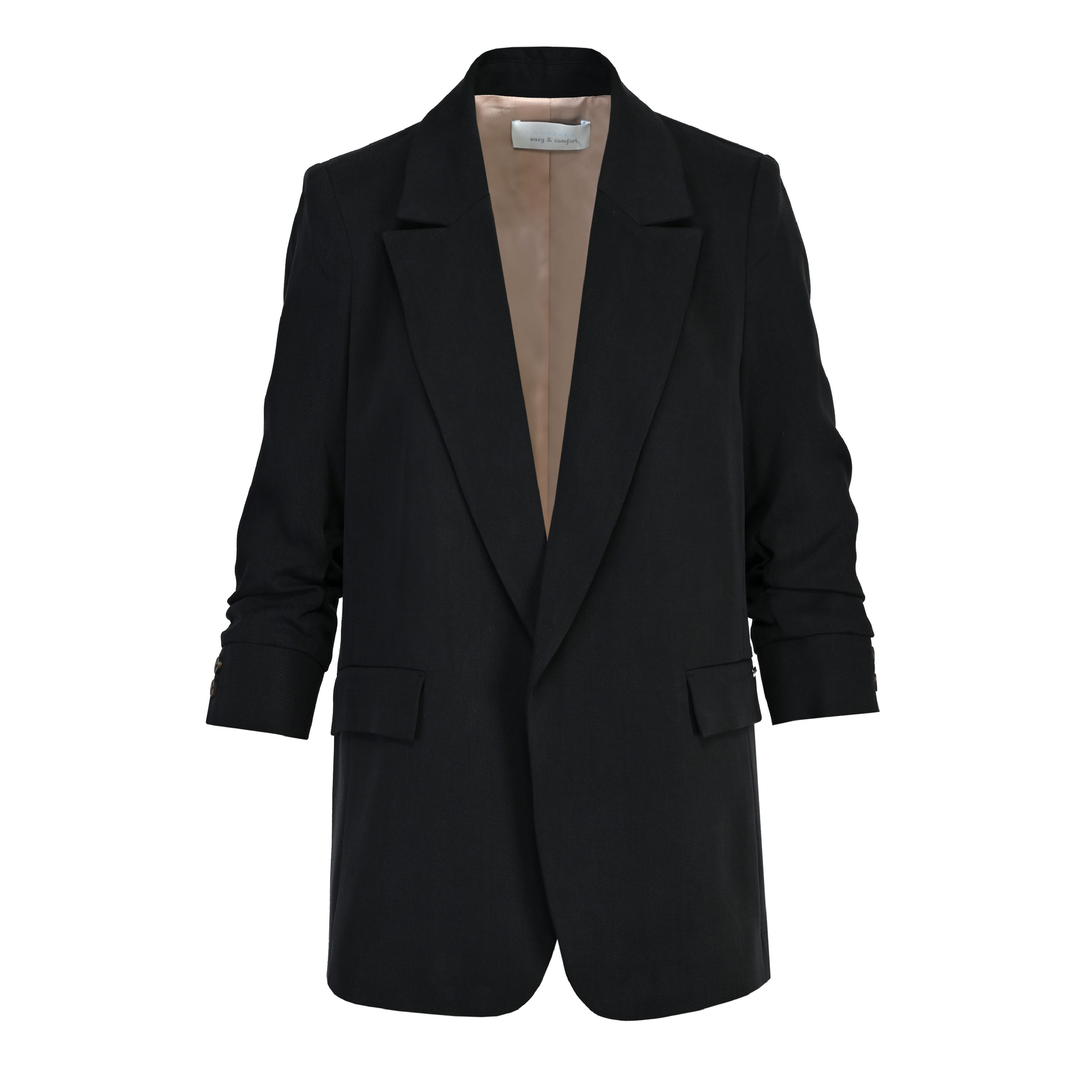 Cechą wyróżniającą tę elegancką marynarkę są ozdobne rękawy w długości 3/4 z ozdobnymi guzikami. Połącz tę elegancką czarną marynarkę z dopasowanymi spodniami lub ołówkową spódnicą, aby uzyskać bardziej biurowy wygląd, lub załóż ją na elegancką sukienkę, aby stworzyć wyrafinowany, wieczorowy zestaw. Wzbogać swoją garderobę żakietem Bler i rób piorunujące wrażenie przy każdym jego założeniu.