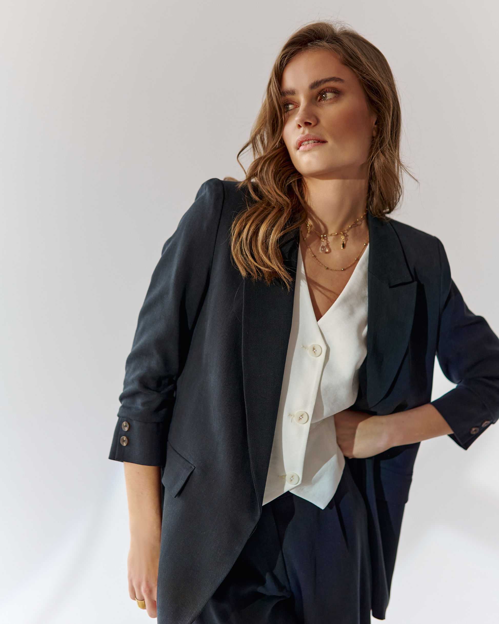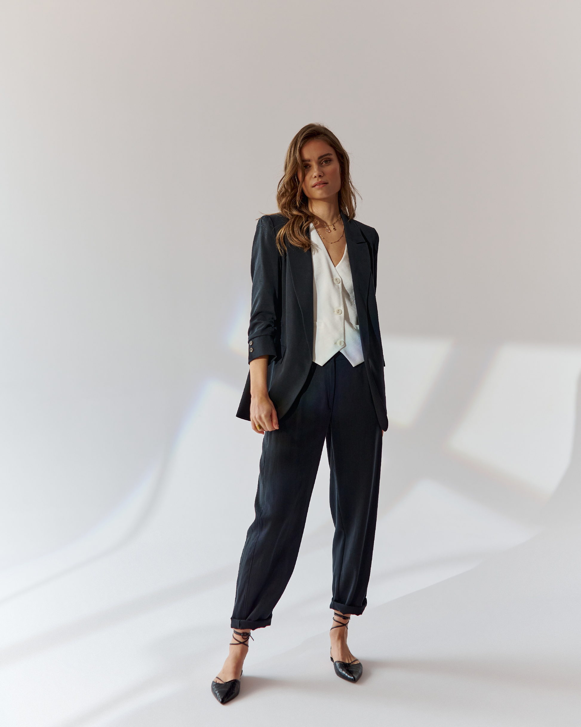Zapisz się do newslettera i zyskaj 10% rabatu na zakupyPrzedstawiamy naszą czarną marynarkę Bler z lyocellu — wyrafinowany model, który płynnie łączy w sobie styl, wygodę i odrobinę elegancji. Model ten, wykonany z luksusowego materiału, jest nie tylko miękki w dotyku, ale także przyjemny dla ciała. Lyocell znany jest ze swojej wysokiej oddychalności, dlatego też zapewni komfort w wiosenne i letnie dni.