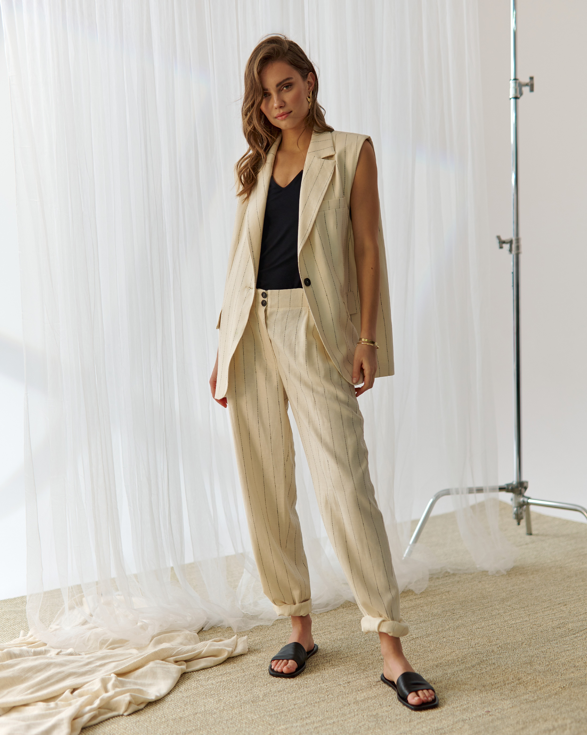 - Fason: Luźna kamizelka żakietowa — modny krój, który podkreśla luz i wygodę.
